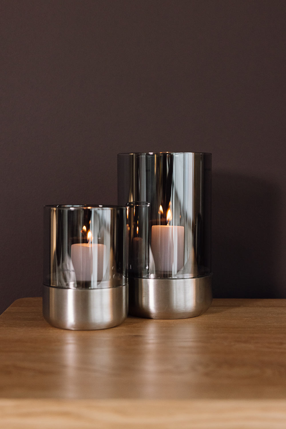 Stylish, modern stainless steel & glass candleholders. Crafted from stainless steel with a glass lantern top. The perfect statement piece for your living space, and an ideal partner to any contemporary room scheme. Perfect as a treat for yourself or gift to a friend! Suitable for indoor use only. Ideal for creating a slightly industrial look, or for adding textural interest to a more pared back colour scheme.