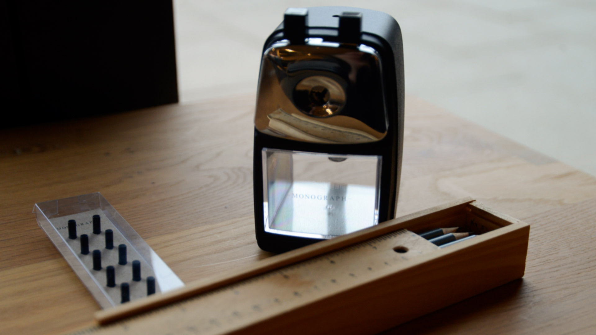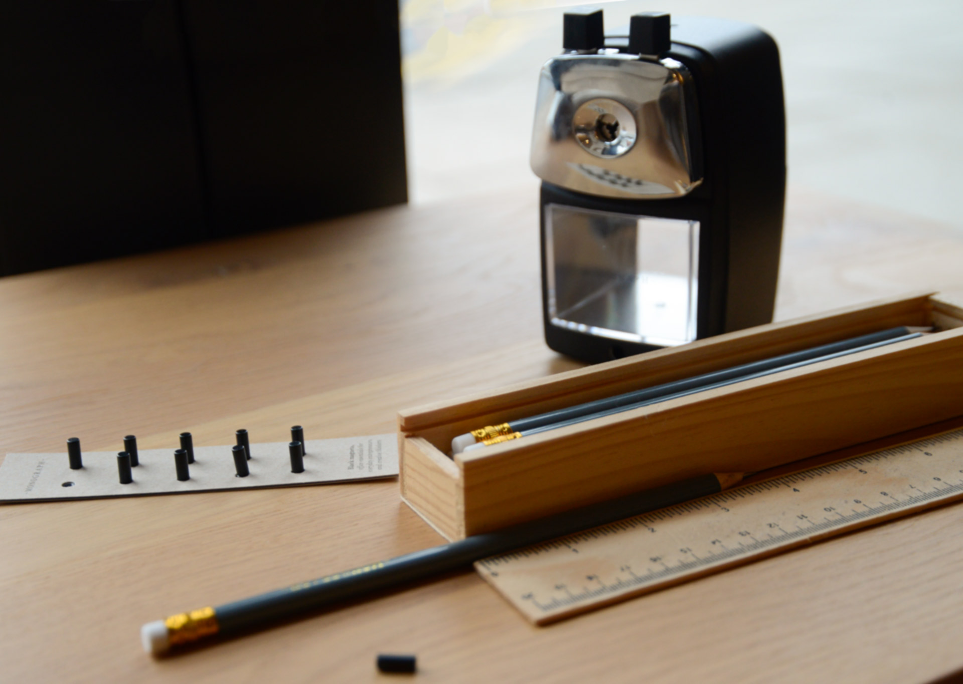 A range of contemporary home office essentials – a modern stationery collection including a desk-top pencil sharpener, a set of pencils in a small wooden box with integrated ruler, and a set of minimalist magnets in black.