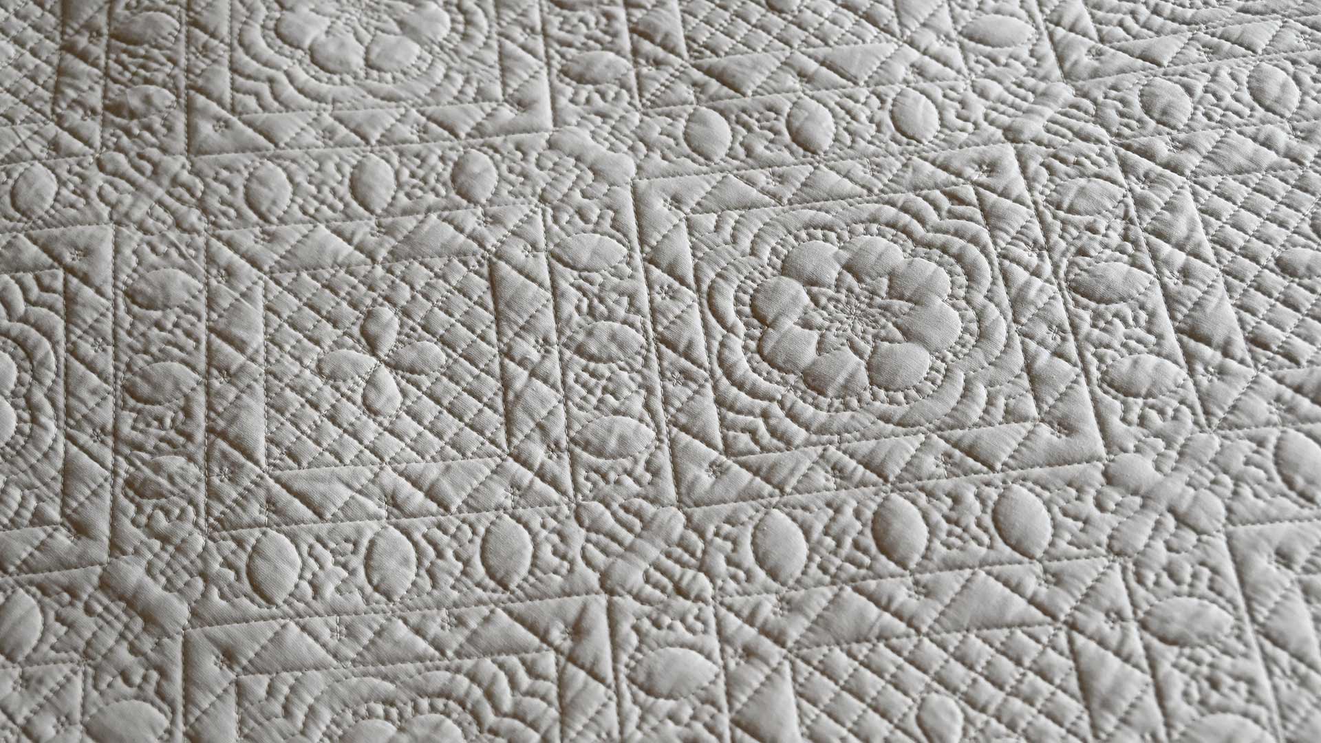 A classic, stylish bedspread set including two matching pillowcases. Both feature an embroidered tile pattern with floral details, in a light pale stone colour. A generous size, this bedspread is ideal for king or superking size beds.