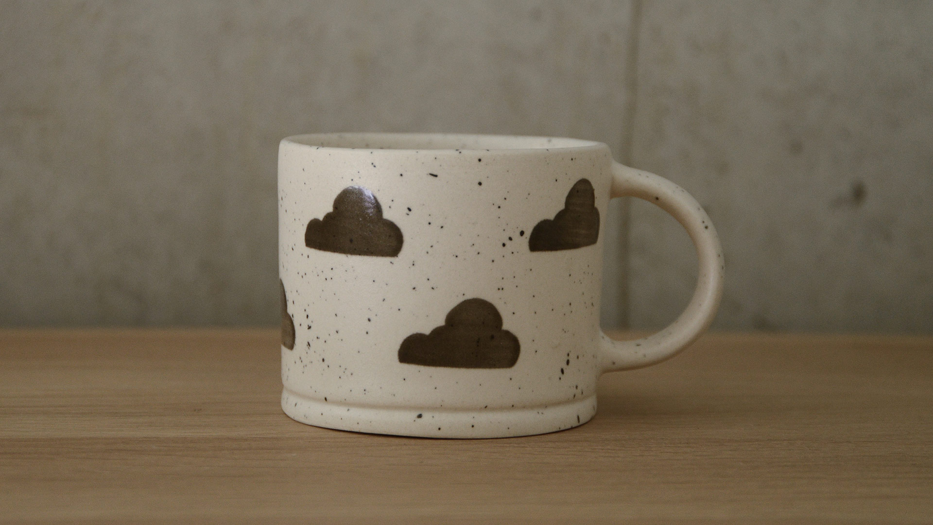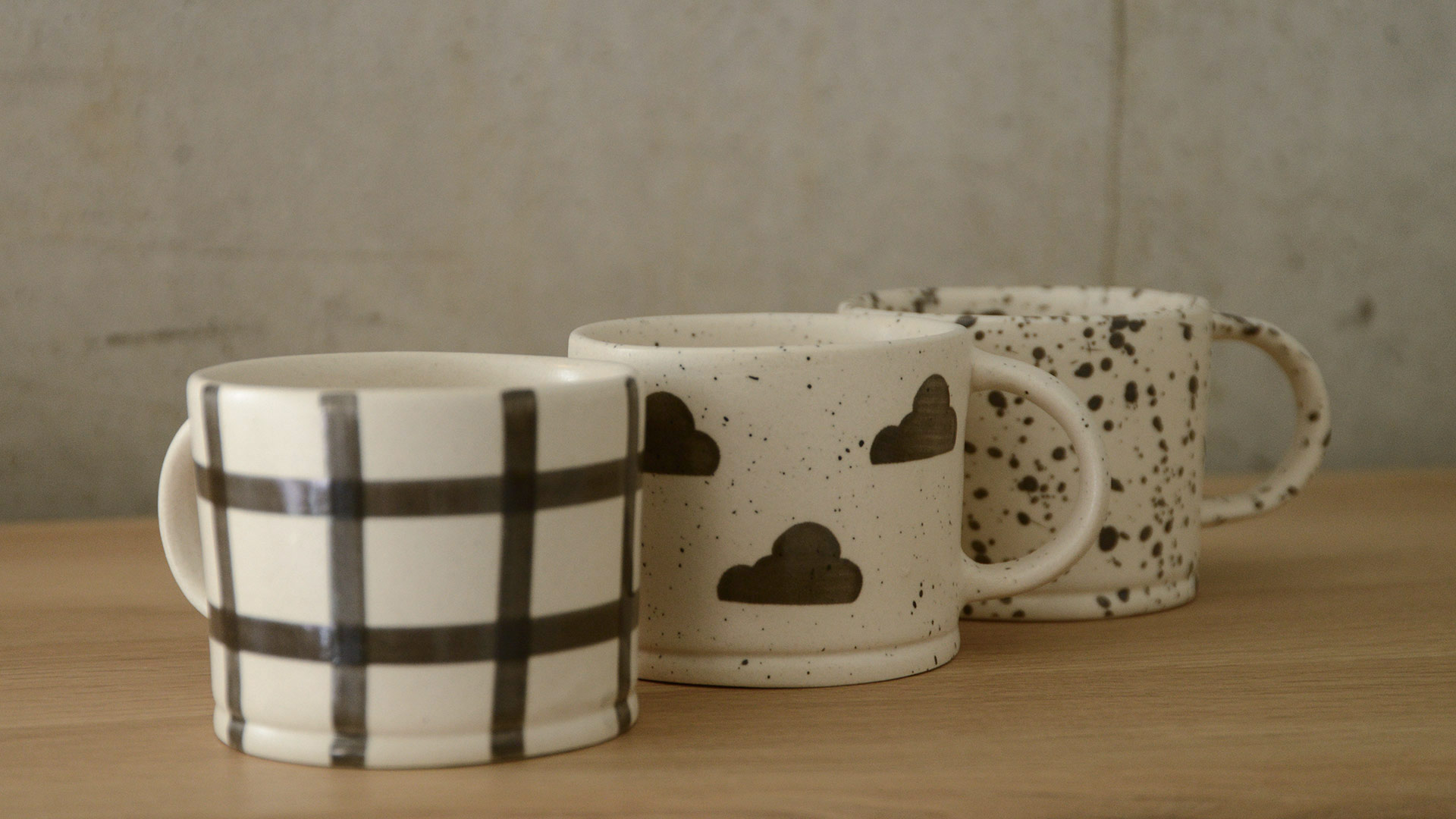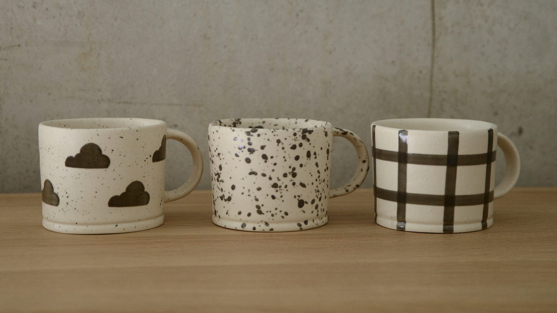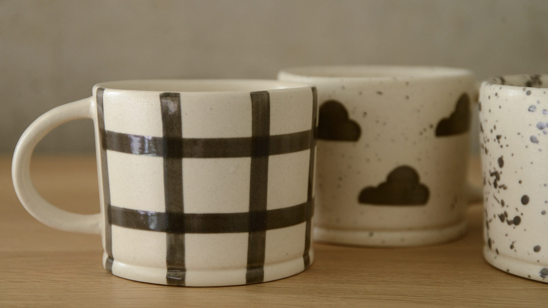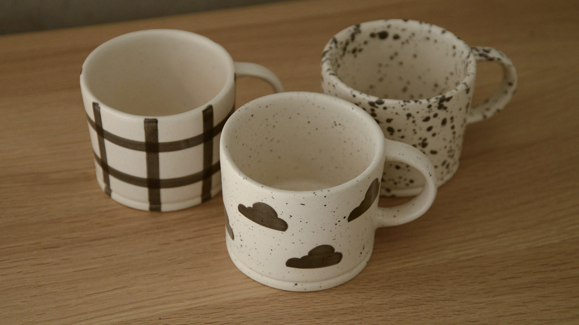 Gingham: a hand-painted grid design with broad strokes Clouds: a speckled finish overall, dotted with hand-painted rainclouds Ink Splash: a larger scale splattered paint finish