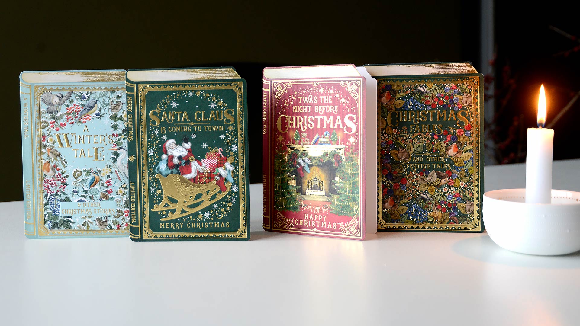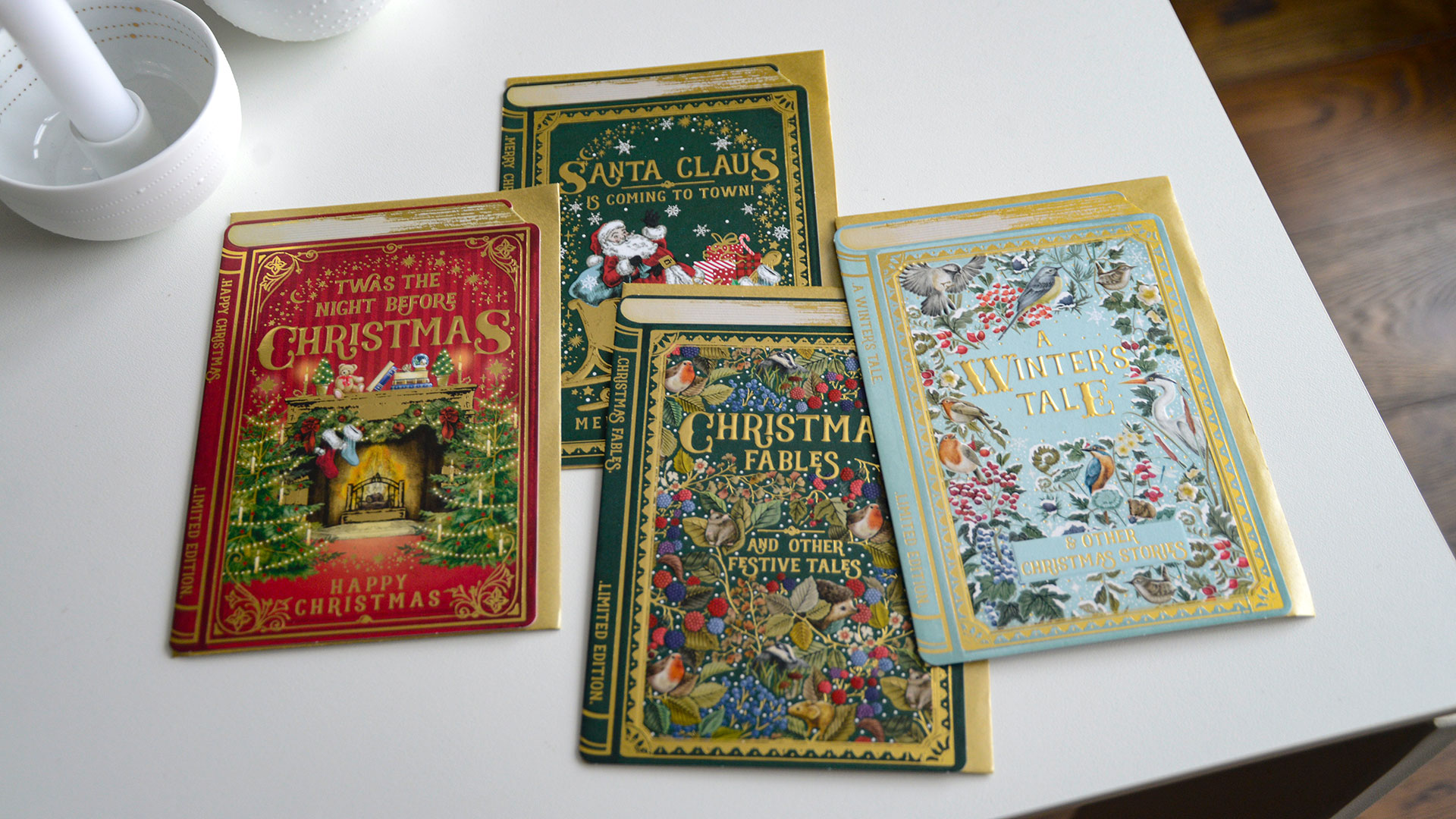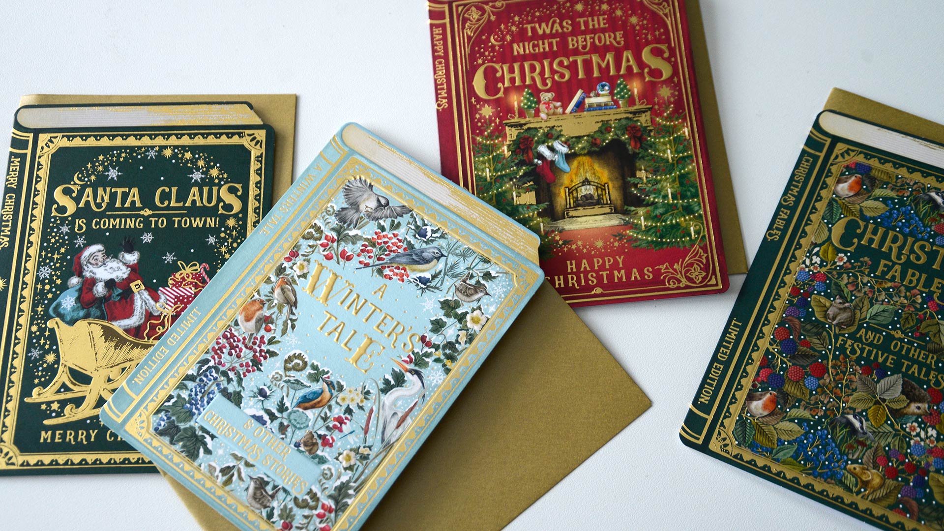 These Storybook Christmas cards bring a touch of whimsy to the holidays! Each embossed card has a beautiful gold foil and a different storybook style illustration; Christmas Fables, A Winter’s Tale, The Night Before Christmas and Santa Claus is Coming to Town.