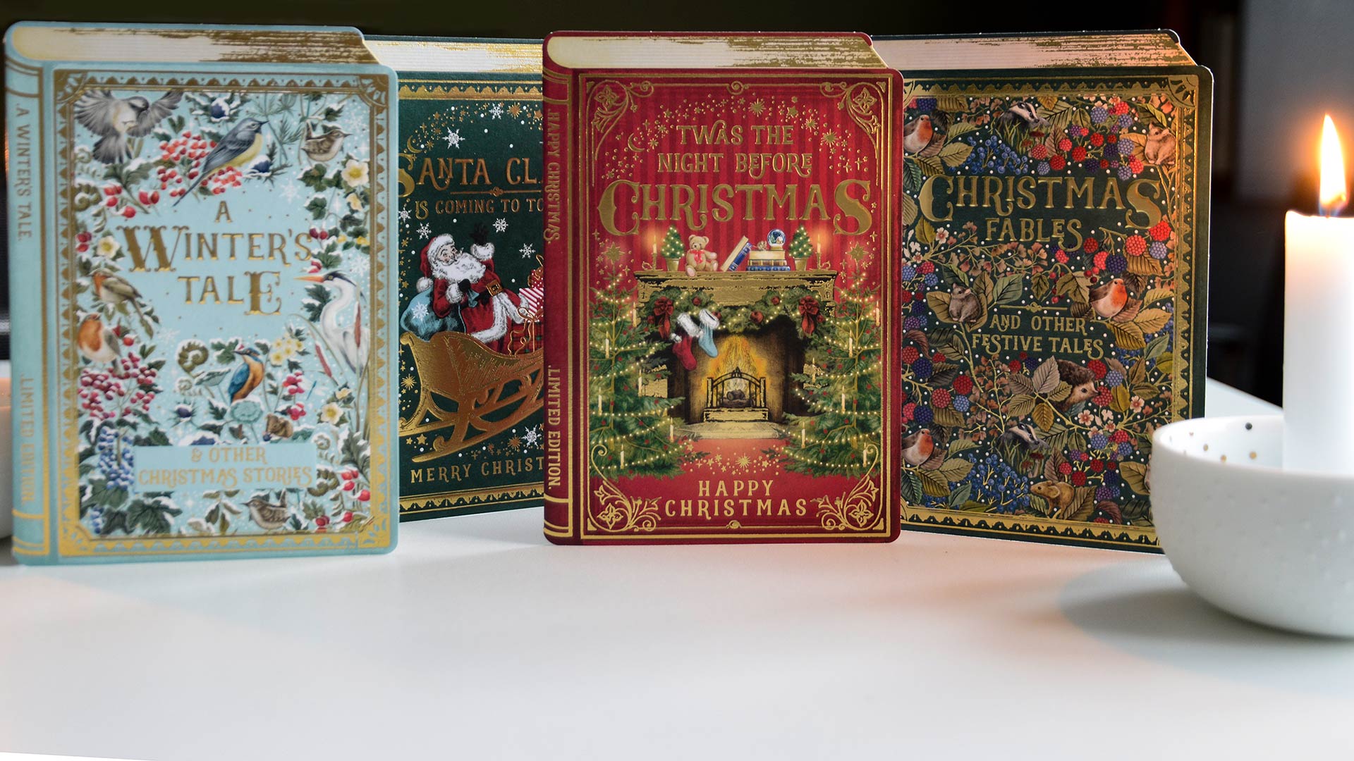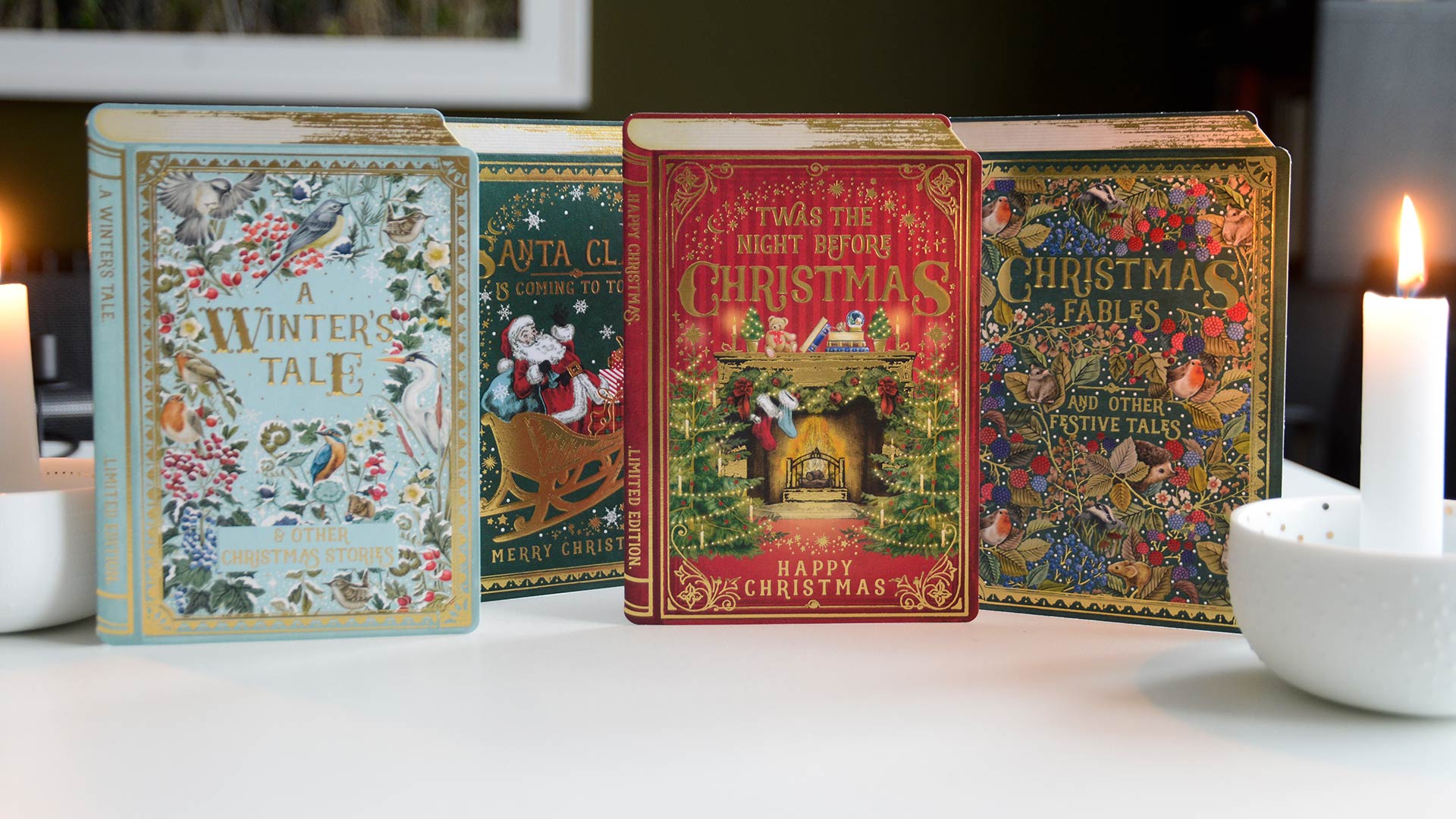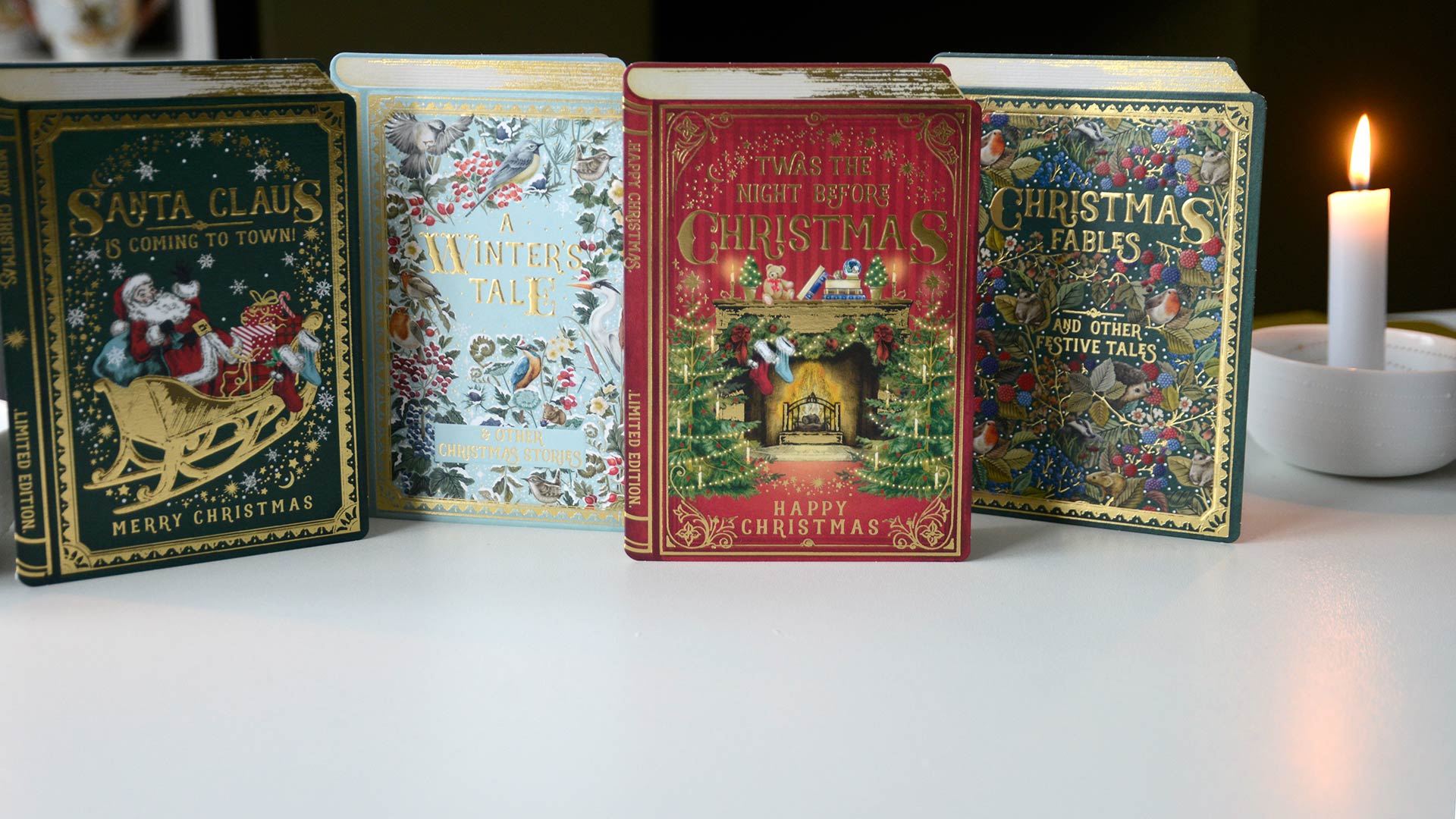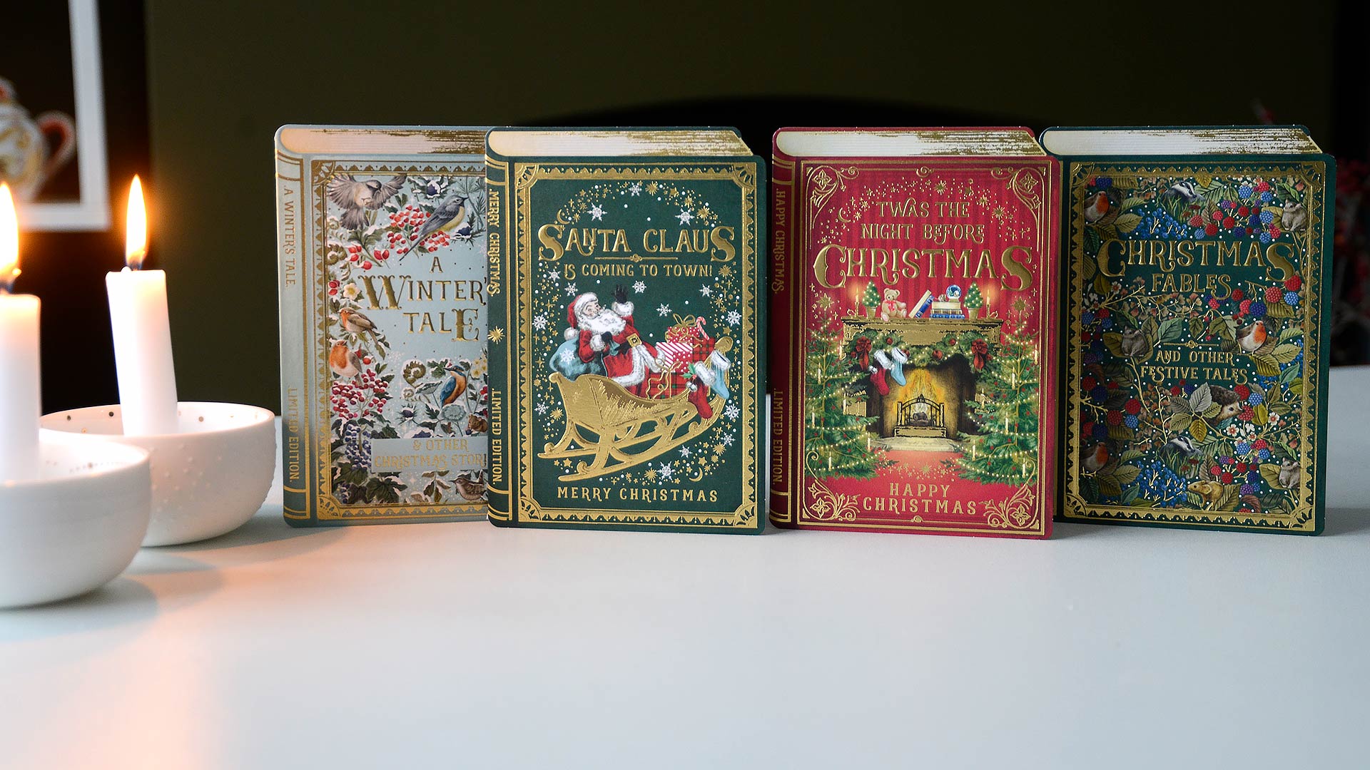 These Storybook Christmas cards bring a touch of whimsy to the holidays! Each embossed card has a beautiful gold foil and a different storybook style illustration; Christmas Fables, A Winter’s Tale, The Night Before Christmas and Santa Claus is Coming to Town.