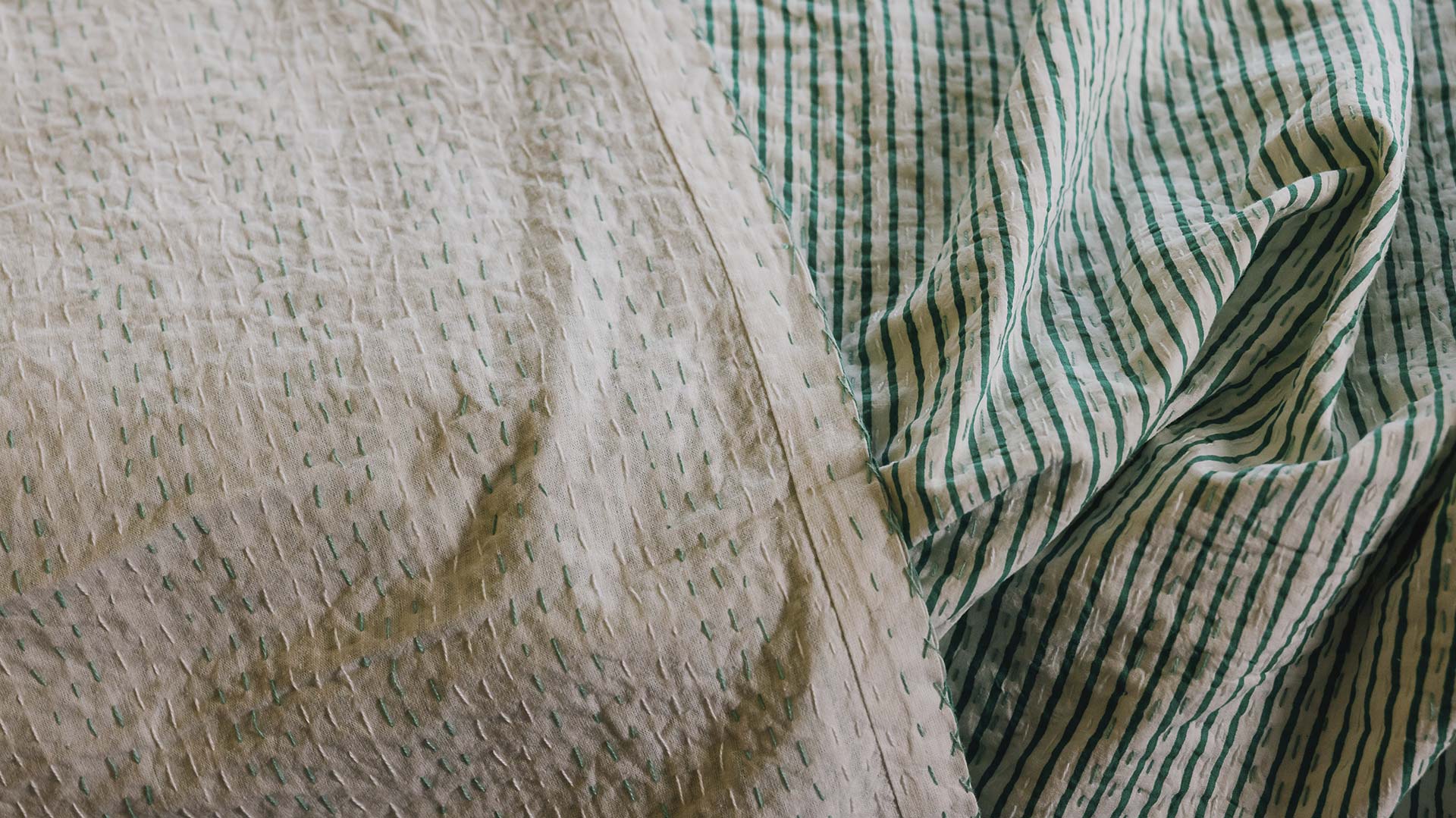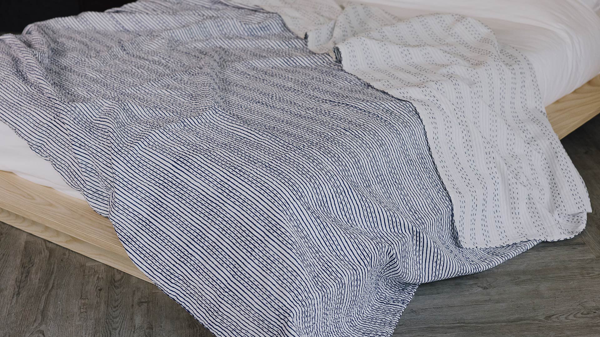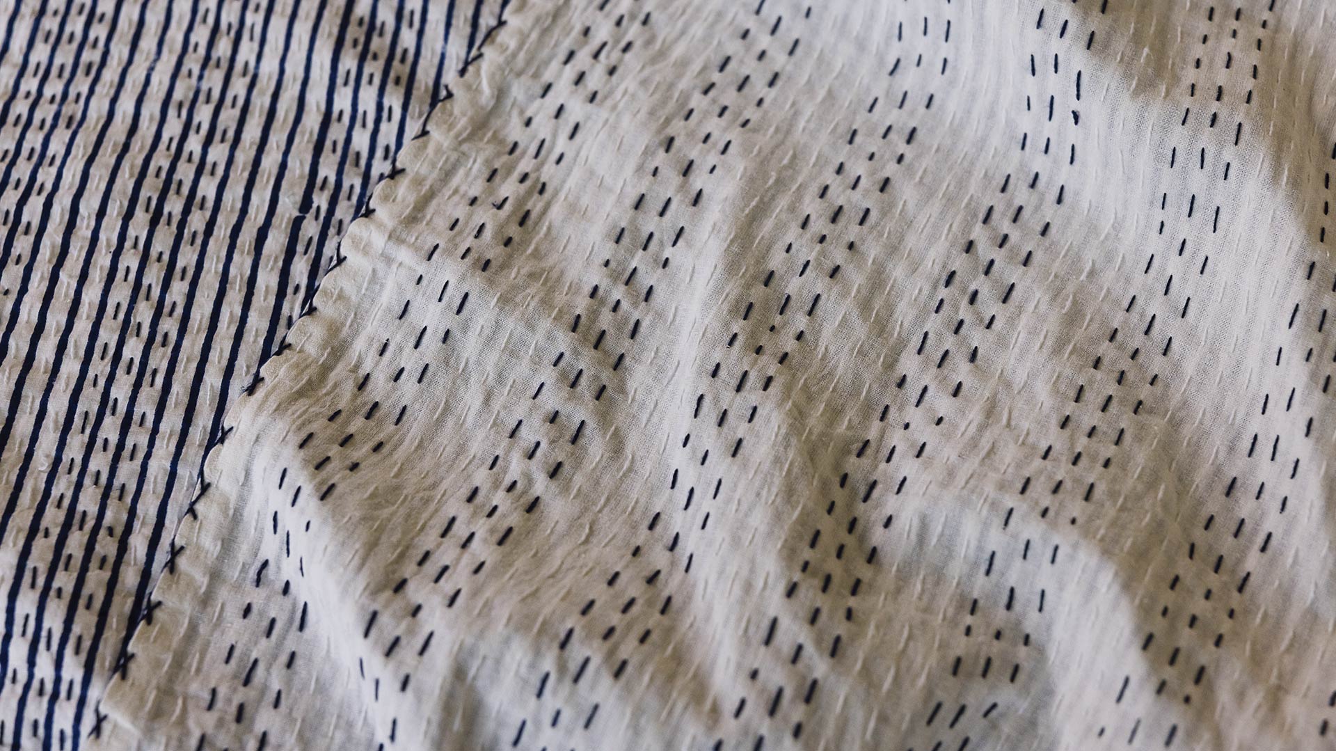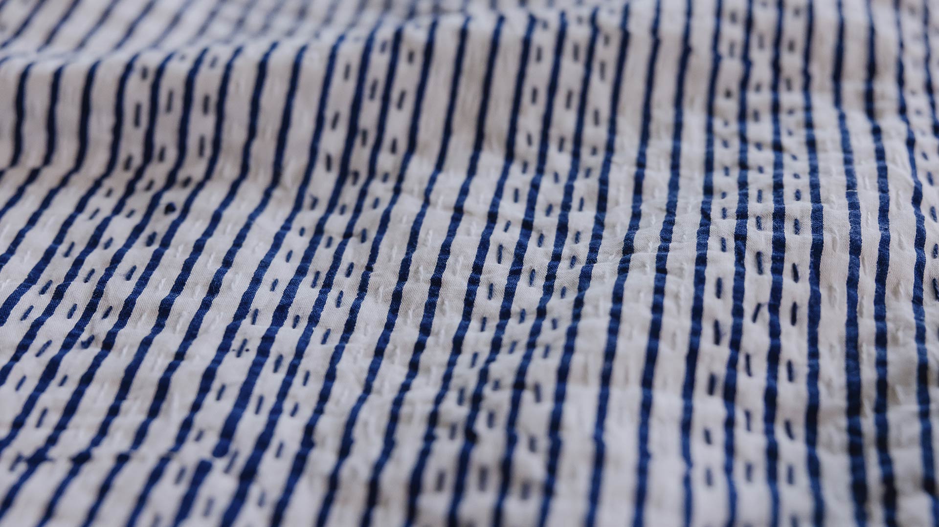 These block print stitched cotton bedspreads are printed by hand using traditional techniques in India. Finished with kantha-style stitching, they boast a bold, bright stripe and dash pattern.