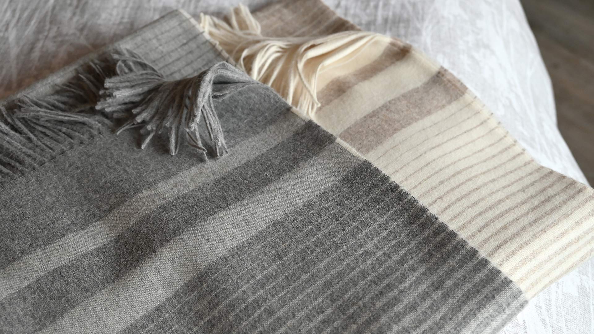 Cool Grey: thicker lines of a grey blending softly with smaller mottled ivory-grey lines. Finished with a grey fringe at two ends. Cappuccino:Â thicker lines of a creamy ivory shade, with smaller lines of a light, warm brown. Finished with an ivory fringe at two ends.