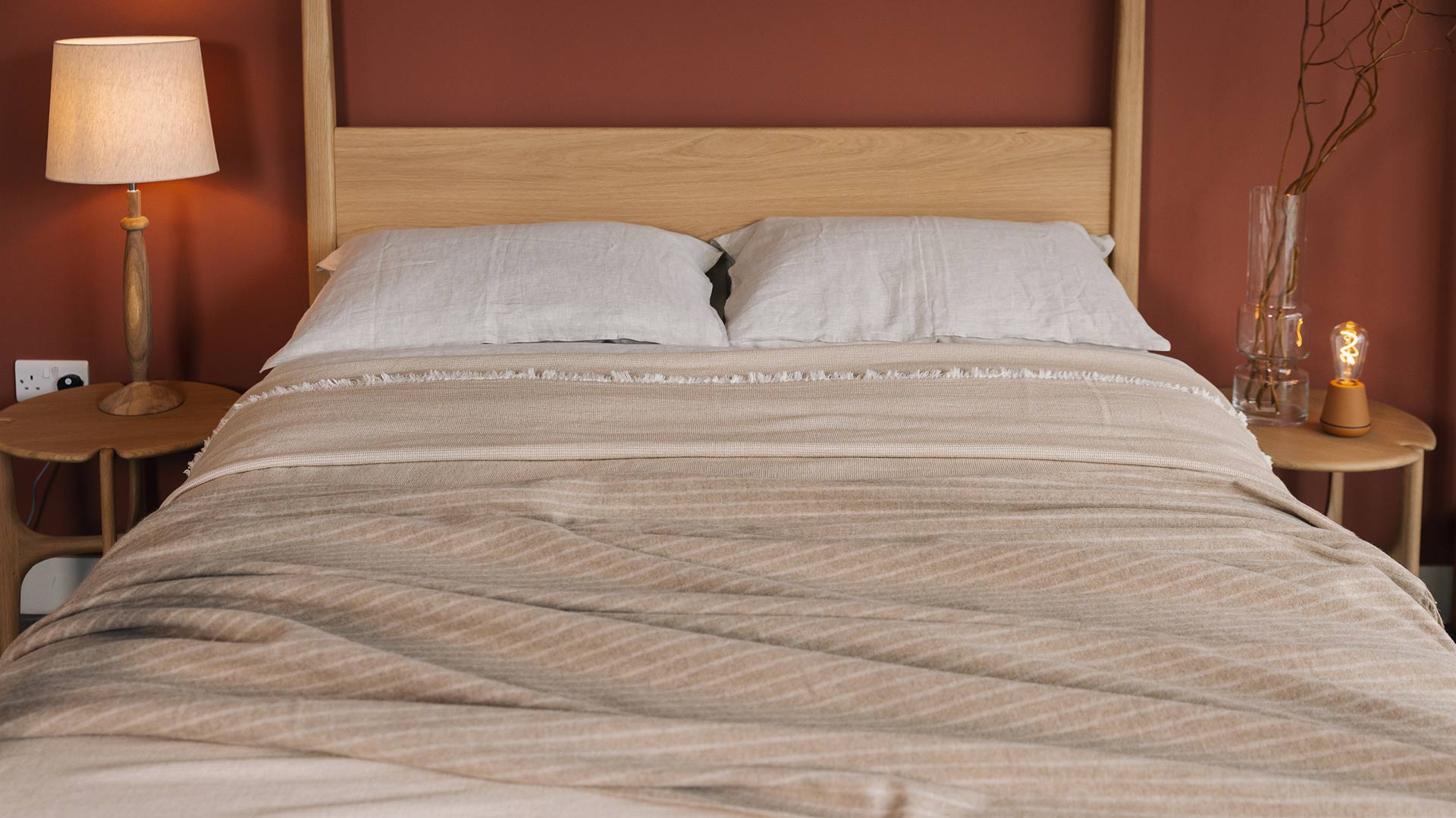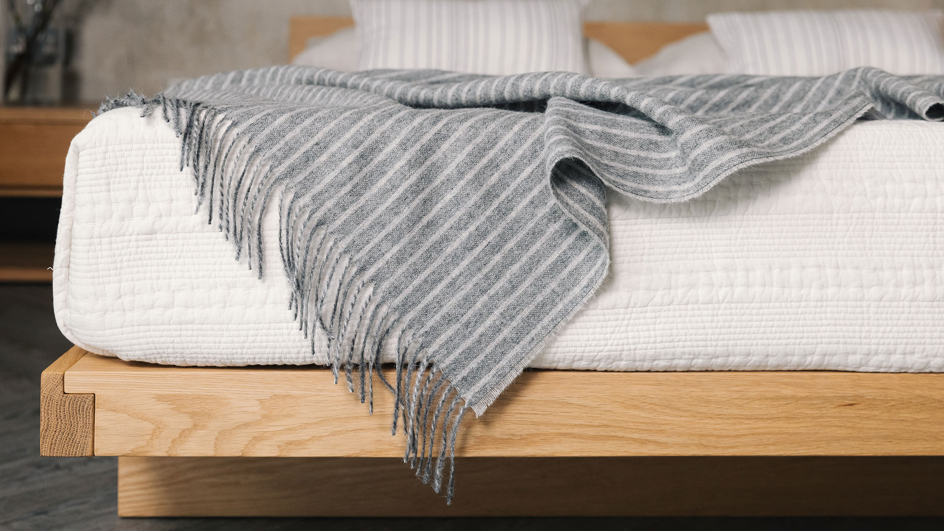 These striped recycled wool throws bring a cosy and natural element to a room. Perfect for draping over bed-ends or sofa arms. Available in grey or camel stripe.