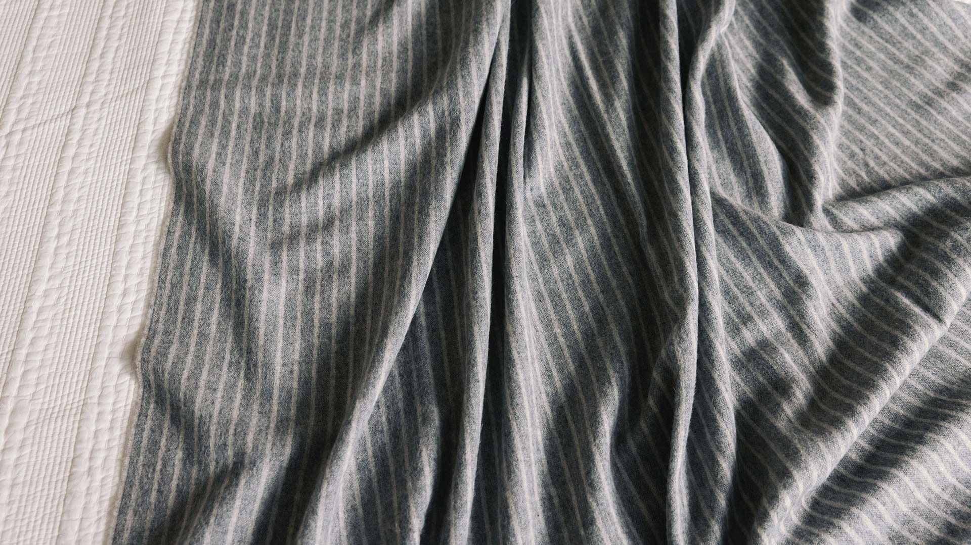Luxuriously soft recycled wool throws with an easy, relaxed look, featuring a classic stripe design. Both contemporary and timeless. Made using 40% recycled sheep wool and 50% recycled alpaca wool.