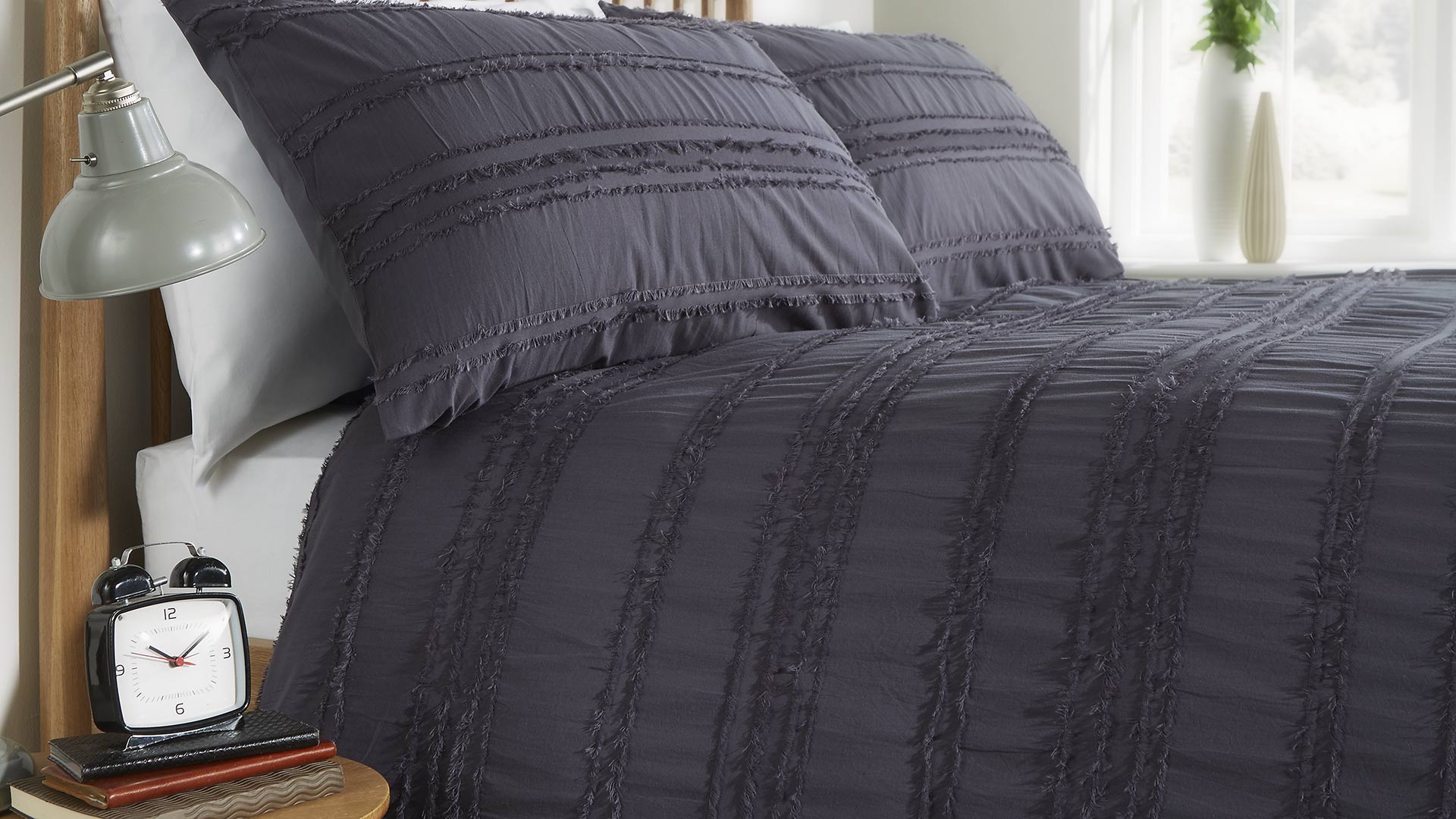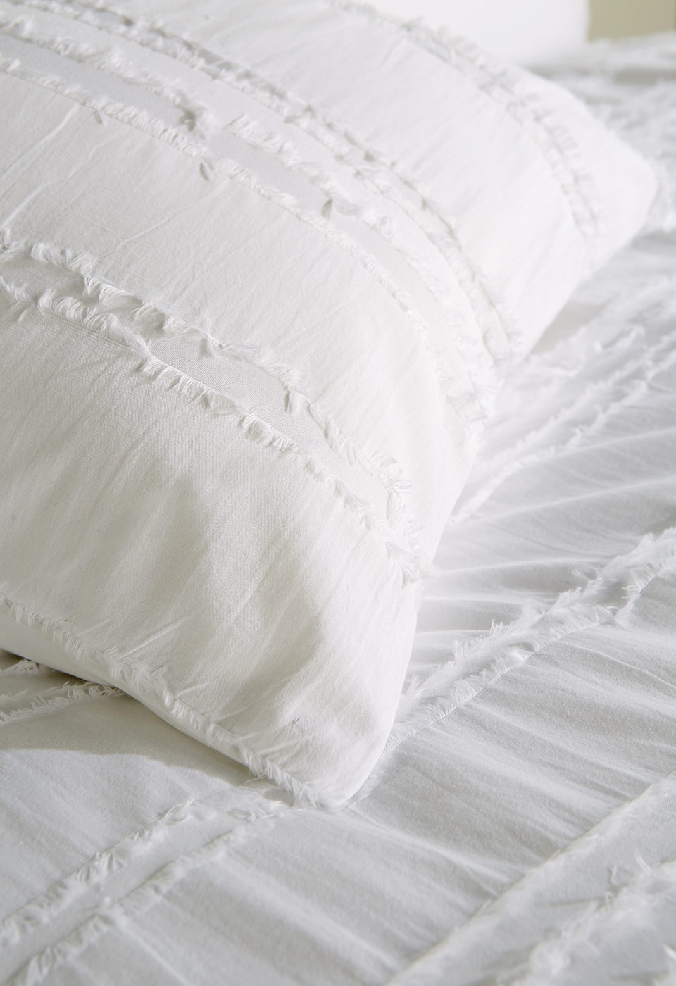 The Studio Cotton Bedding Collection is made up of duvet sets (a duvet cover with two housewife pillowcases) in three sizes and two colour options. The duvet covers and pillowcases have a plain back, the front has decorative fringed thread detailing across with width. The pure cotton fabric is incredibly soft with a fine 300 thread count.