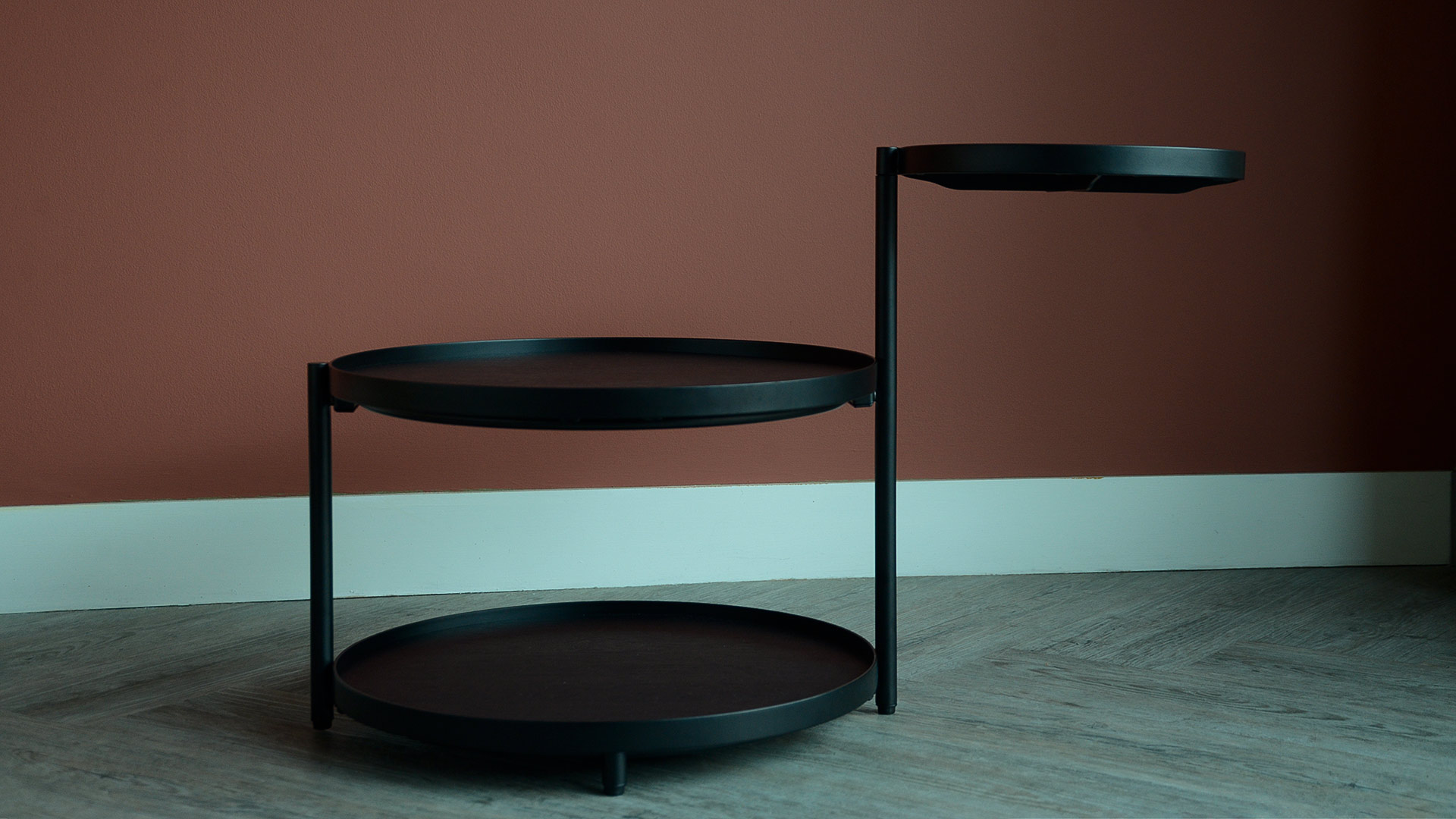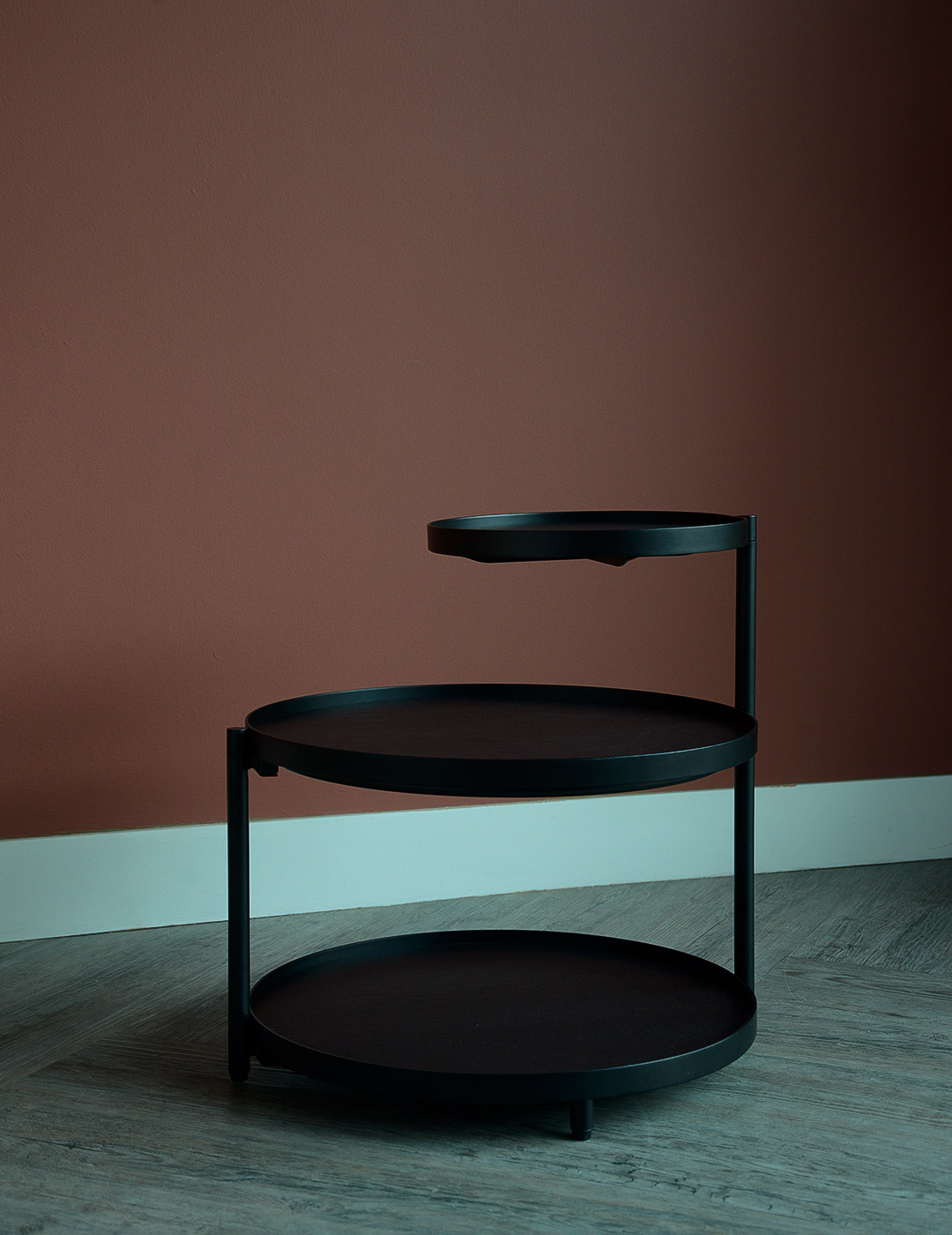 A round, black side table in black stained wood with a black metal frame. The top table can be positioned how you like thanks to its built in swivel function.