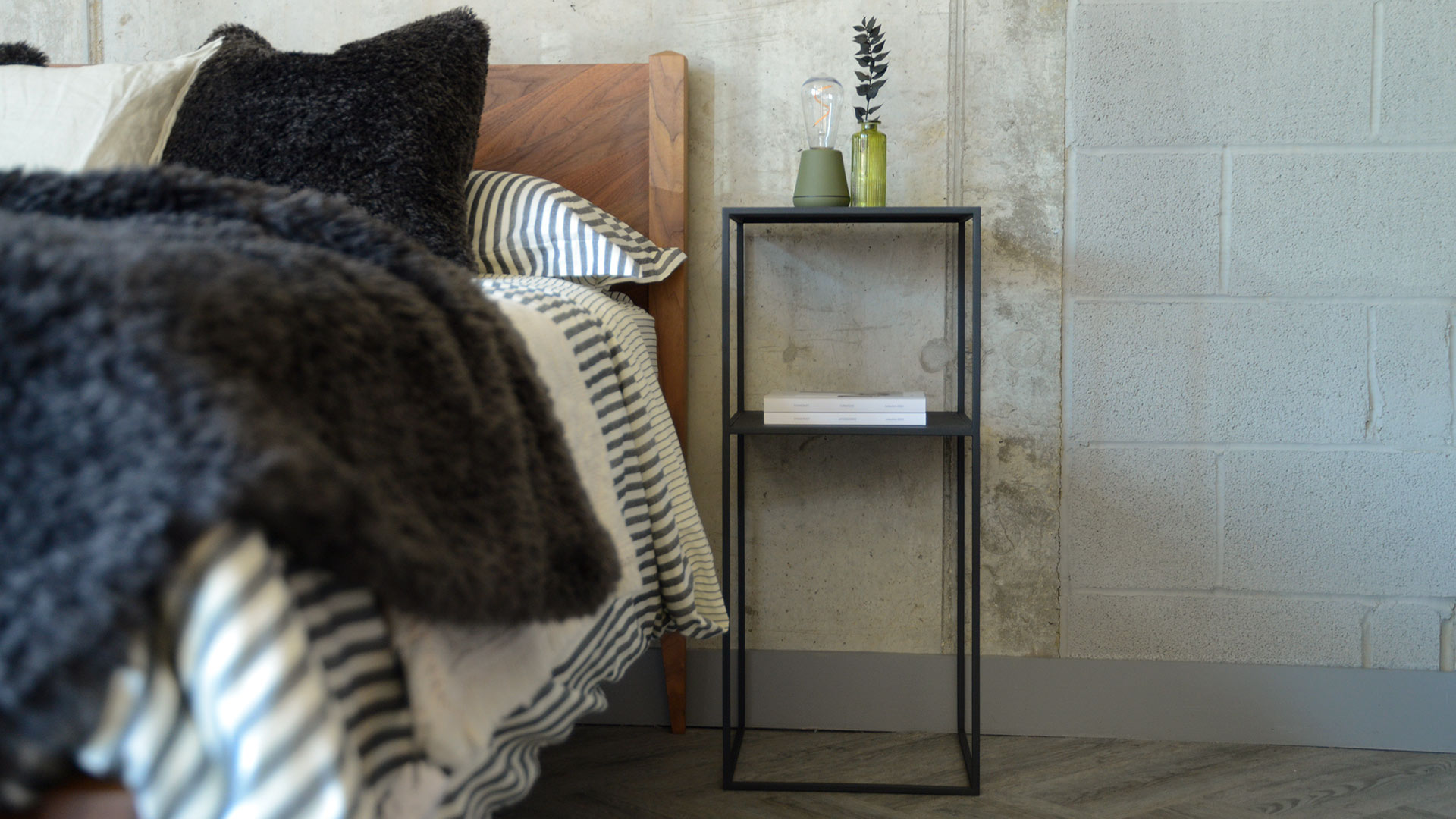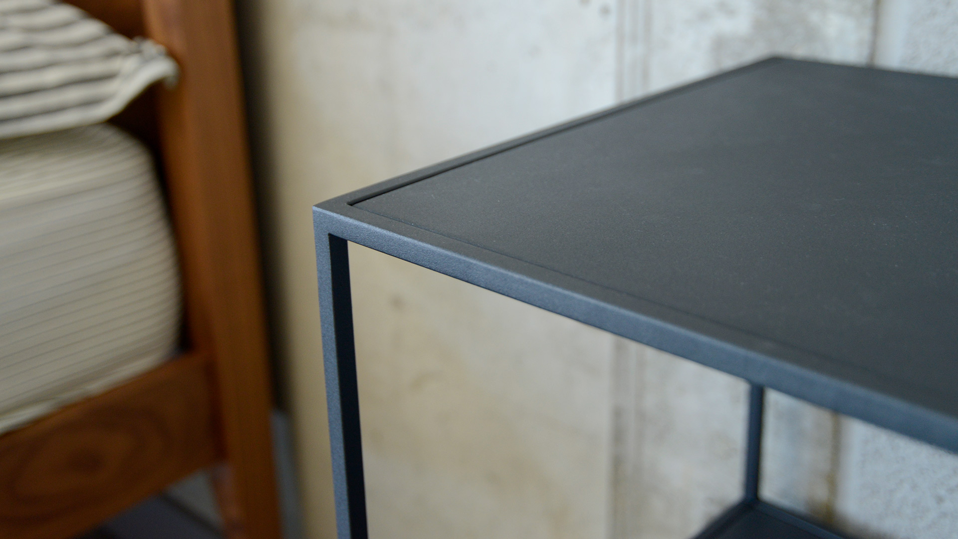 A tall modern side table with a powder-coated finish. A stylish table made of sturdy, powder-coated steel with a matt, slightly roughened finish. Available in slate; a very dark grey, almost black colour.