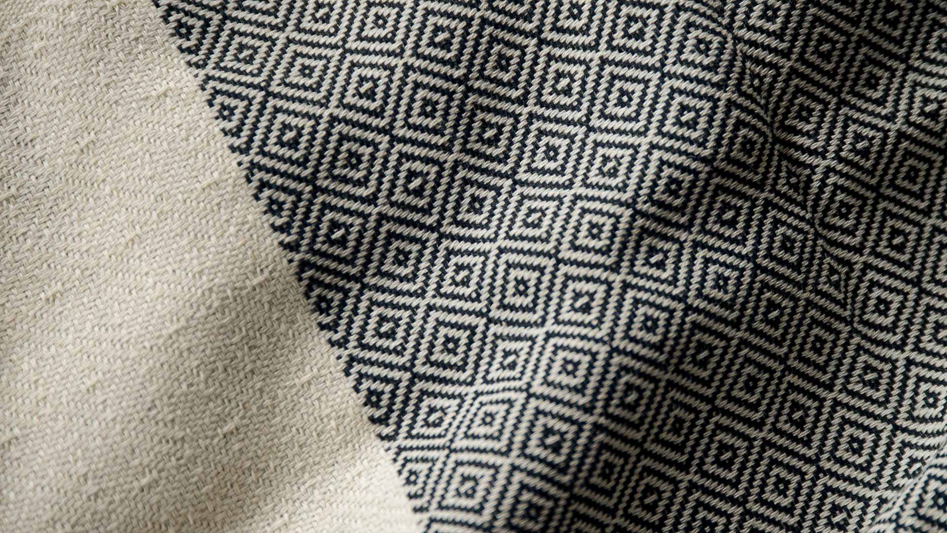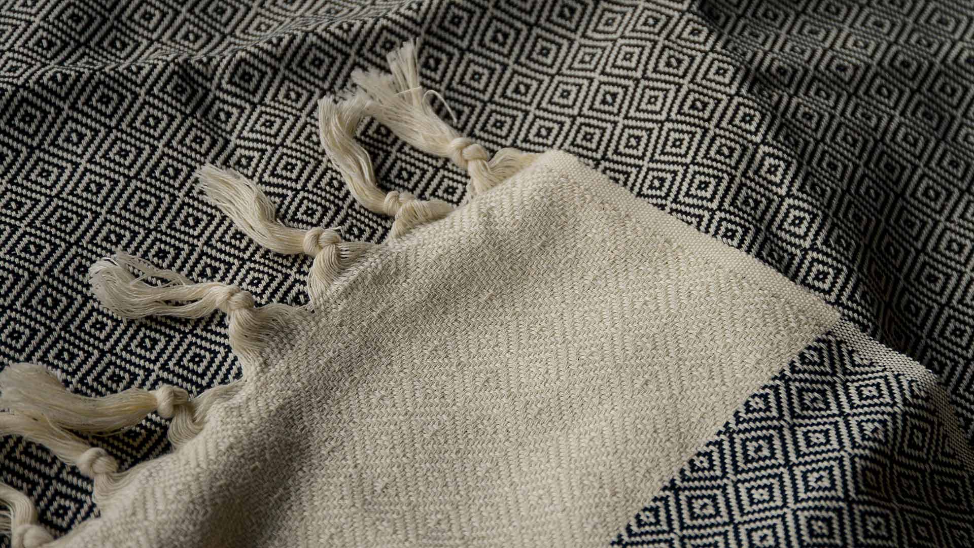 Gorgeously soft and gently textured, these black and white towels are suitable for use as hand, hair or tea towels. Covered in a repeating pattern of monochrome diamonds, bordered on two sides by light cream bands. Traditional tassels also finish off the two cream borders for a boho look.