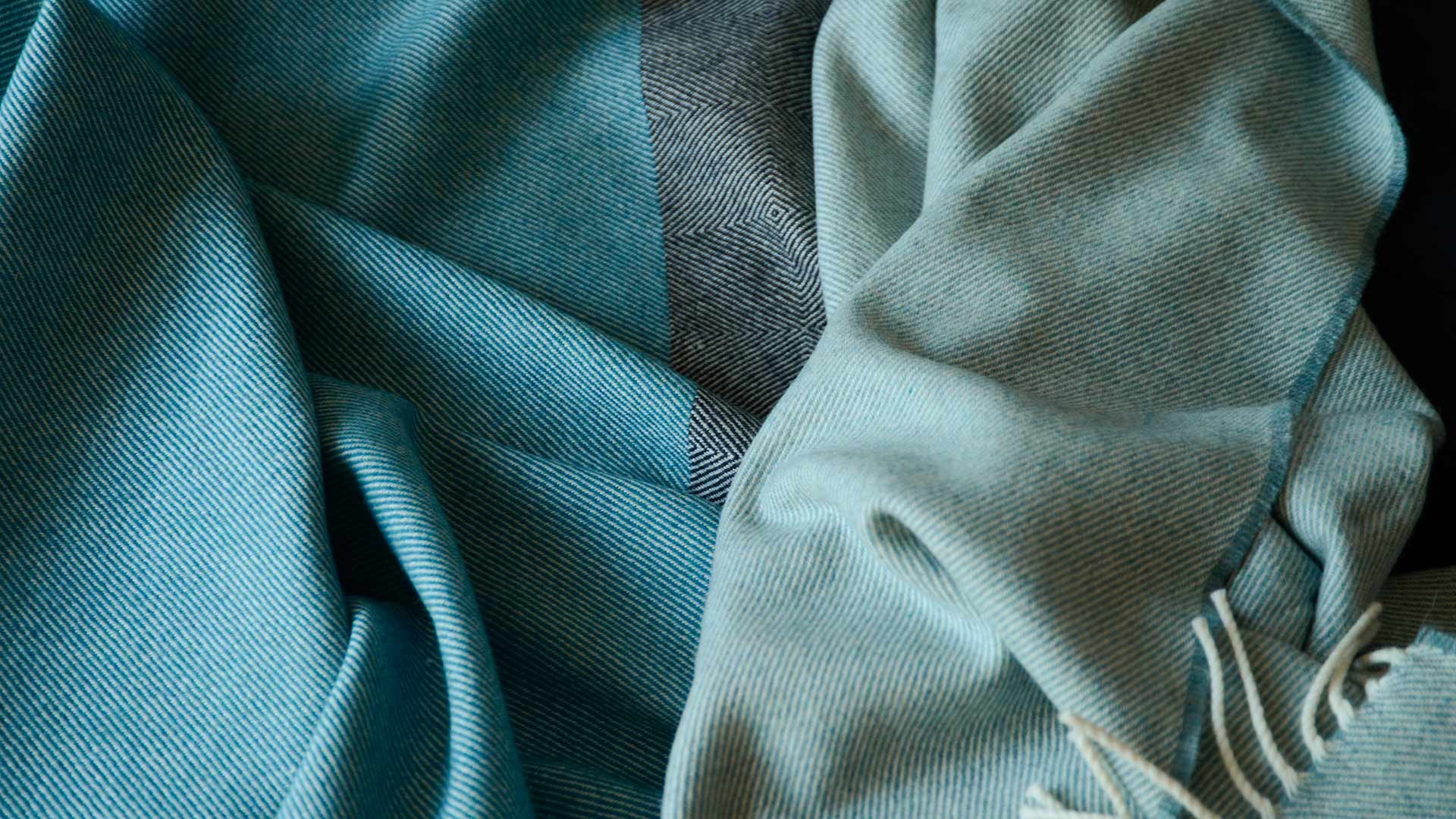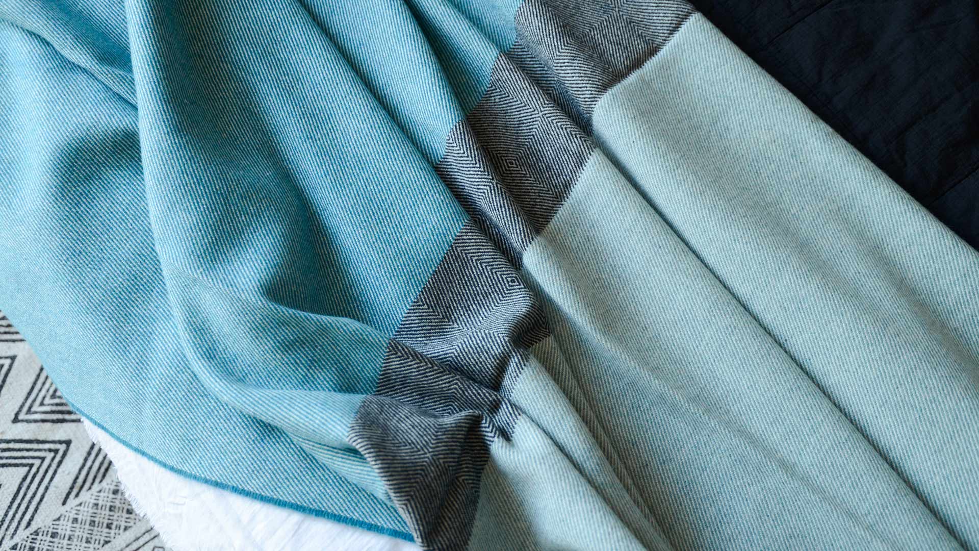 Luxuriously soft, teal & aqua Merino lambswool throw. A modern, colour block throw in deep teal and pale aqua. Finished with a central stripe in charcoal – all blended with ivory. Complete with an ivory fringe to two ends across the width. Ideal for a blue-themed room, or as an accent colour on its own.