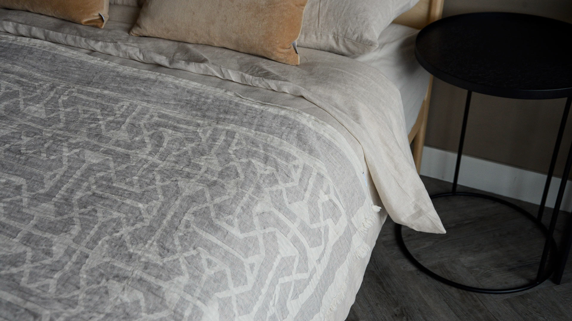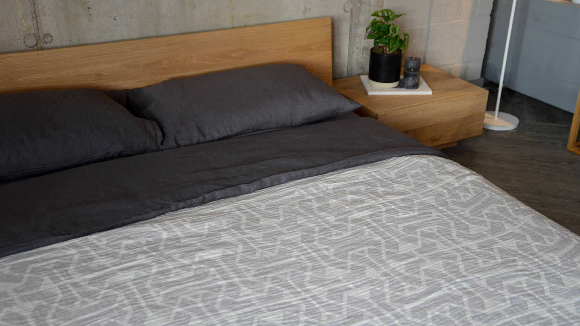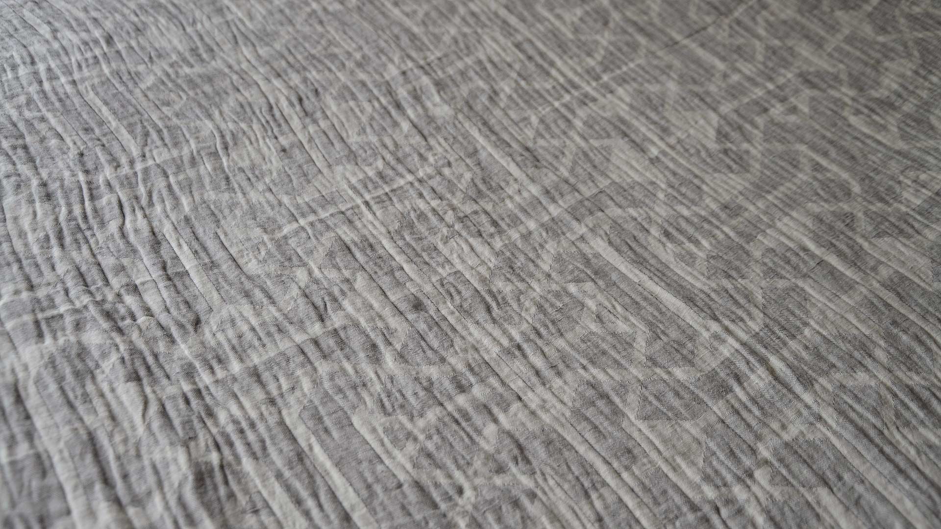 A modern grey throw overlayed with a subtle ivory graphic pattern. This throw is made from a cotton and linen blend, making it both cosy and lightweight.