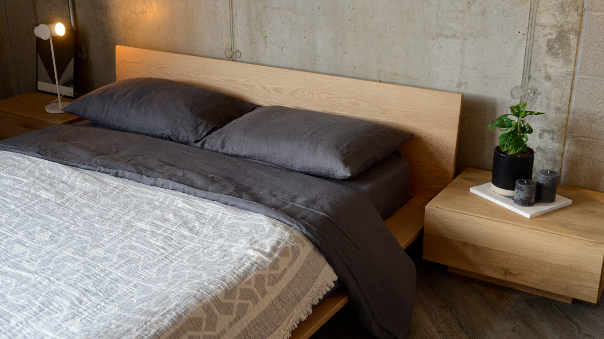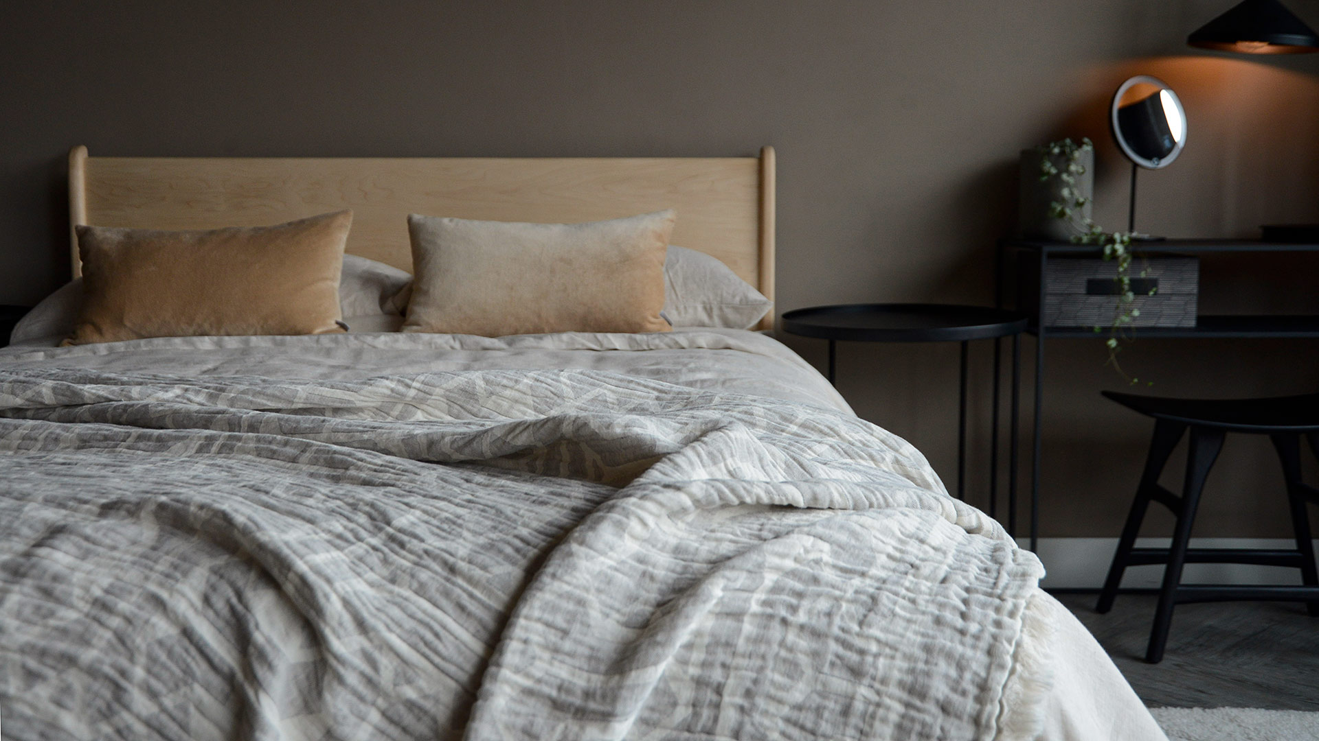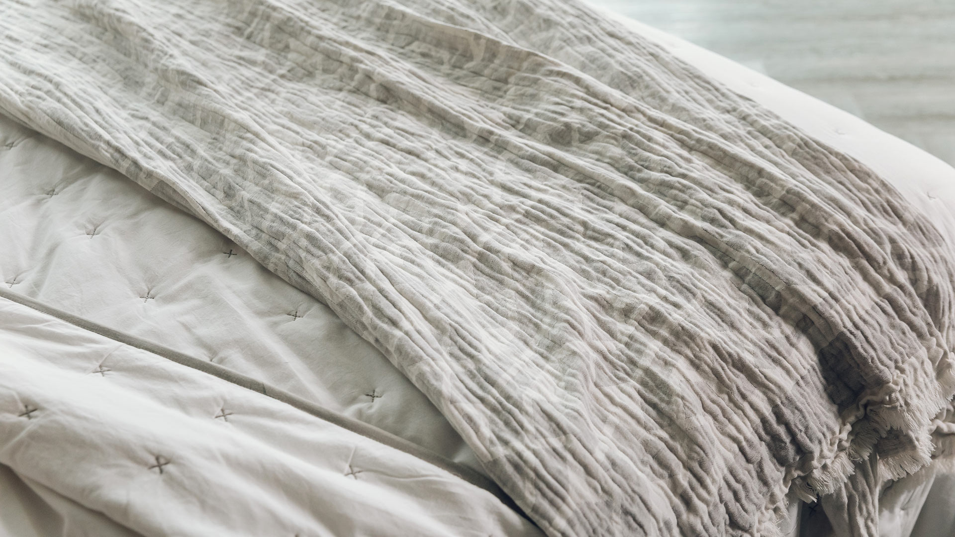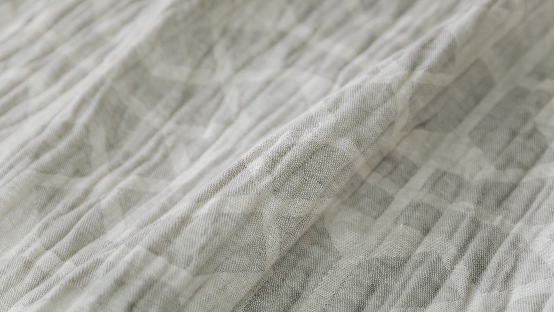 A modern grey throw overlayed with a subtle ivory graphic pattern. This throw is made from a cotton and linen blend, making it both cosy and lightweight.