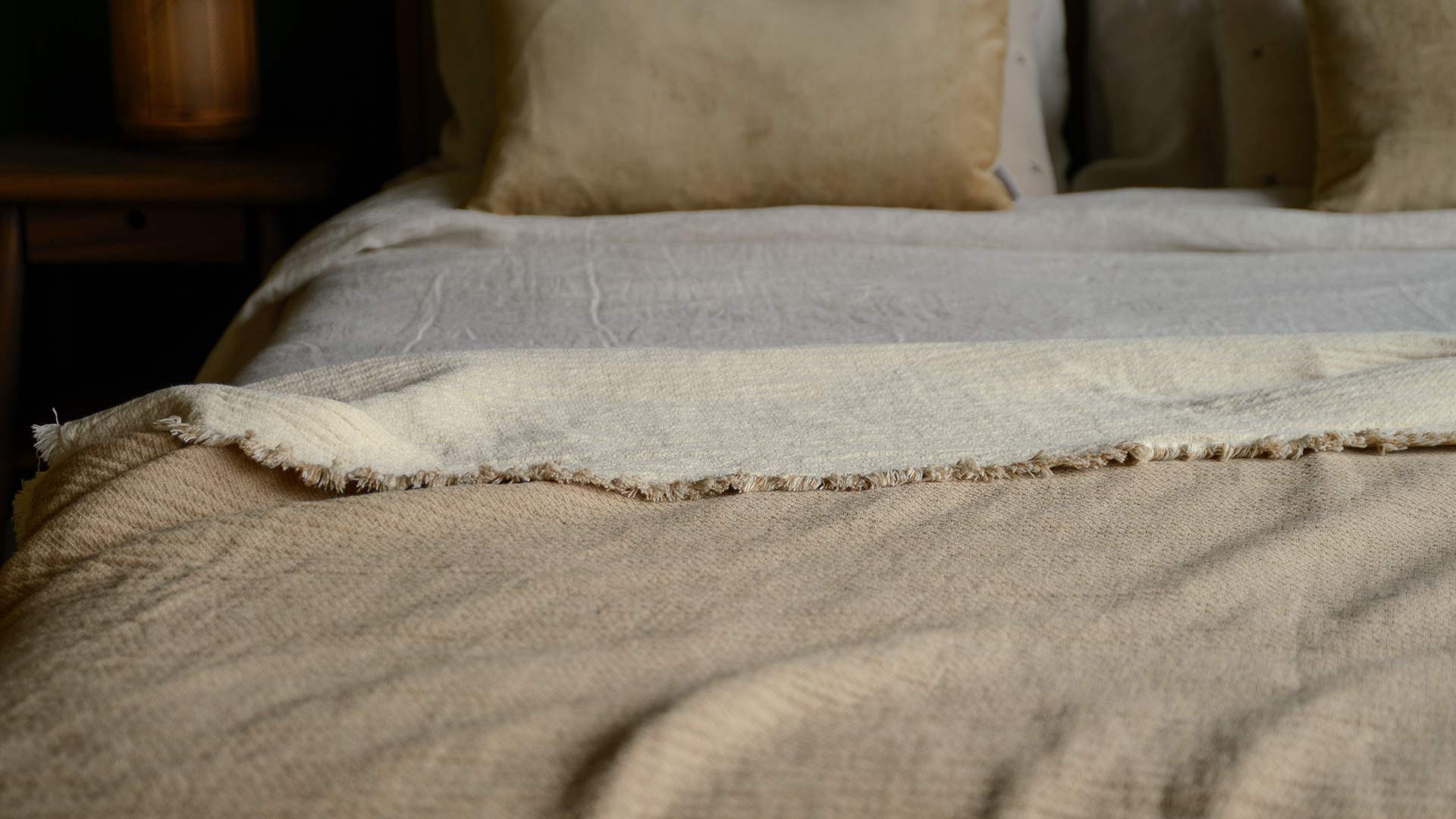 – Dove Grey: A soft, warm dove grey blended with ivory threads, complete with an ivory fringe to each edge – Soft Beige: A pale, cosy beige shade, blended with ivory threads, complete with an ivory fringe to each edge – Rusty Red: A rich yet delicate rusty red, blended with ivory threads, complete with an ivory fringe to each edge