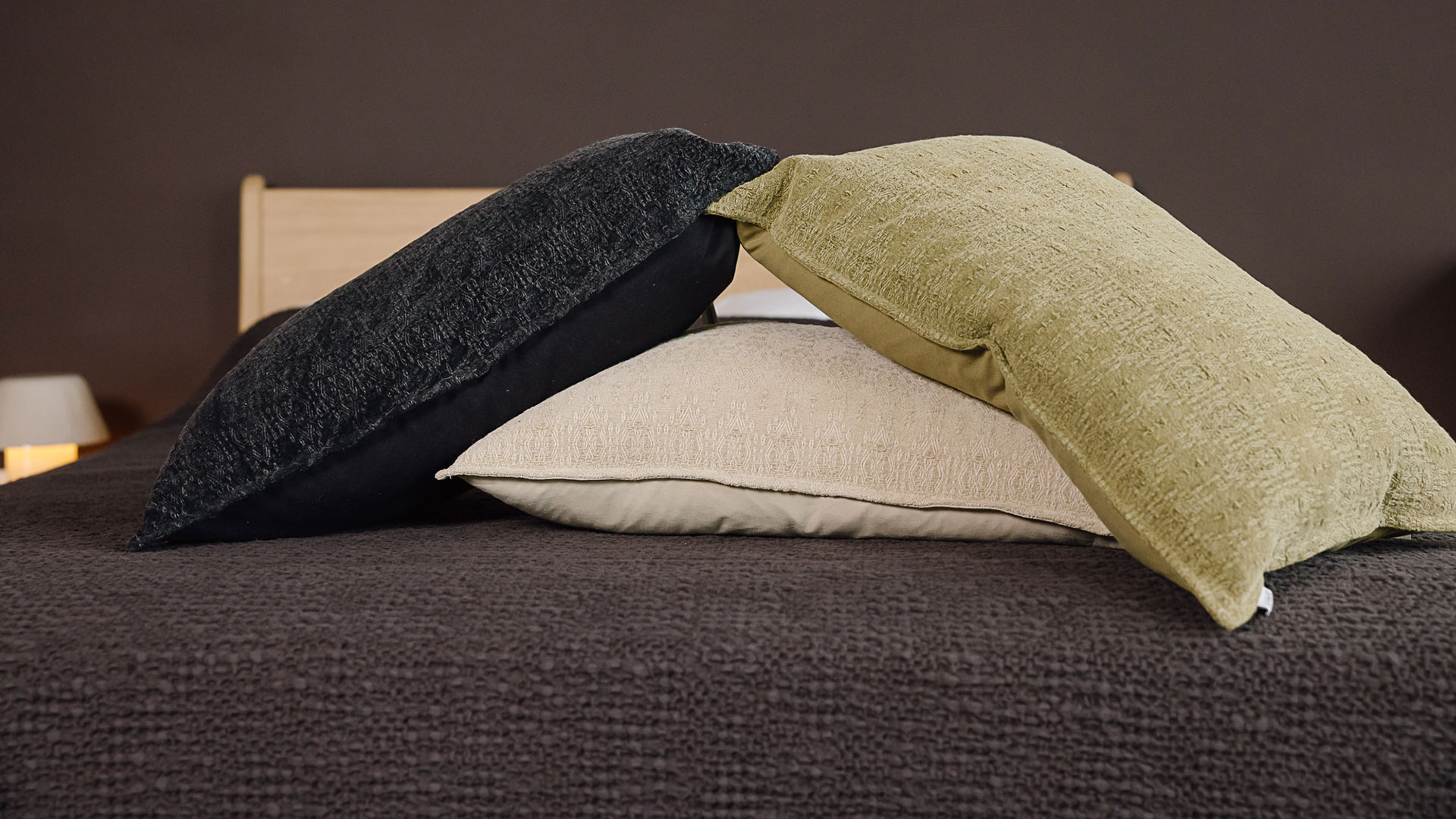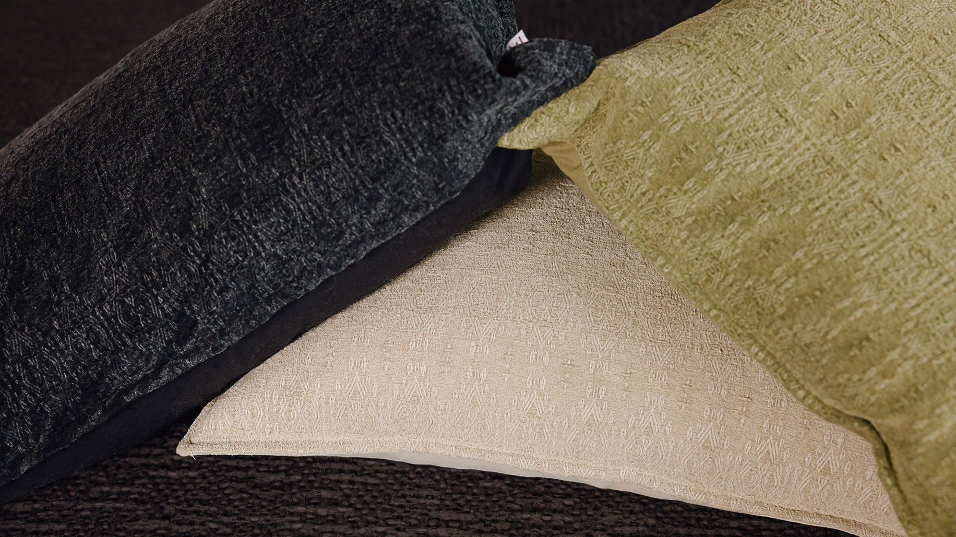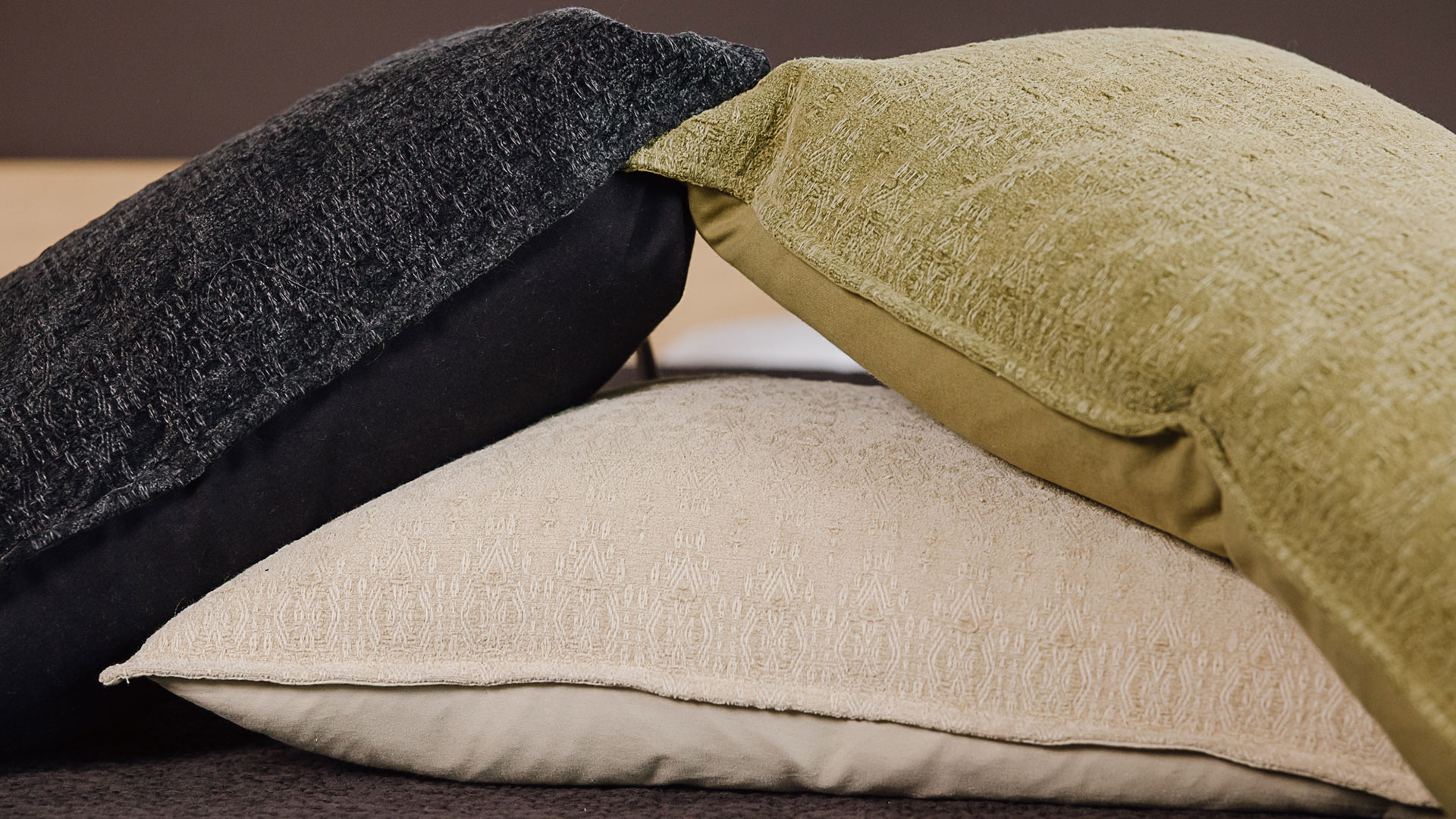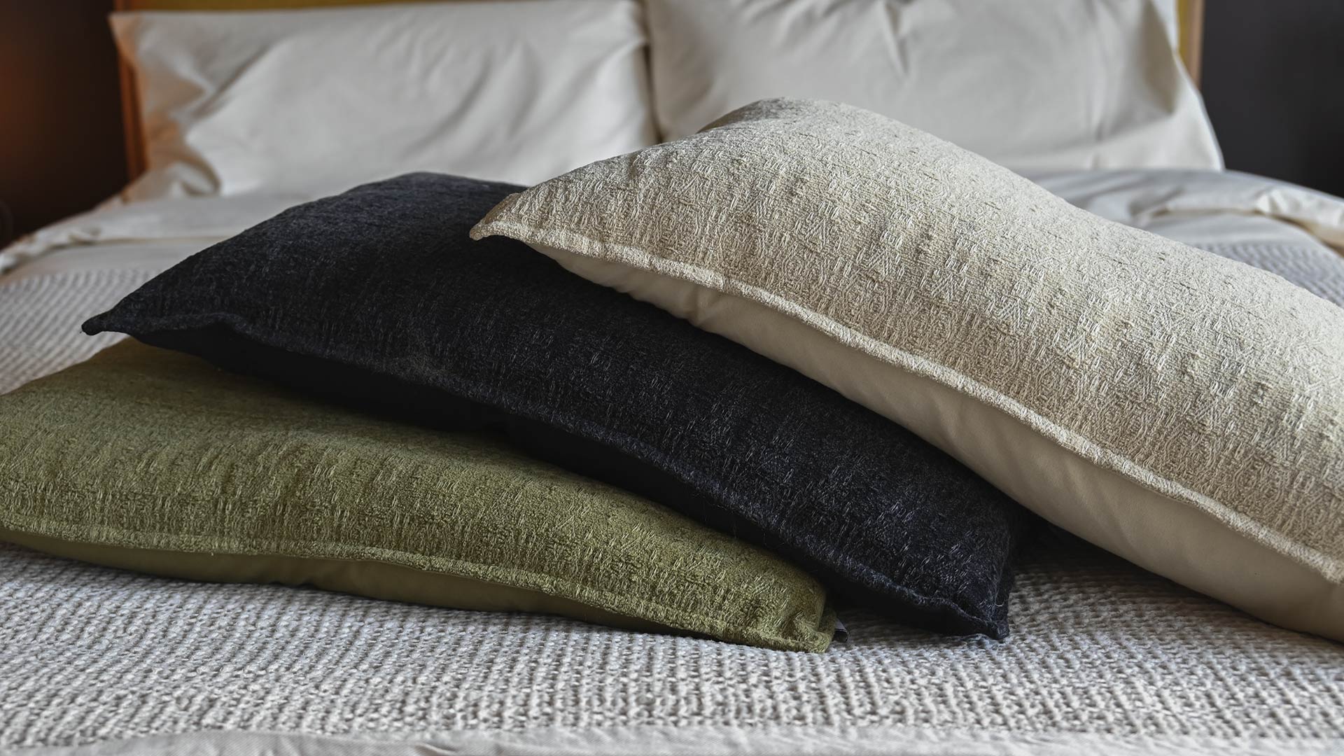 Textured pattern cushions in ecru, black or olive green, featuring a weaved jacquard pattern. These pure cotton cushion covers with a plump feather filled inner are perfect on the bed, a sofa or along a bench.