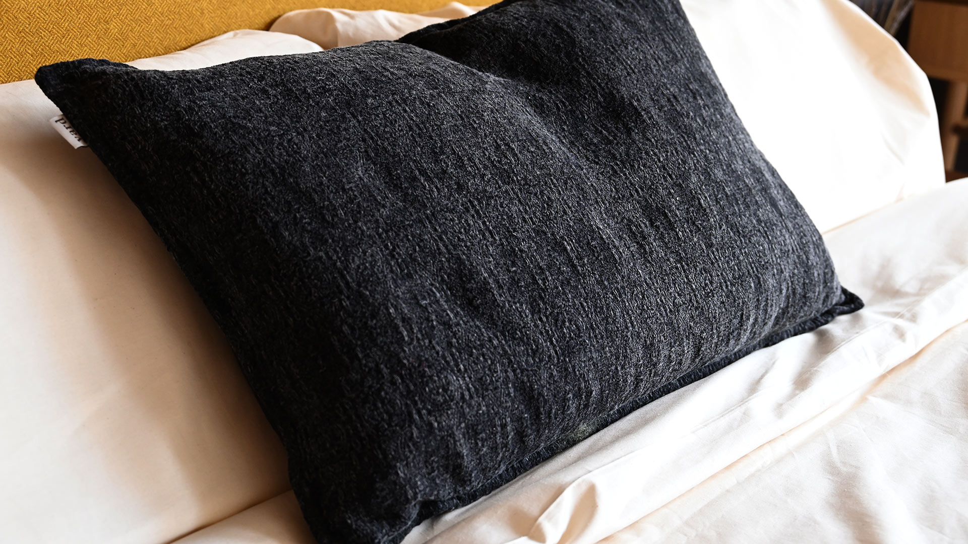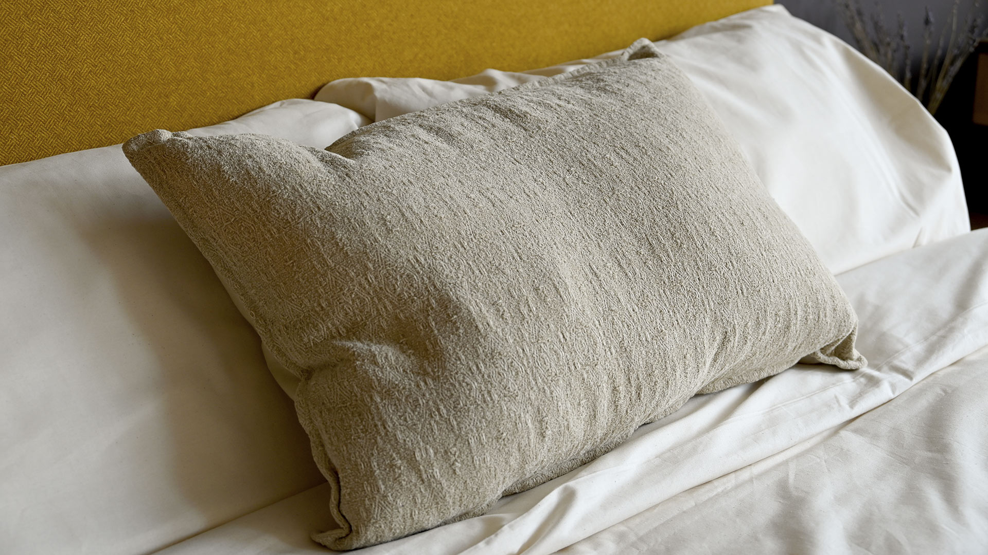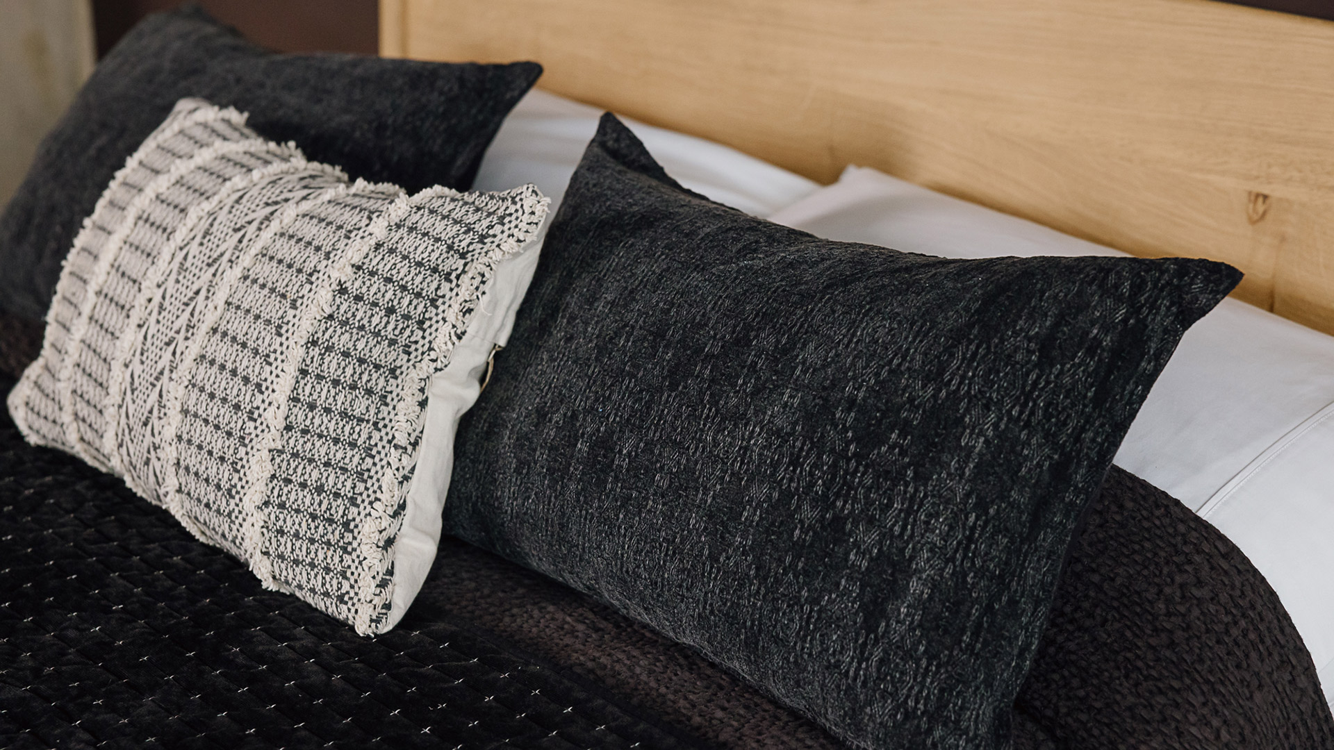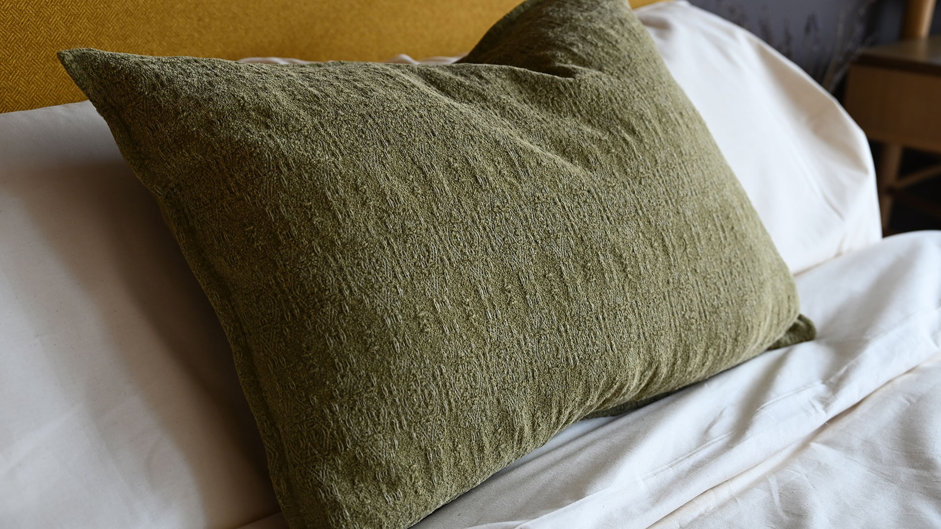 Textured pattern cushions in ecru, black or olive green, featuring a weaved jacquard pattern. These pure cotton cushion covers with a plump feather filled inner are perfect on the bed, a sofa or along a bench.