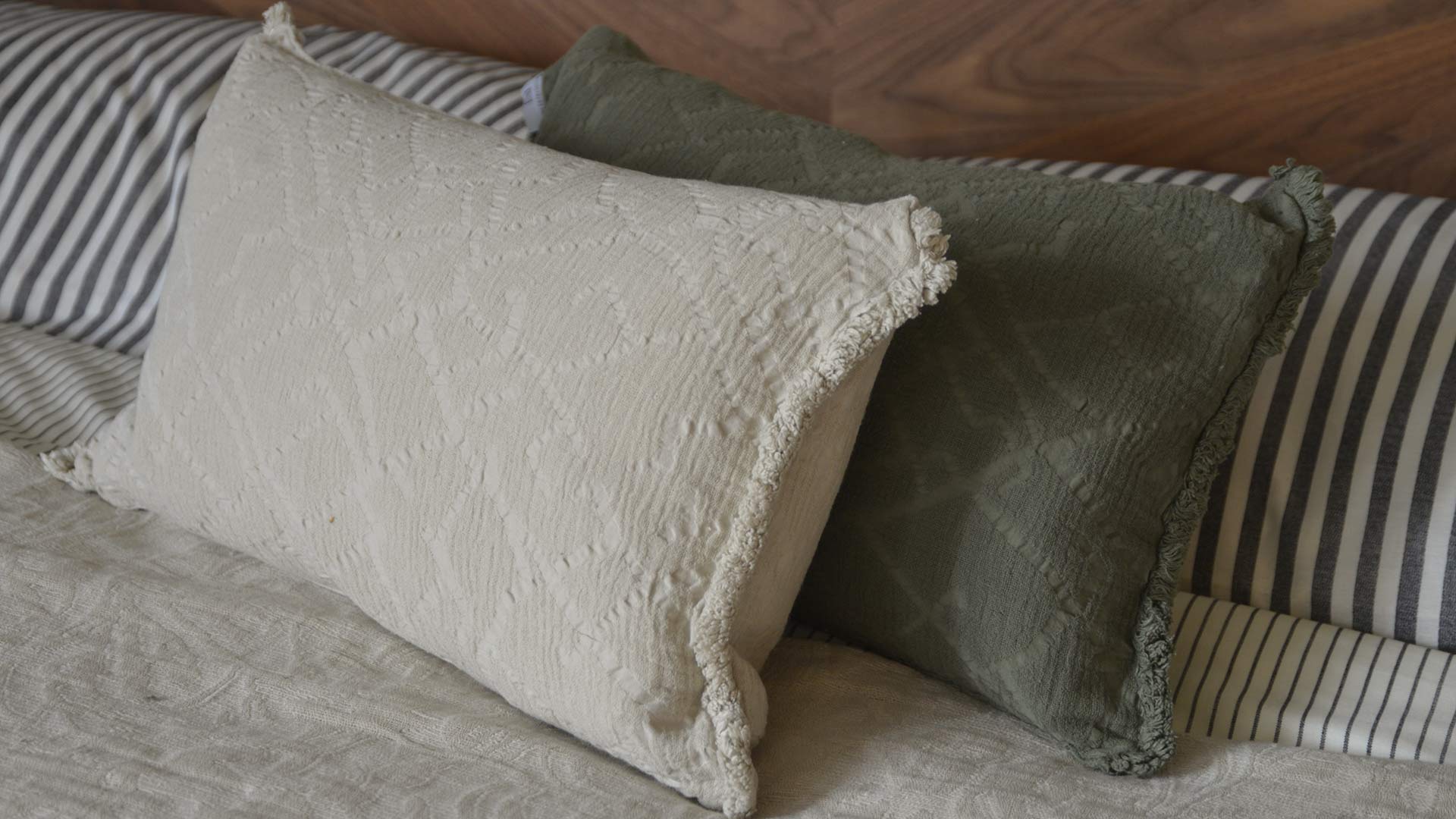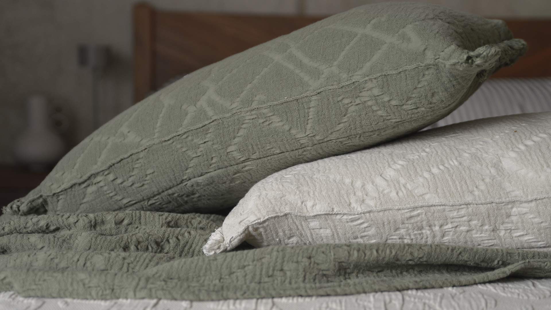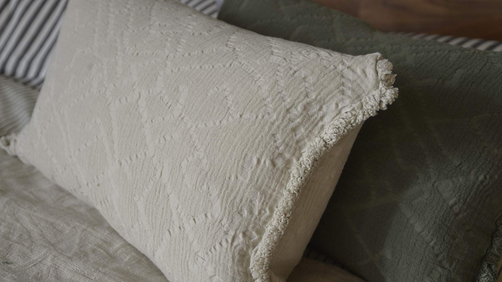 Textured pattern cushions in ecru or olive green. These pure cotton cushion covers with a plump feather filled inner. These cushions are soft and tactile, cosy yet supportive. Perfect on the bed, a sofa or along a bench.