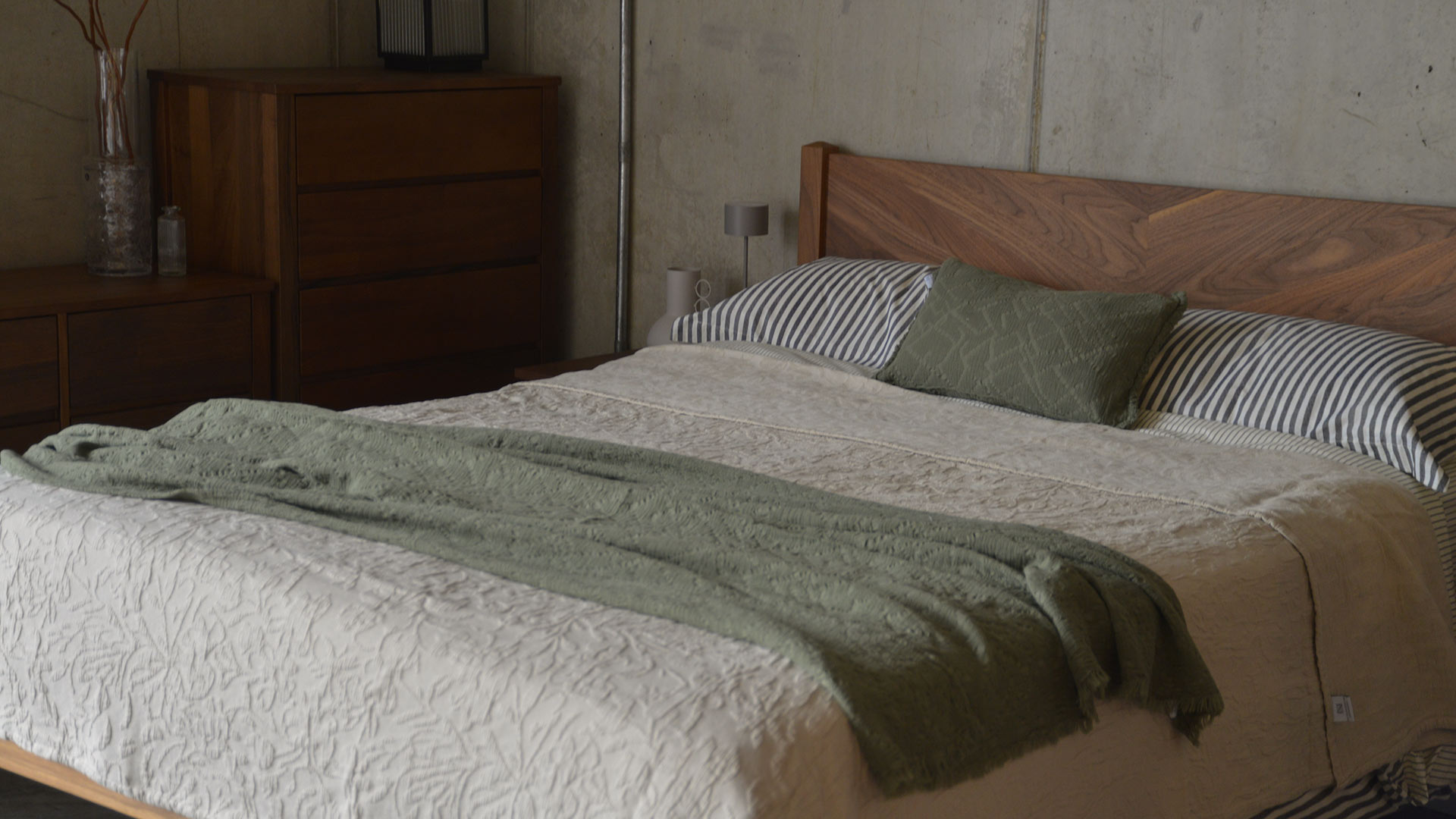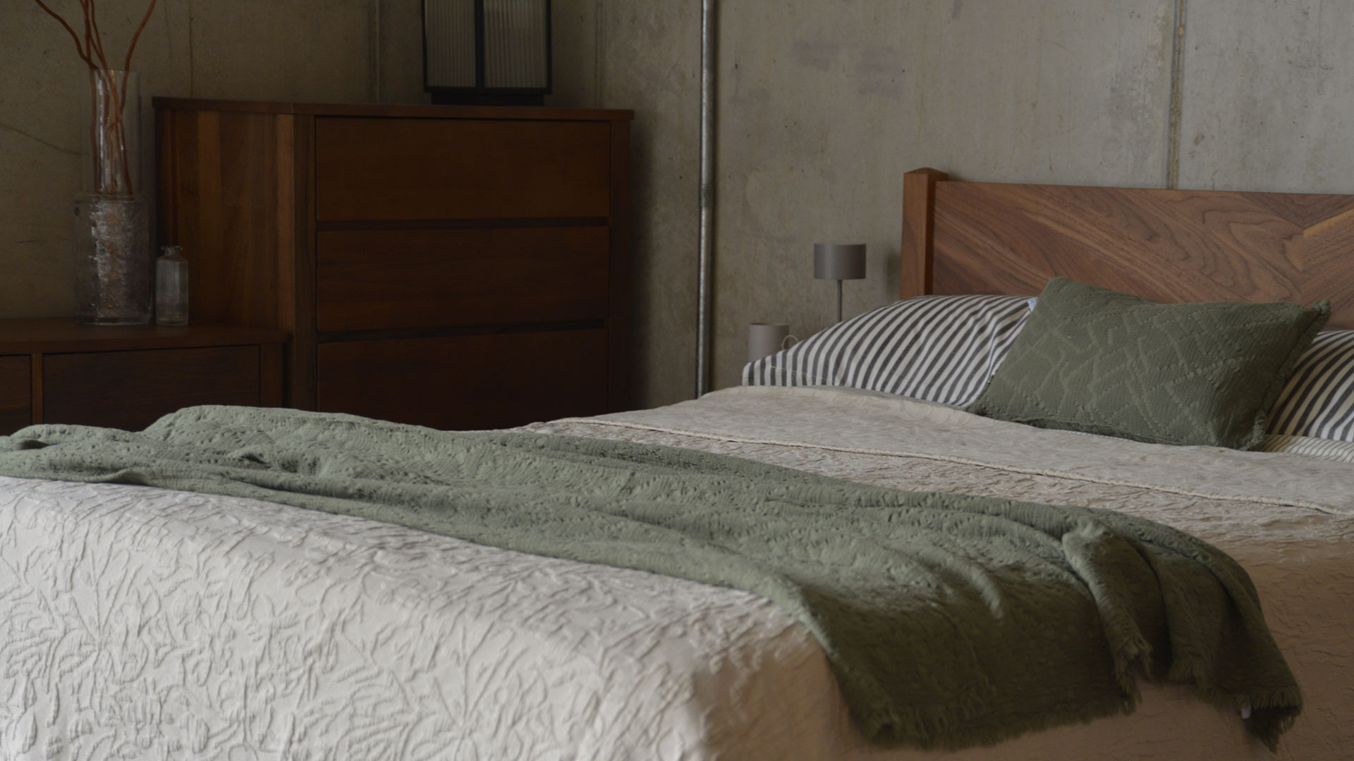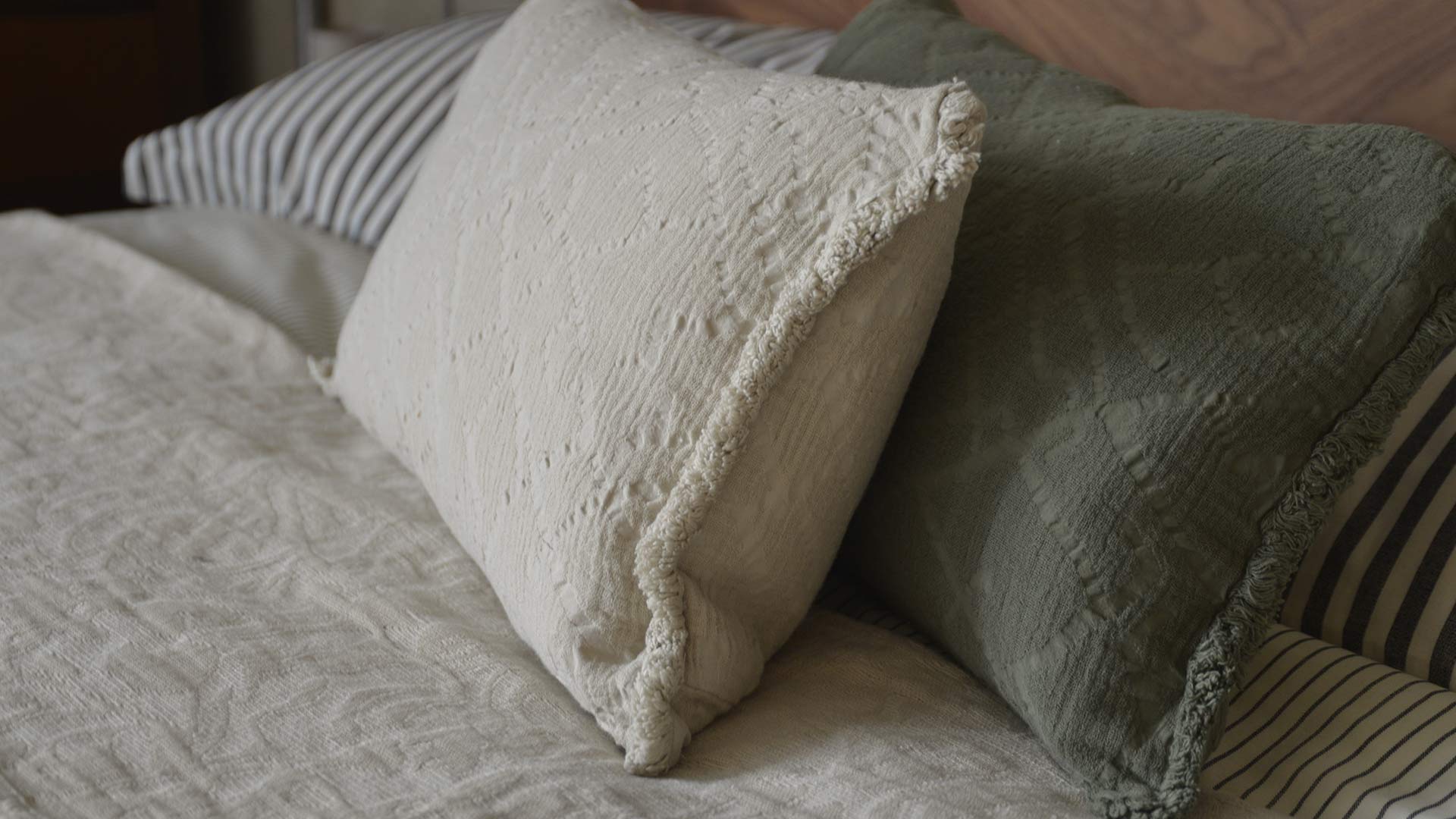 Textured pattern cushions in ecru or olive green. These pure cotton cushion covers with a plump feather filled inner. These cushions are soft and tactile, cosy yet supportive. Perfect on the bed, a sofa or along a bench.