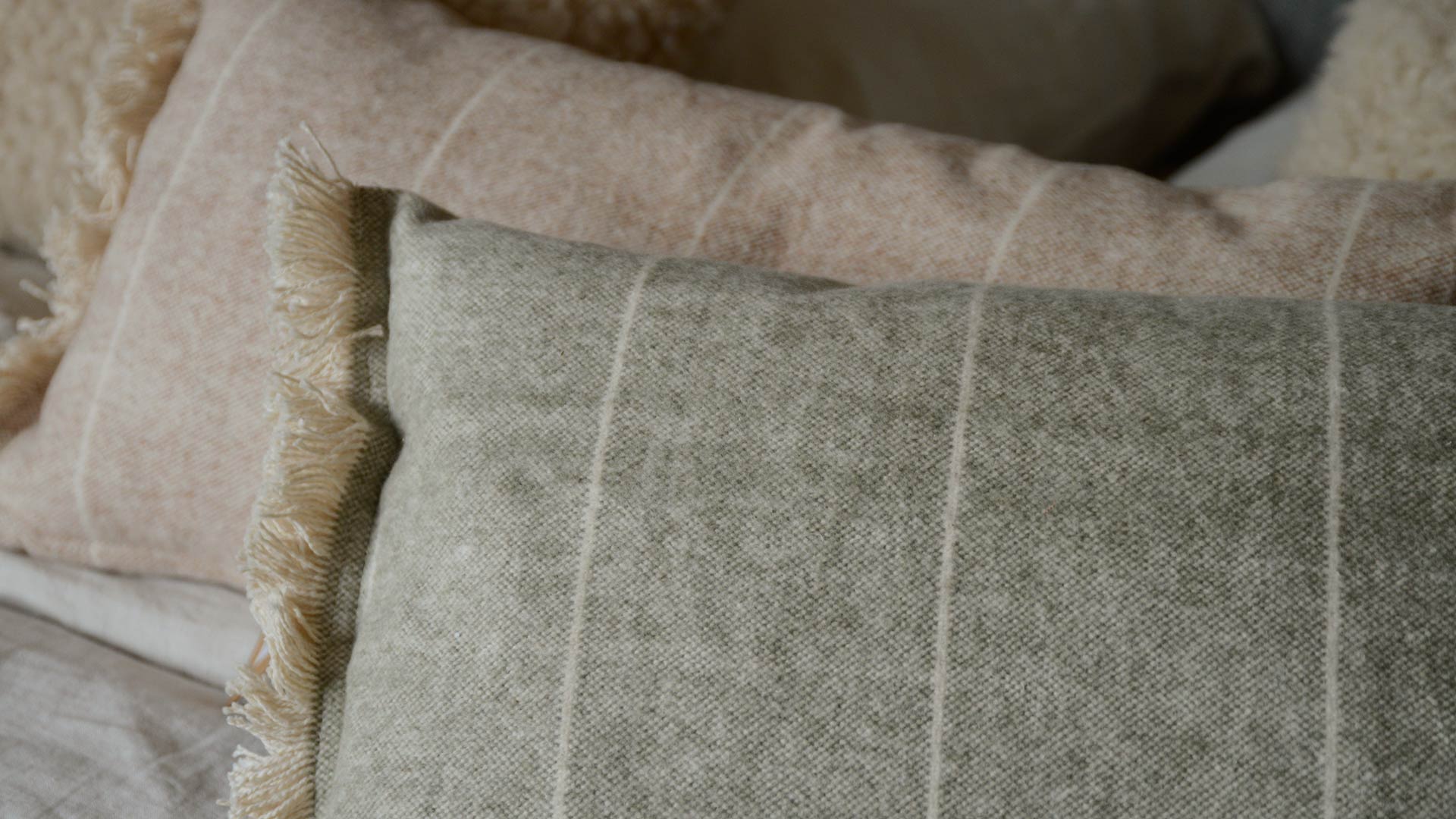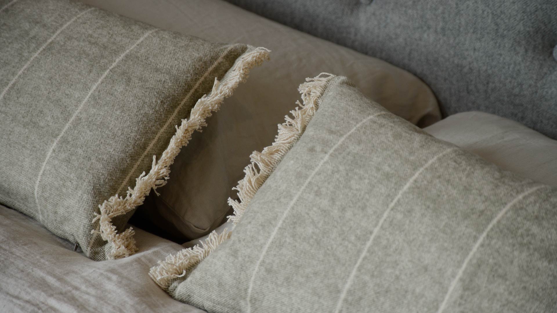 With a soft, plush feel cover in brushed cotton and a firm feather pad inner, these thin stripe breakfast cushions are comfy and stylish. Available in two muted shades, each featuring a thin ivory stripe design to the front and back. Finished with a rustic tasseled edge to the two sides. Perfect on the sofa or along a bench.