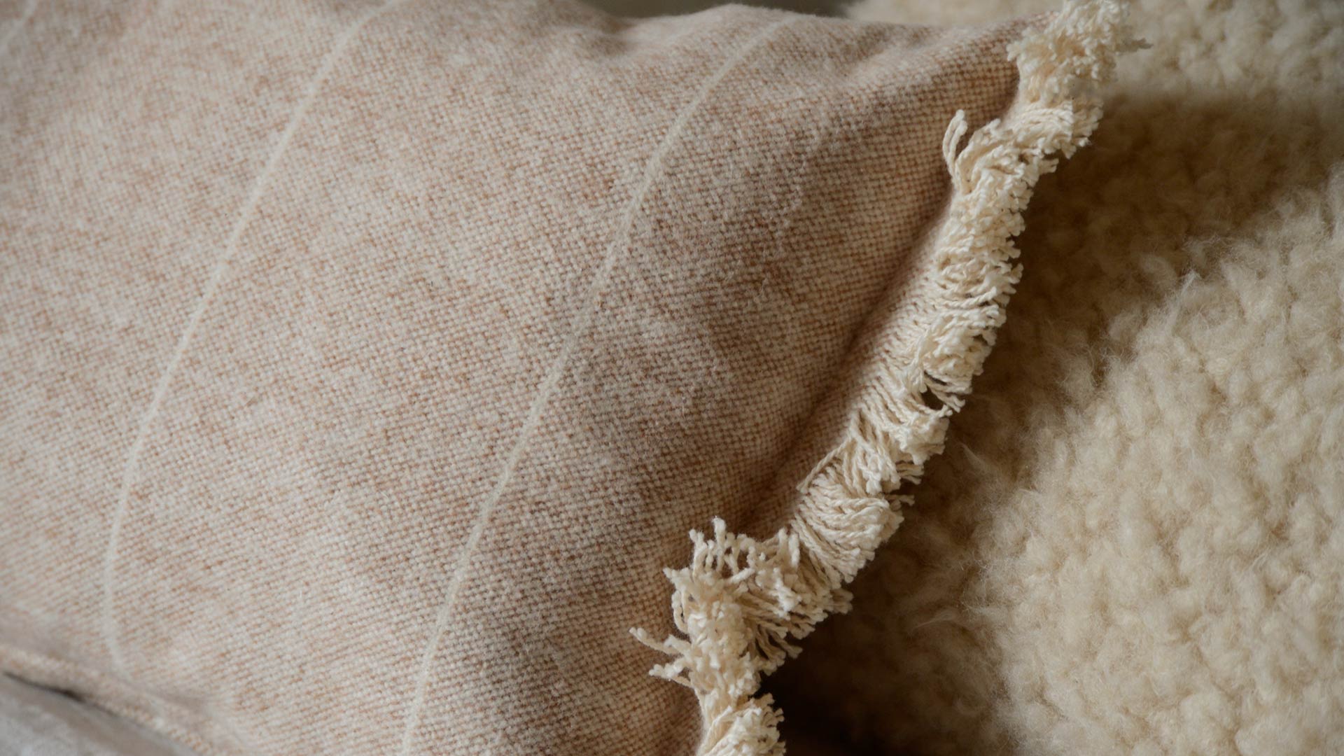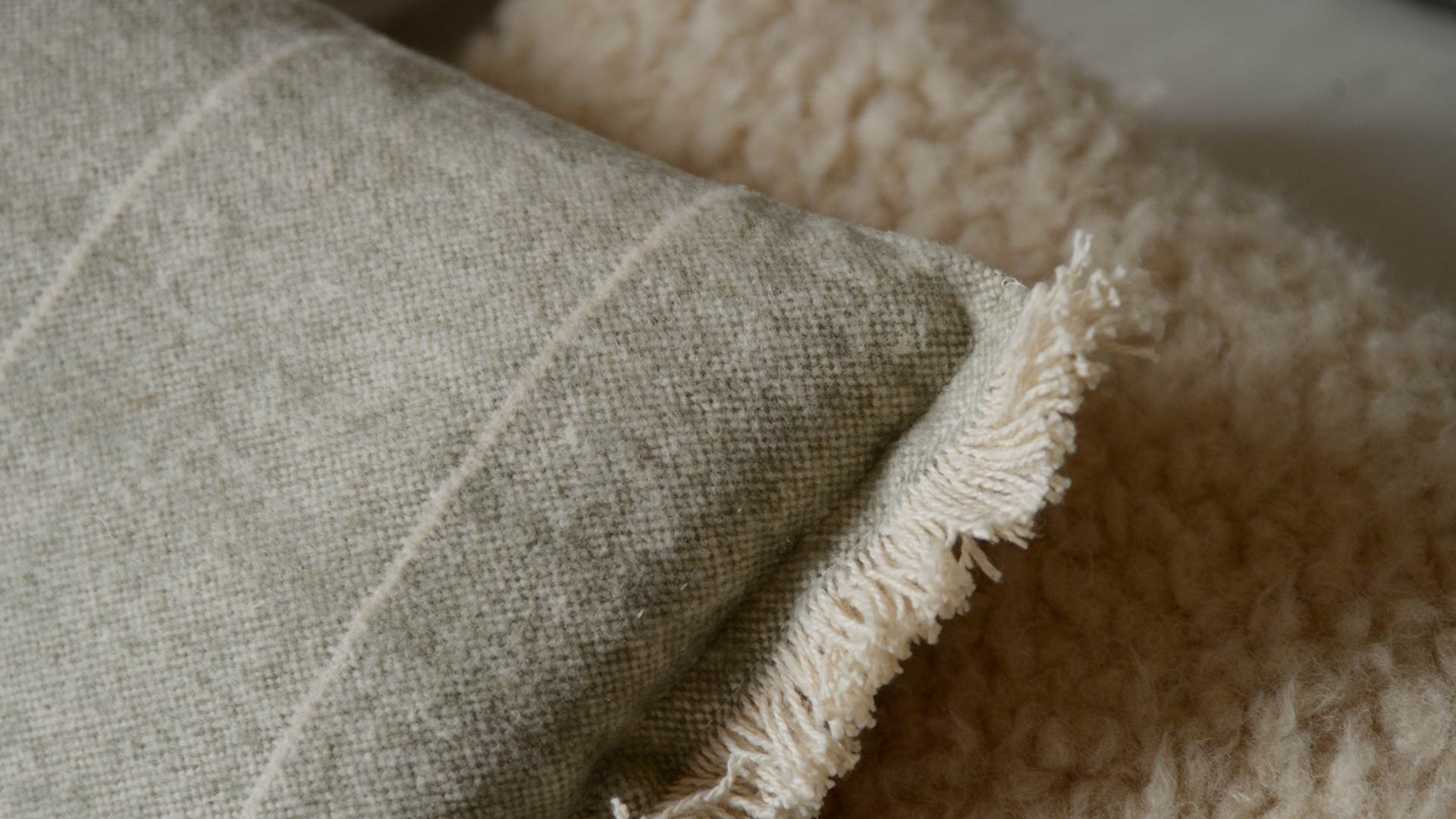 Colours: Sage: A mottled, light green and grey marl interspersed with ivory within the weave, with thin ivory stripes and matching fringing to two edges. Clay: A mottled, light pink and brown marl interspersed with ivory within the weave, giving it a light terracotta look. Complete with thin ivory stripes and matching ivory fringe to two edges.