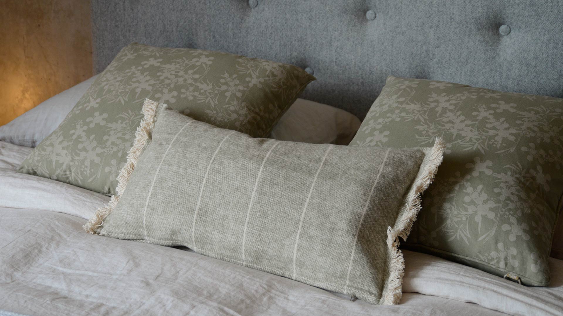 Soft and plush, these breakfast cushions feature a simple thin stripe design. Available in two muted shades; choose from sage or clay before adding to the basket. Pop on the sofa, bed or chair for an instant touch of personality. 100% cotton cover, comes complete with a feather pad inner.