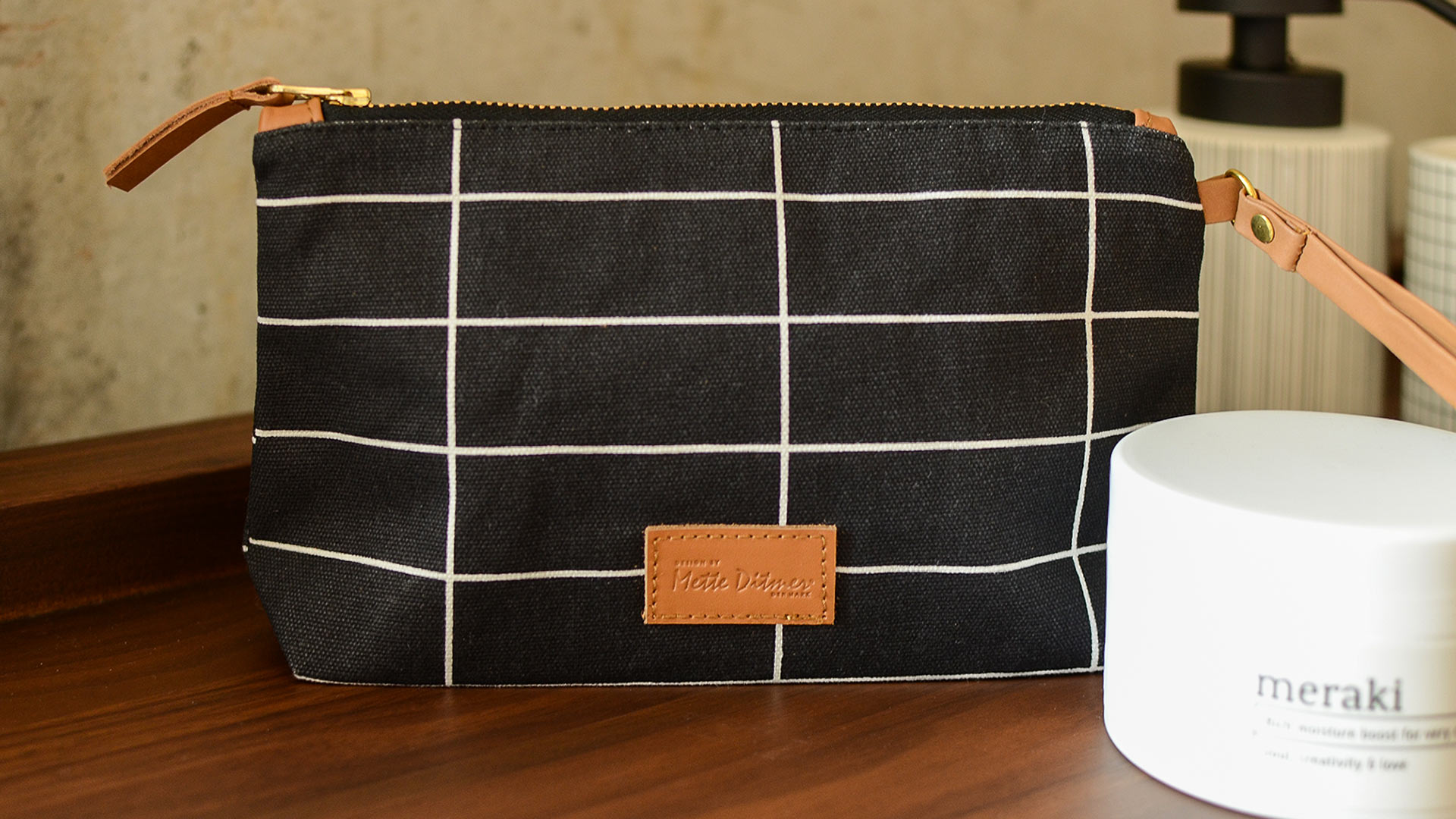 A stylish small wash-bag/cosmetics bag. This lined, cotton fabric, zip-up bag has an internal pocket. Part of the modern, monochrome Grid Collection that includes the Grid Soap Dispenser and Toothbrush Holder and the Black & White Towels collection.