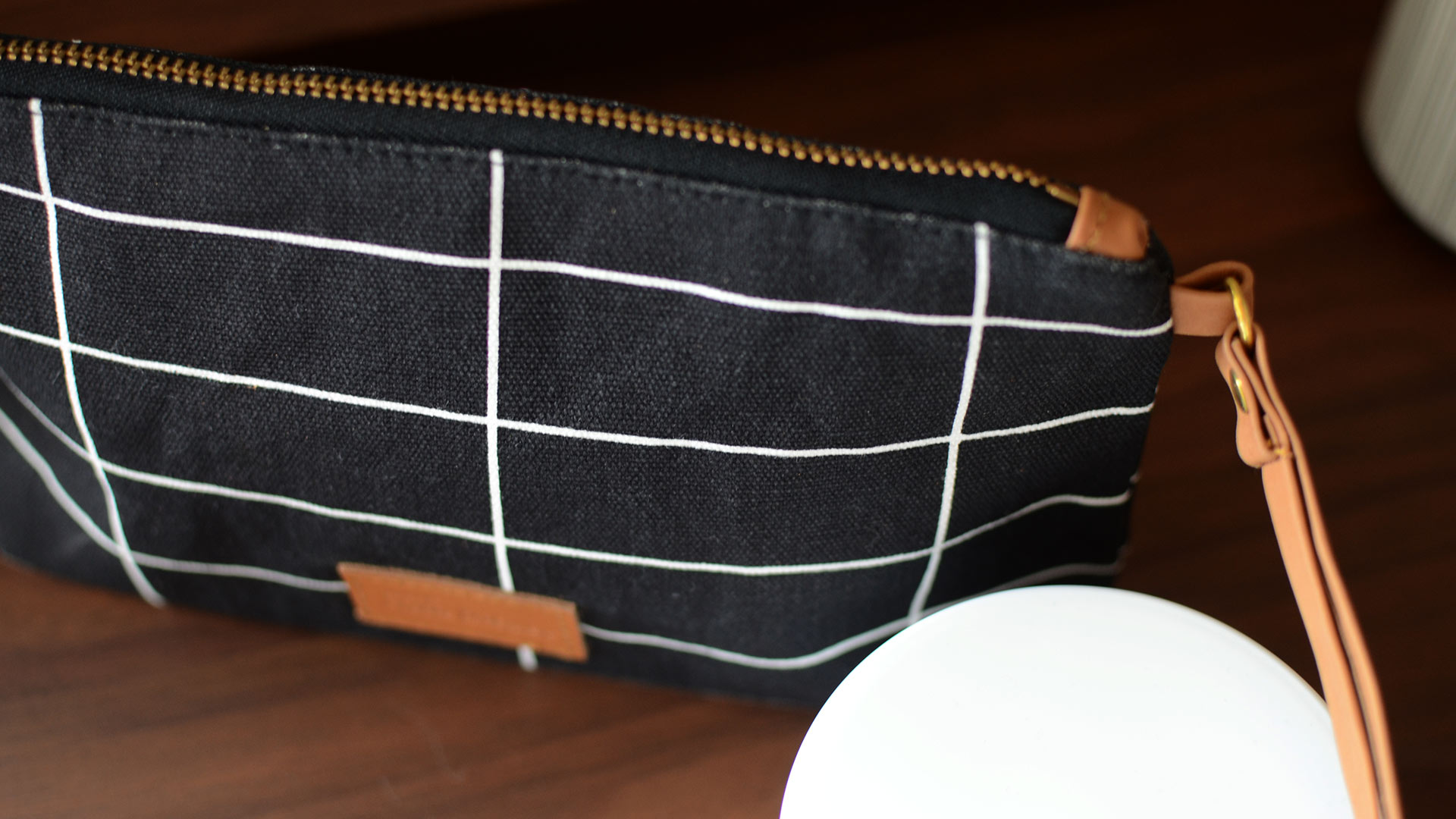 A small wash bag with a tile design in white over a black background. The inner lining of the bag has a reverse of this pattern (a black grid over an ivory background). This small wash-bag or cosmetics purse has a zip closure and a handy inner pocket.