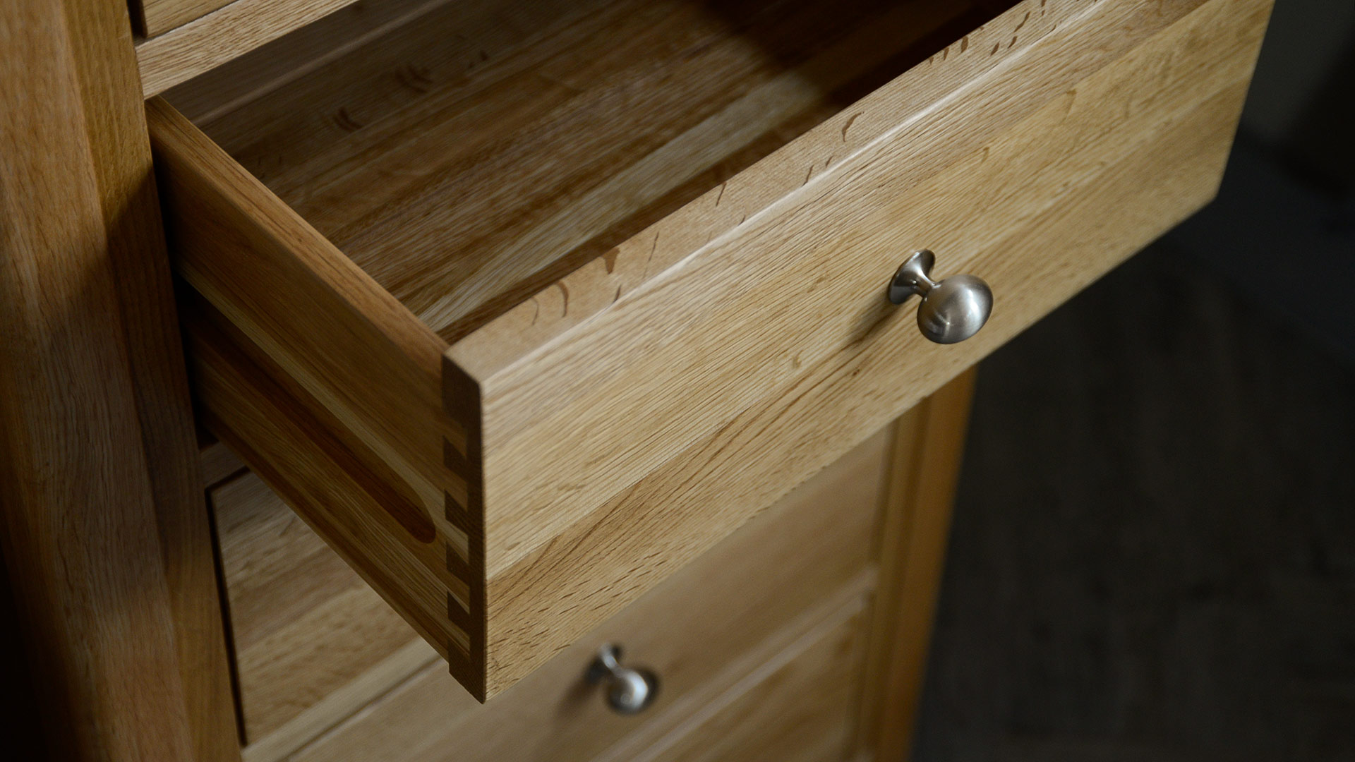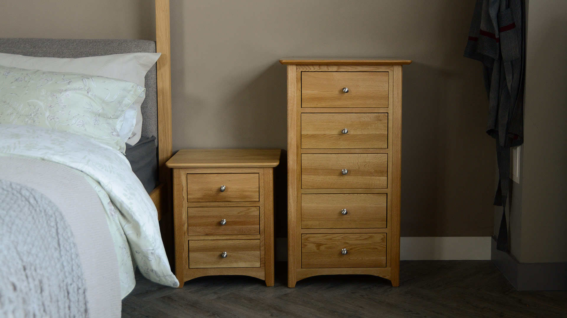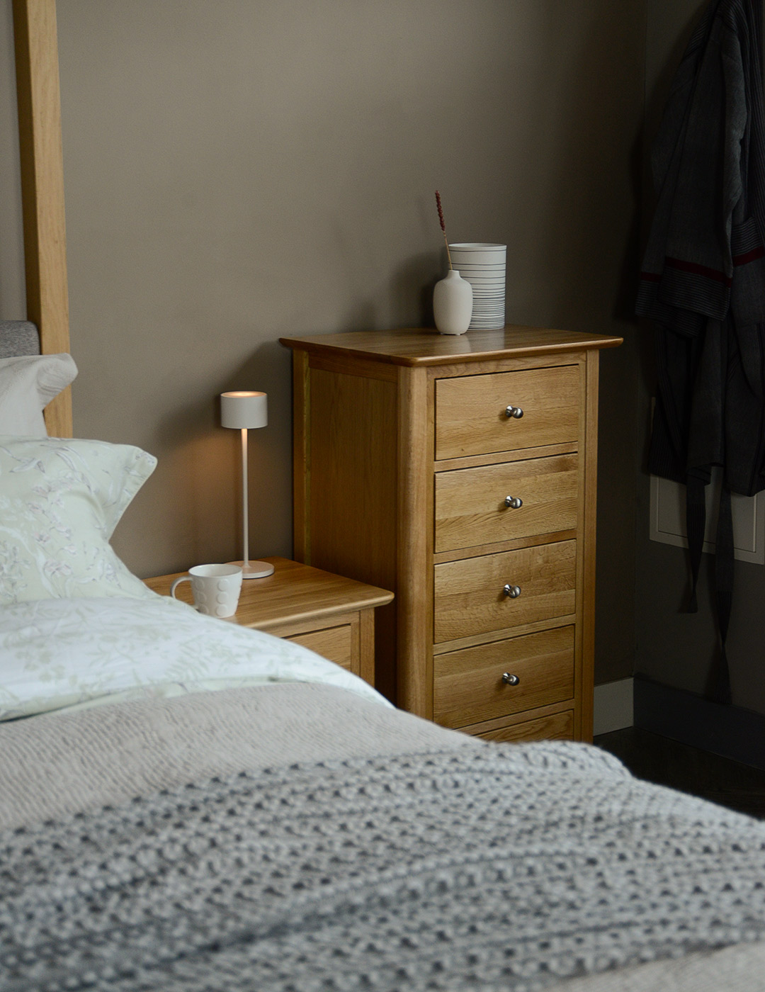 A classic design with a modern twist. This traditional oak, five-drawer tallboy is part of a larger range of bedroom furniture, all available through our website. You can also find a matching chest of drawers just here.
