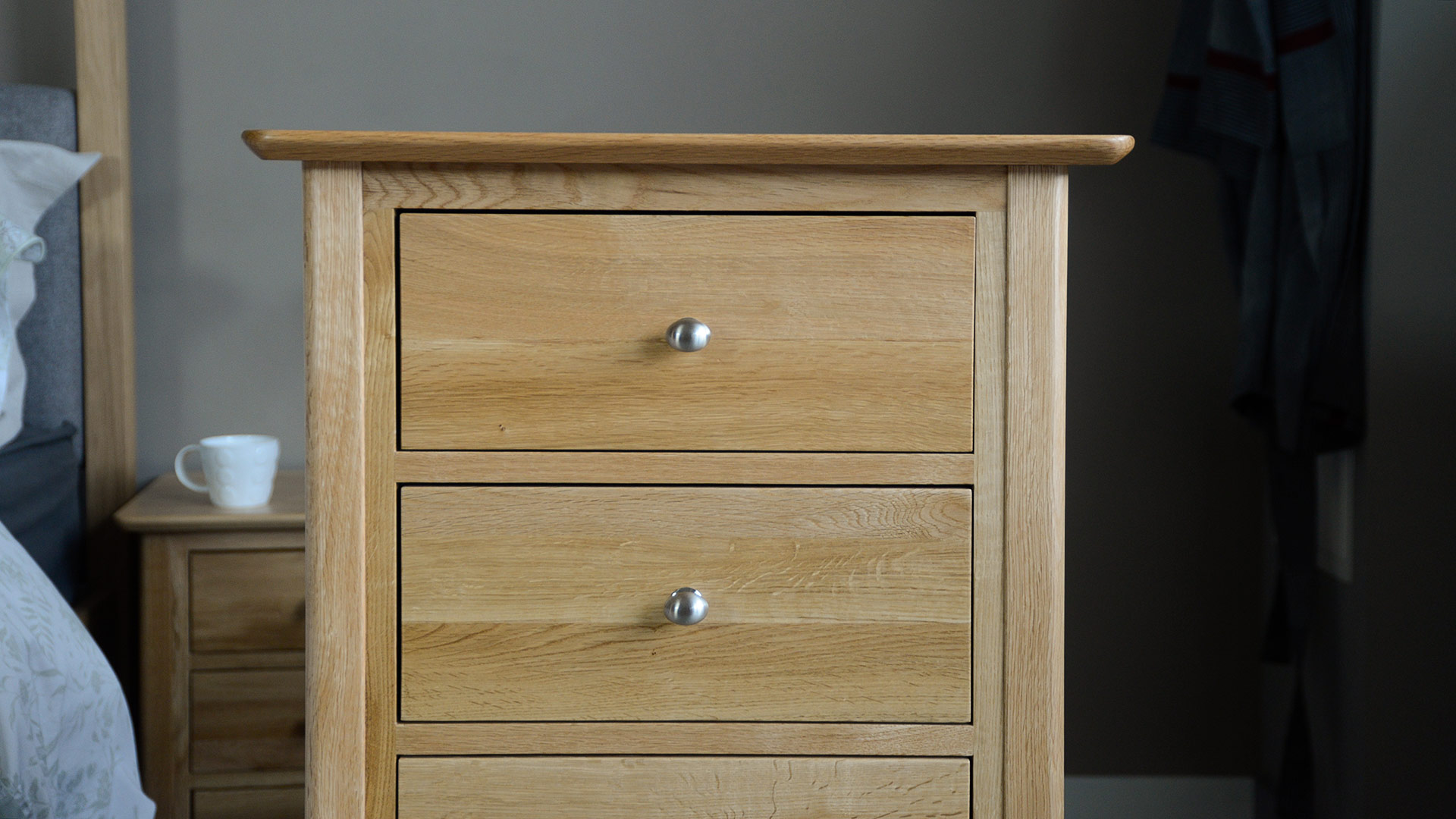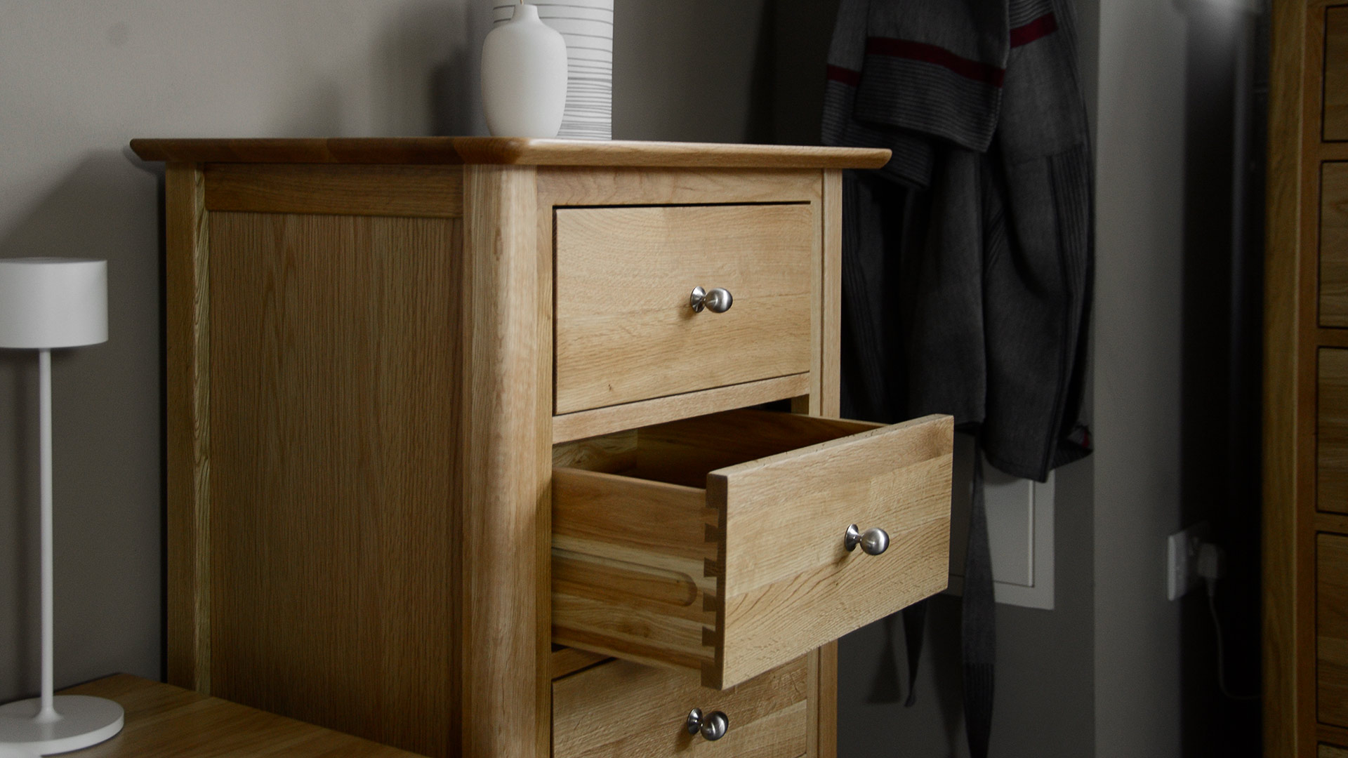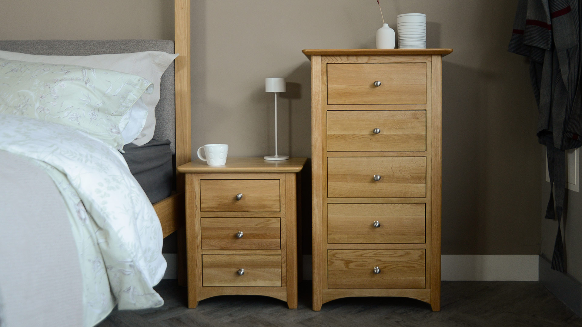 A classic design with a modern twist. This traditional oak, five-drawer tallboy is part of a larger range of bedroom furniture, all available through our website. You can also find a matching chest of drawers just here.