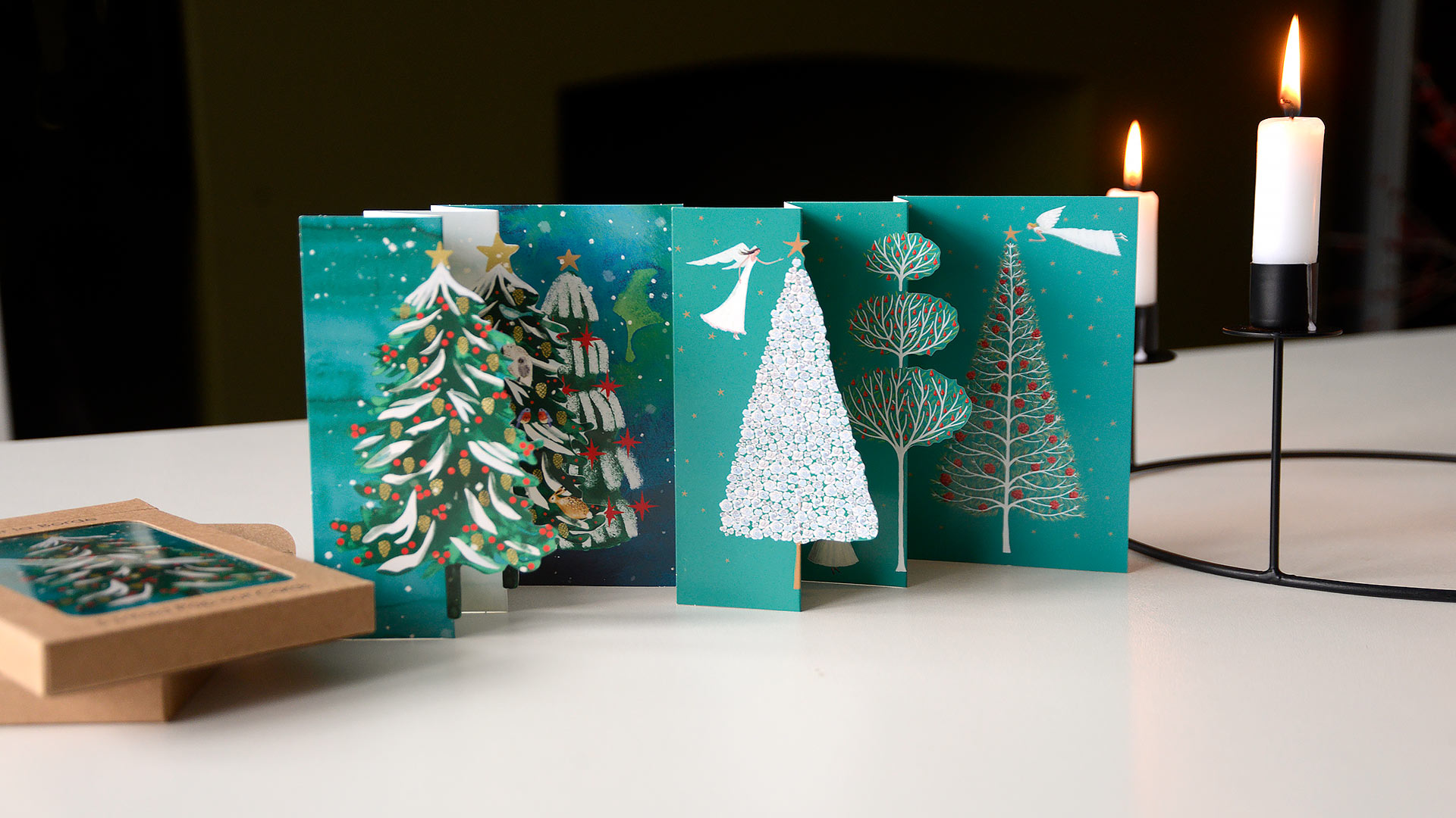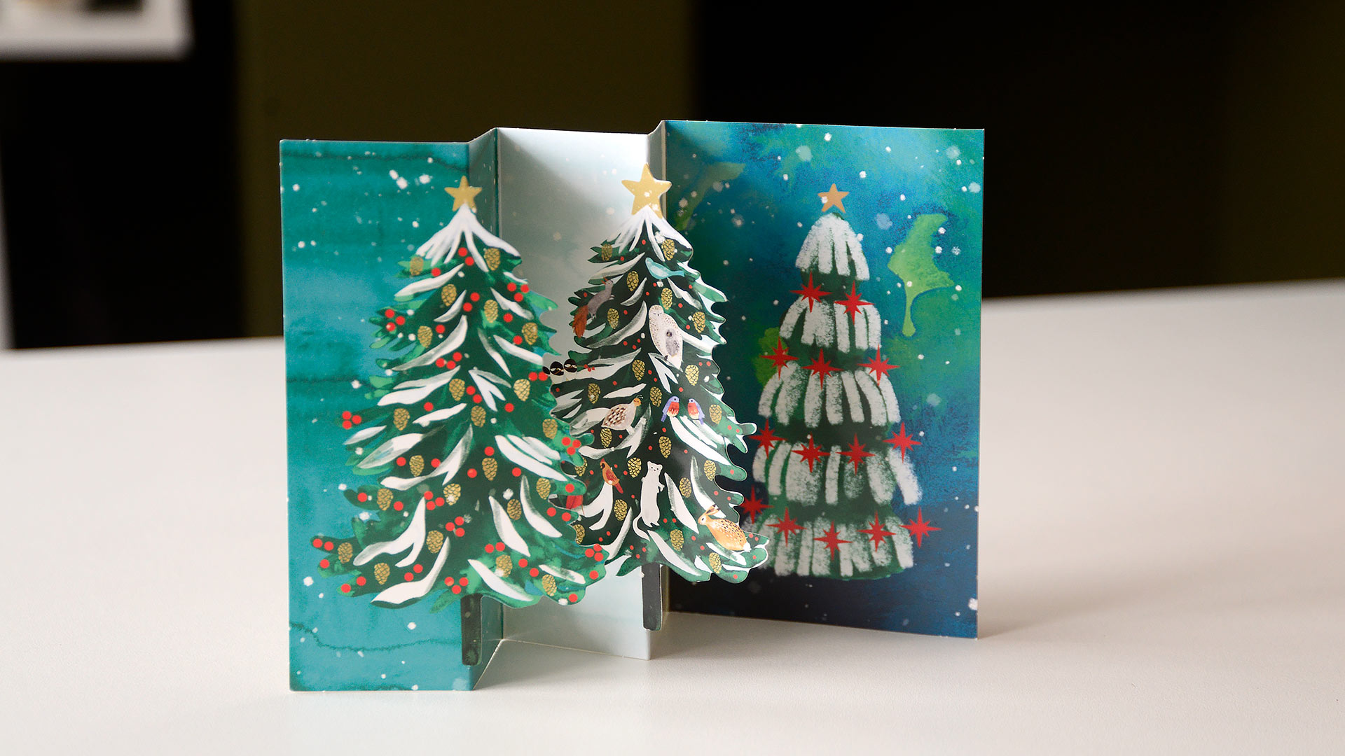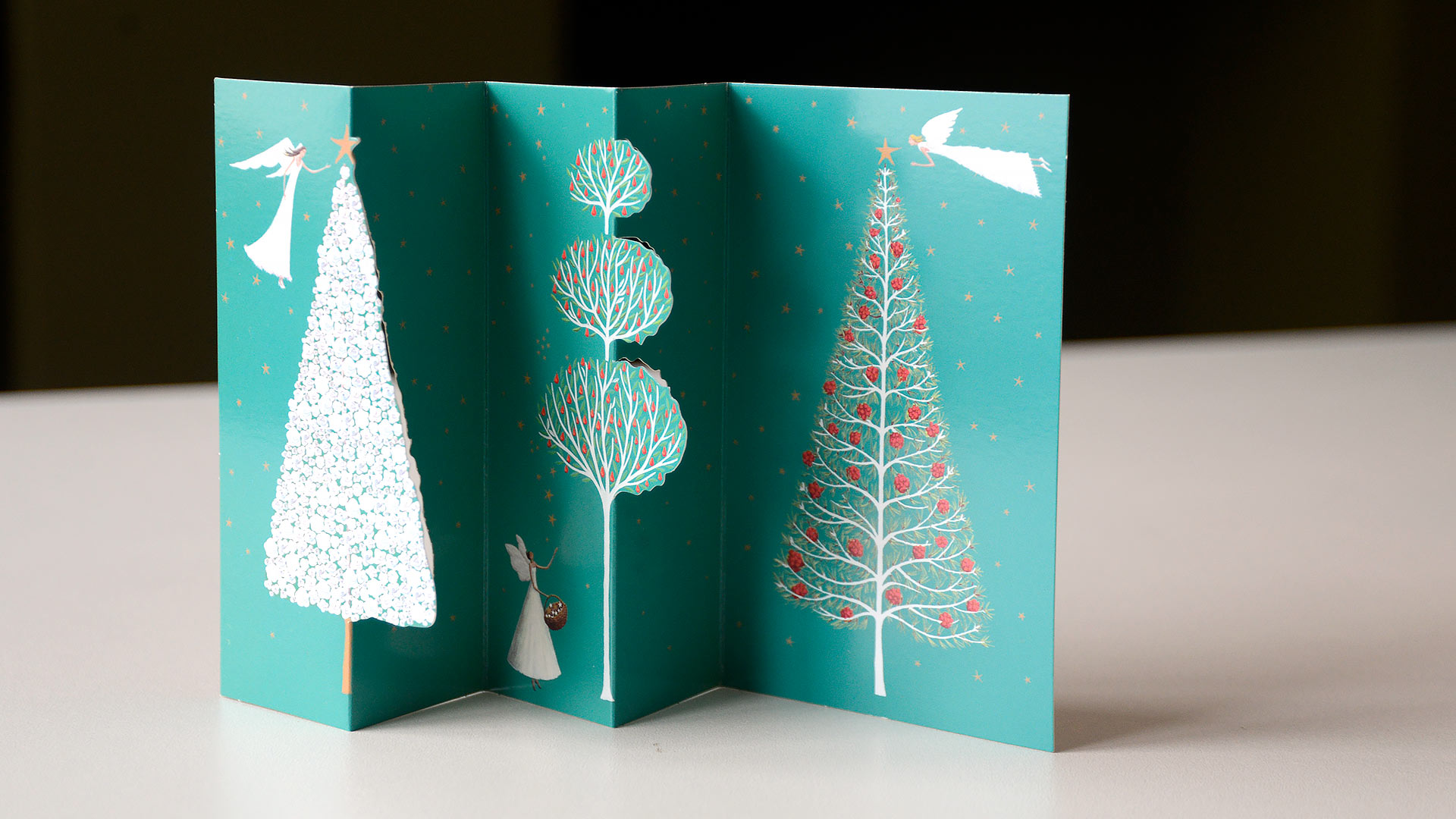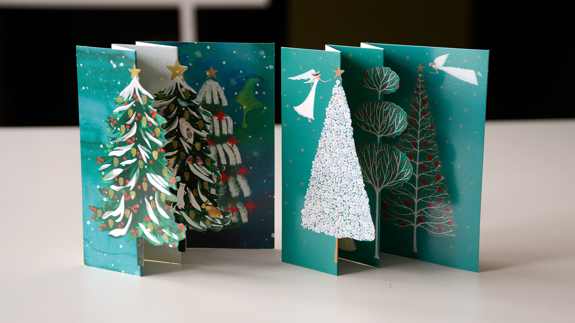 Snowy Christmas Forest:Â Snow falls over three charming little Christmas trees. Artwork by Katie Vernon Angels Around the Christmas Tree: This card folds out to reveal a trio of angels decorating a trio of Christmas trees! Artwork by MCS