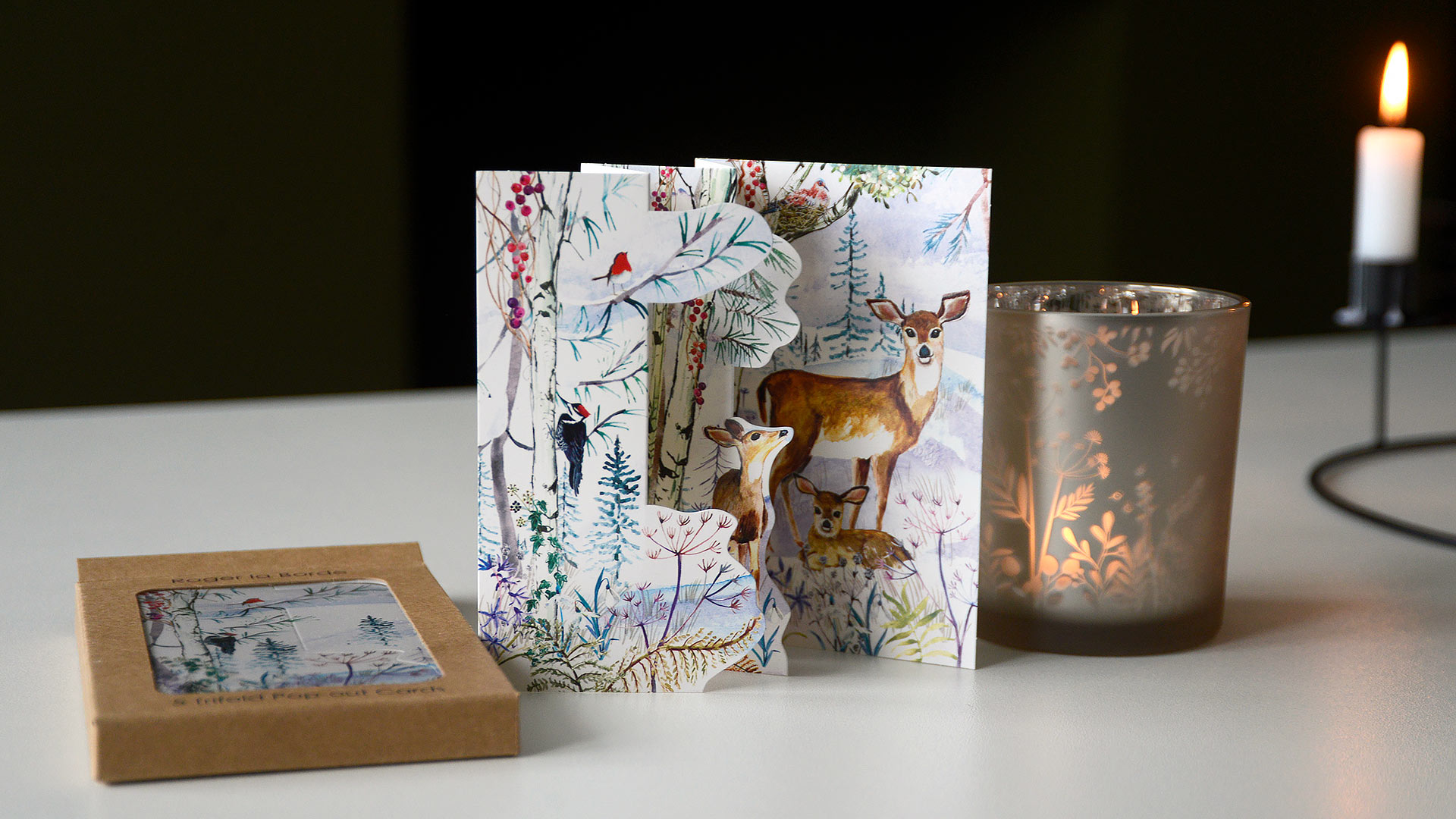 These trifold Christmas card packs each contain 5 cards of one design. We have trifold card packs available in 4 wonderful designs – they are perfect for those nearest and dearest. Each pack has an individual, charming illustration with cut-out details, and is made from FSC® certified paper. Packaging is FSC® certified Kraftpack.