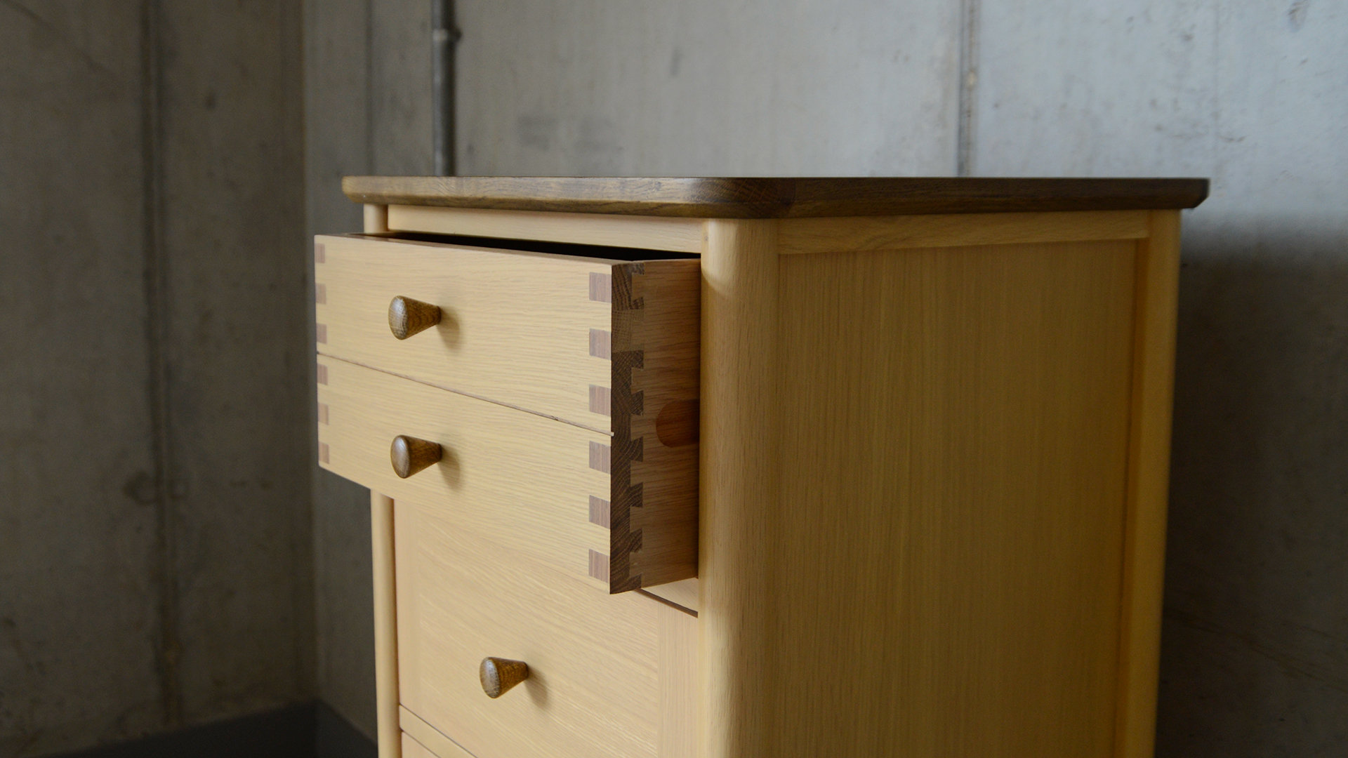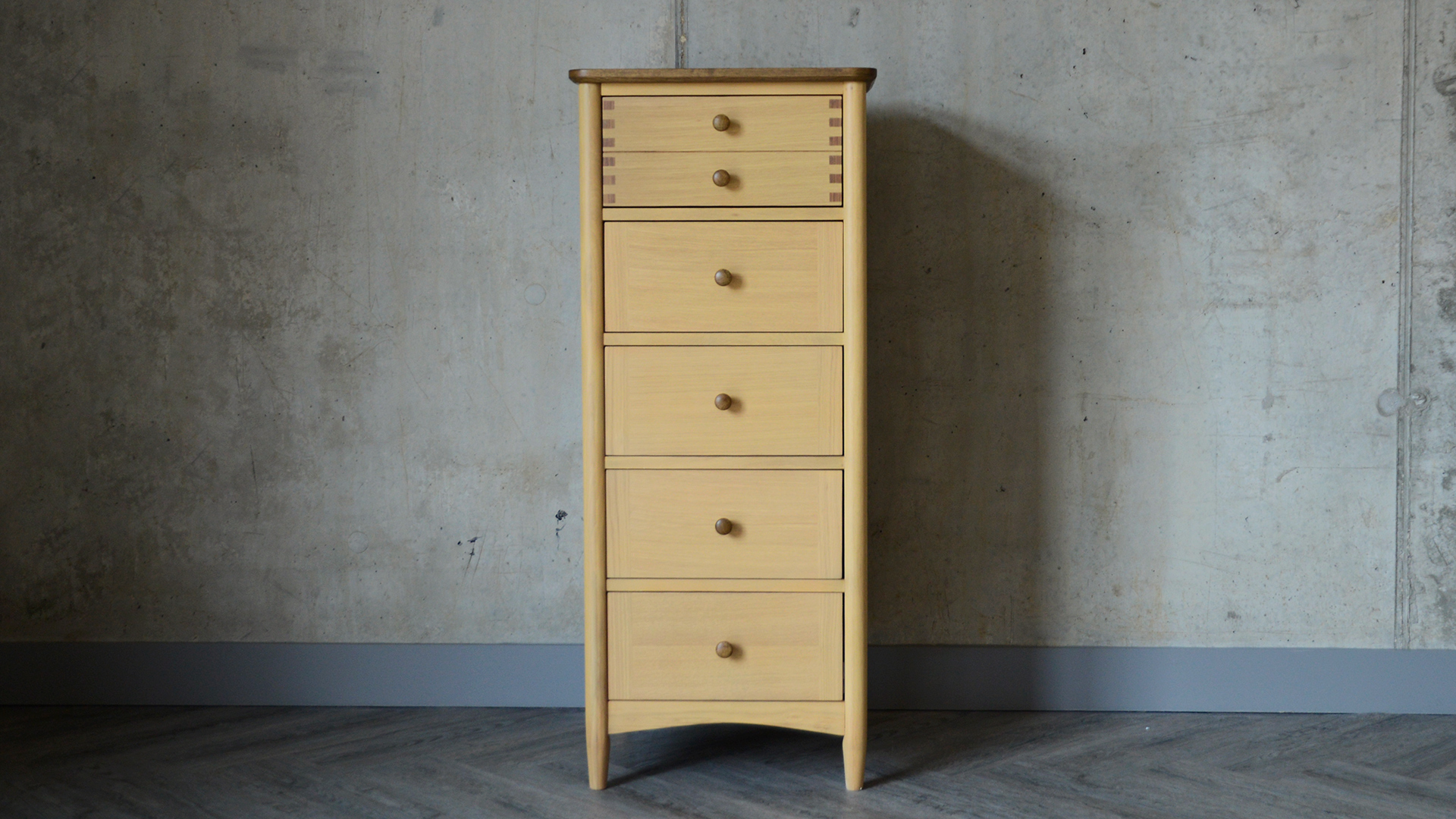 Strong and sturdy and endlessly versatile, this two tone five-drawer tallboy is equally at home in the bedroom, hall or lounge. Ideal for storing clothes, books or just odds and ends – wherever you need extra storage. Made from a mix of solid oak and oak veneers, with a stained oak top and matching handles.