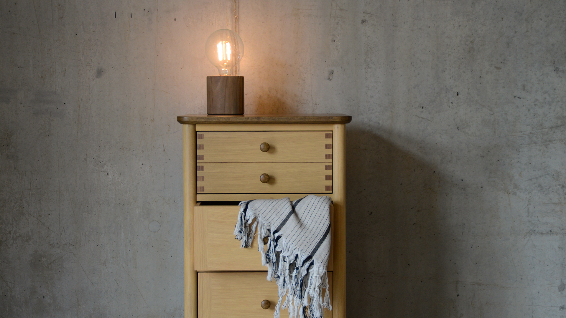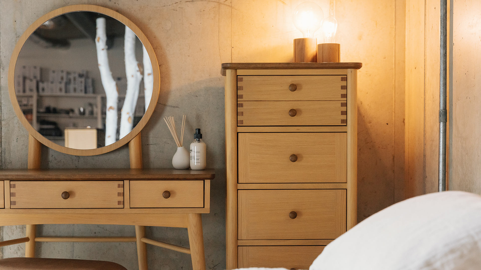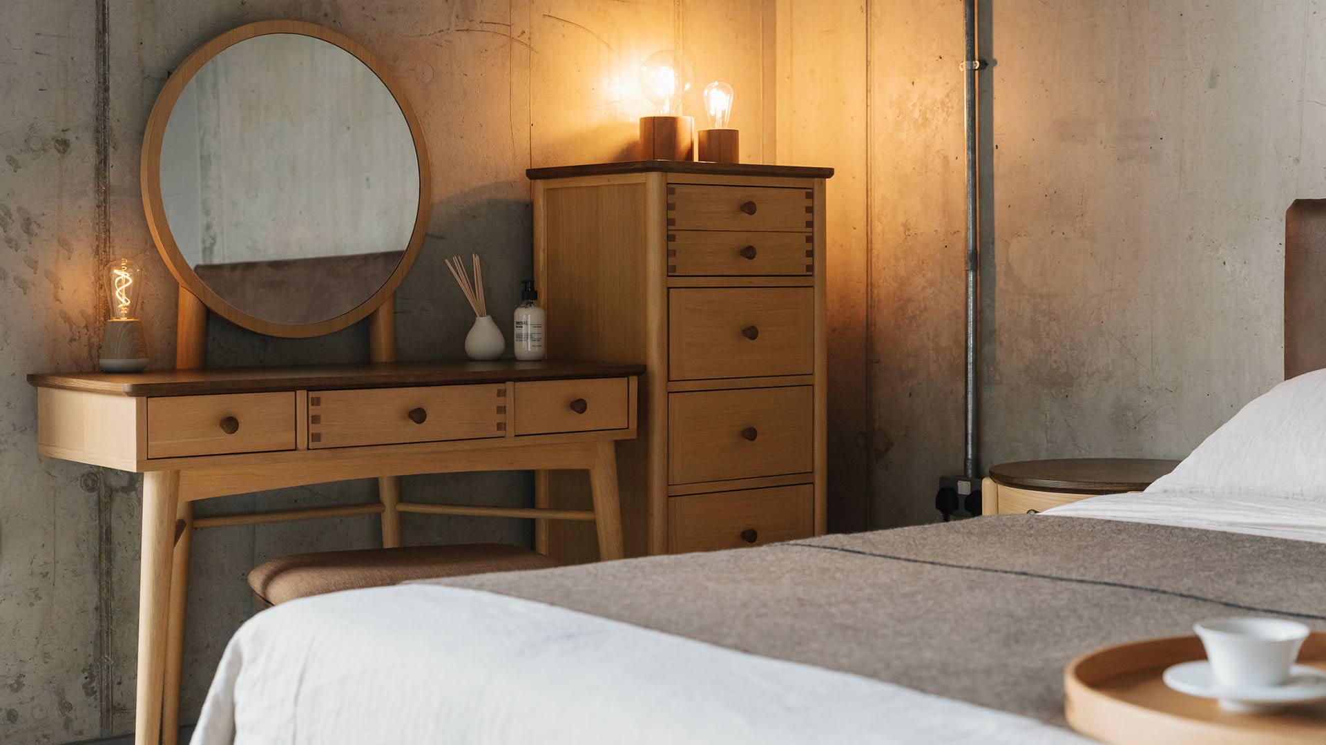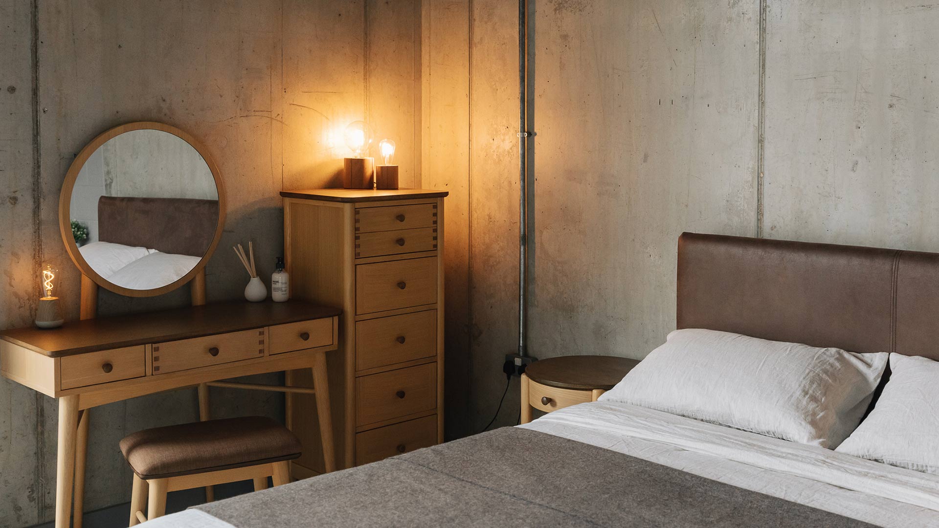 If you’re ordering to match a Natural Bed Company Bed – these pieces of furniture are made using a different species of oak to that we use to craft our own beds. They have a buttery tone, slightly less variable than the oak we use. However, oak does naturally warm and deepen over time, so they will likely be a better match as the timber ages. The paler golden tone of this oak and deep brown stained finish to the top means that this furniture range will work well with a range of timbers from light ash to deep walnut.