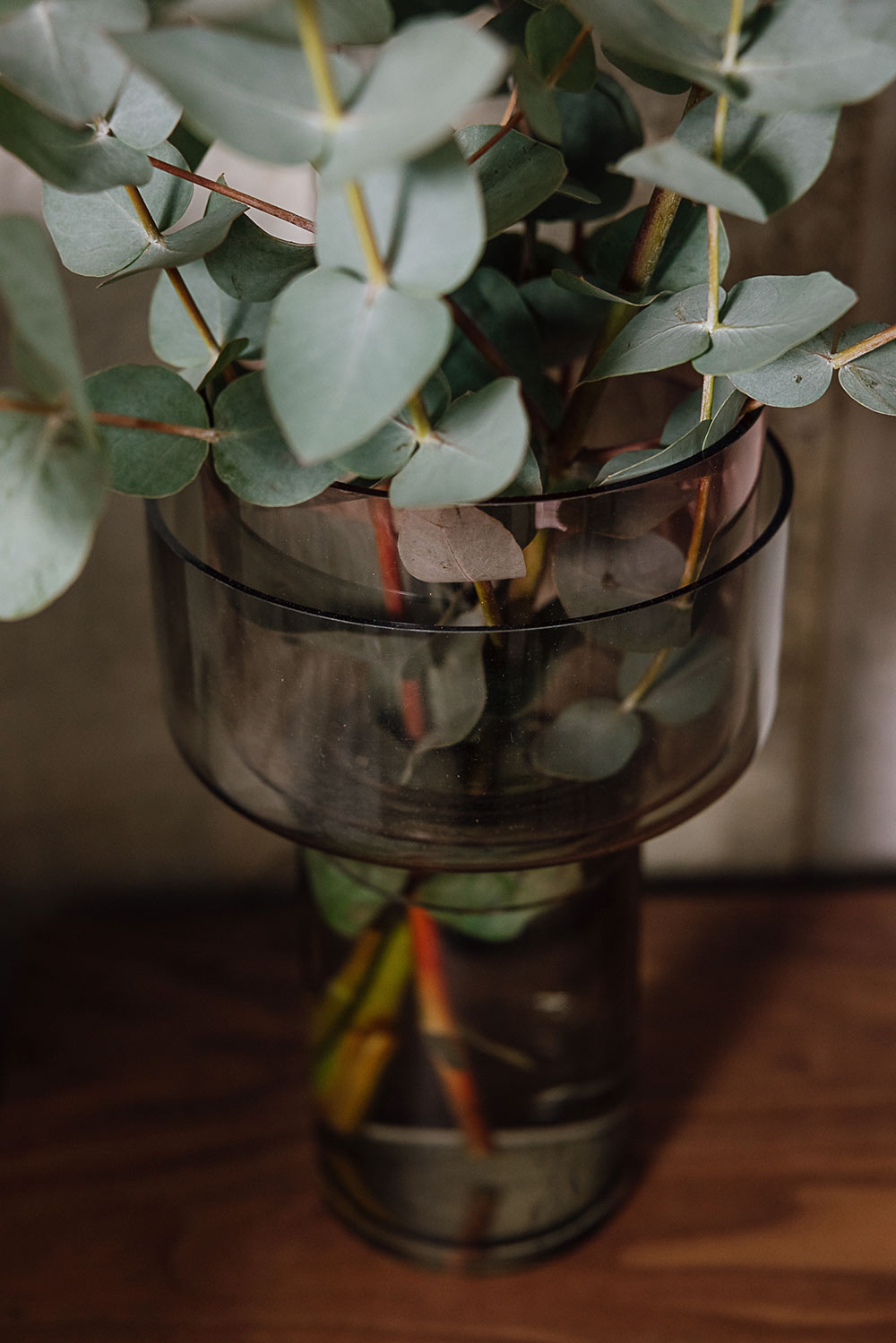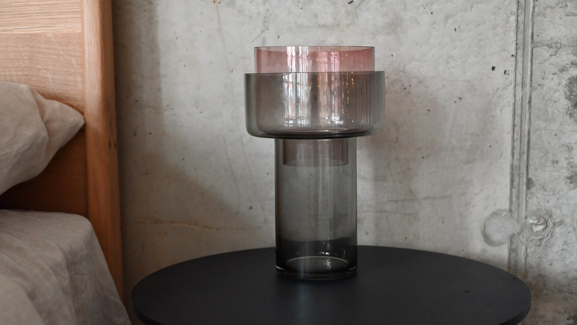This two tone glass vase has a moveable upper section that you can turn over depending on the bouquet size. The upper section is a muted purple and the lower section is a smoky grey. Its unique shape and two tone colour palette also makes it perfect decor, with or without flowers.