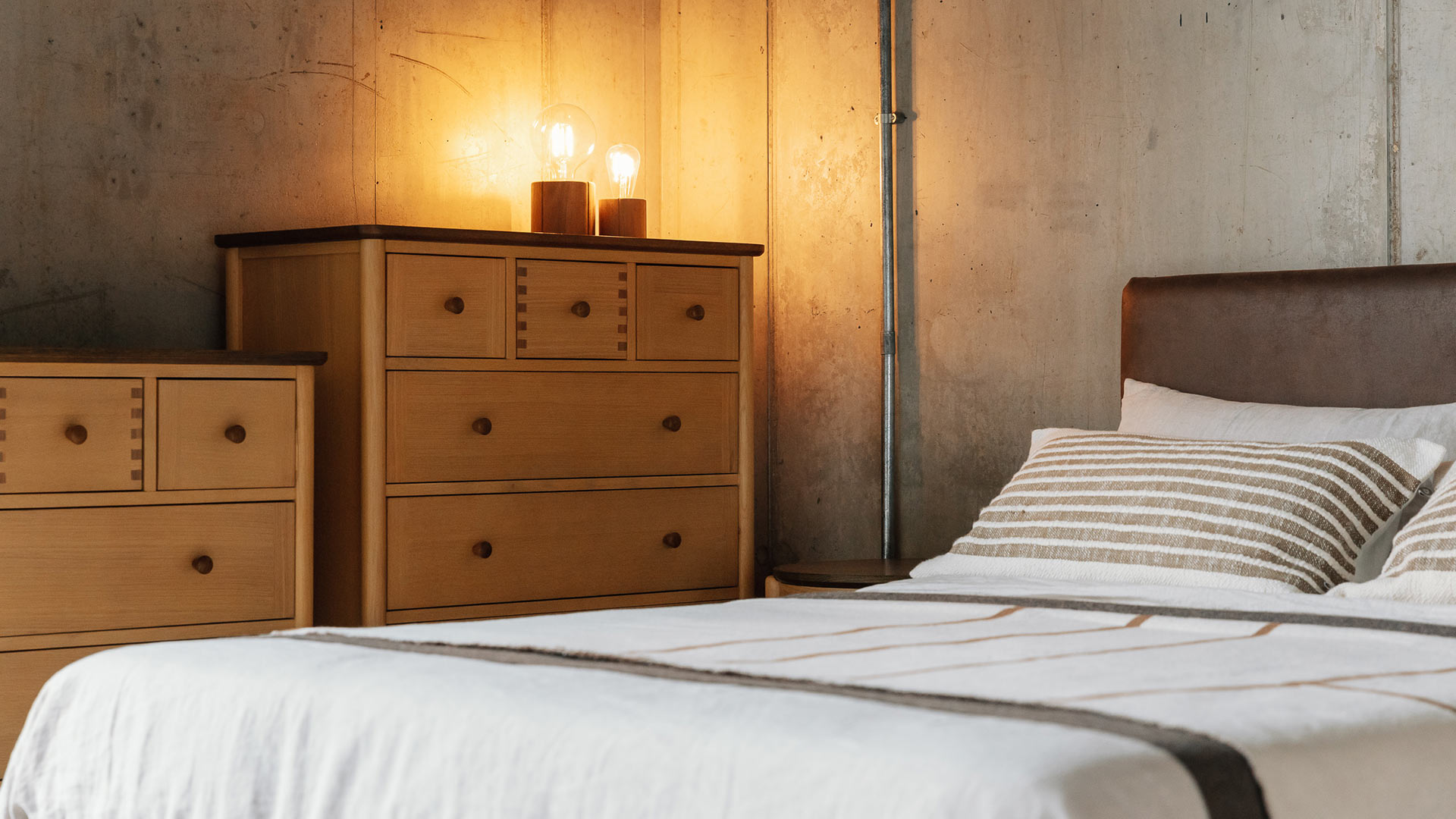 If you’re ordering to match a Natural Bed Company Bed – please note, these pieces of furniture are made using a different species of oak to that we use to craft our own beds. They have a buttery tone, slightly less variable than the oak we use. However, oak does naturally warm and deepen over time, so they will likely be a better match as the timber ages. The paler golden tone of this oak and deep brown stained finish to the top means that this furniture range will work well with a range of timbers from light ash to deep walnut.
