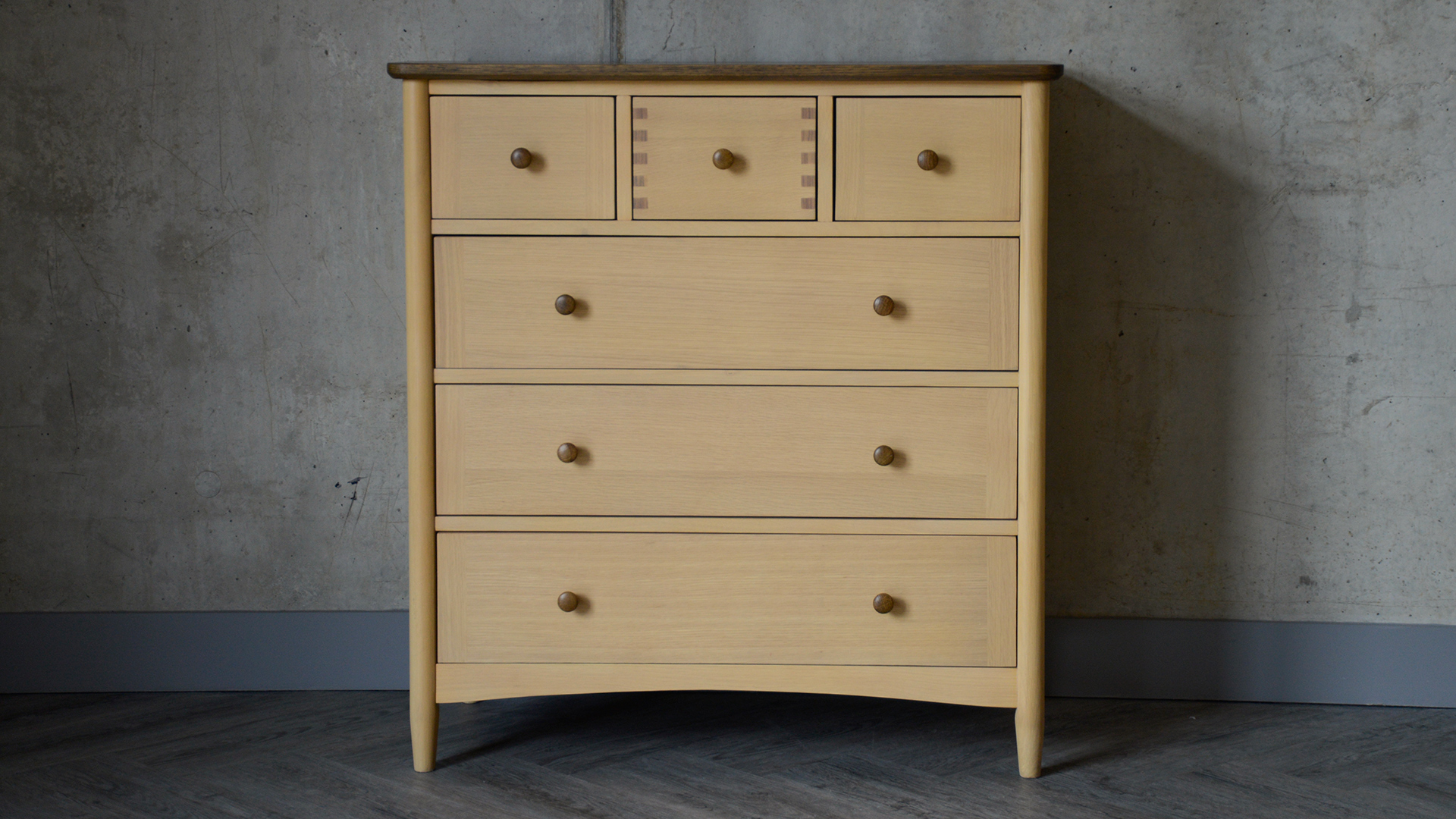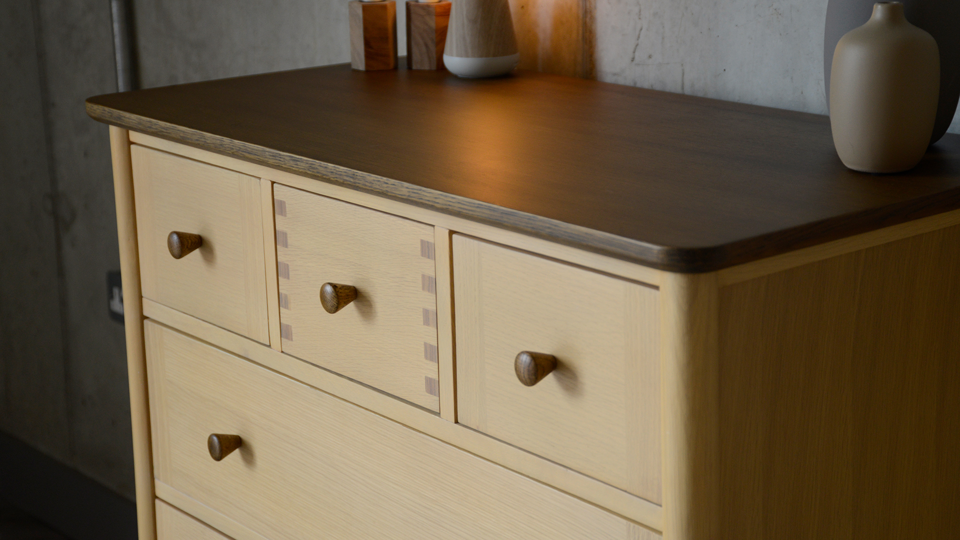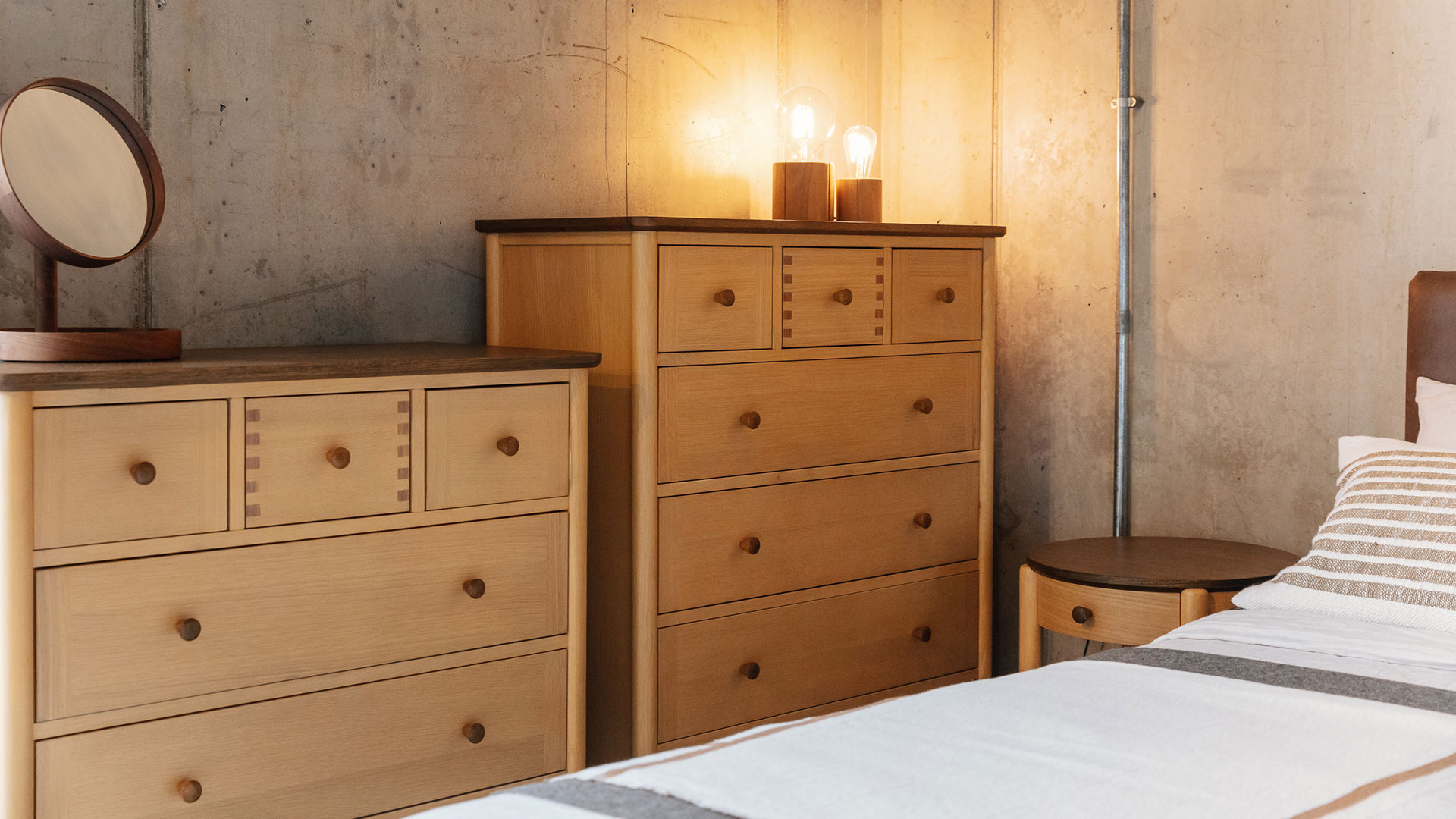 If you’re ordering to match a Natural Bed Company Bed – please note, these pieces of furniture are made using a different species of oak to that we use to craft our own beds. They have a buttery tone, slightly less variable than the oak we use. However, oak does naturally warm and deepen over time, so they will likely be a better match as the timber ages. The paler golden tone of this oak and deep brown stained finish to the top means that this furniture range will work well with a range of timbers from light ash to deep walnut.
