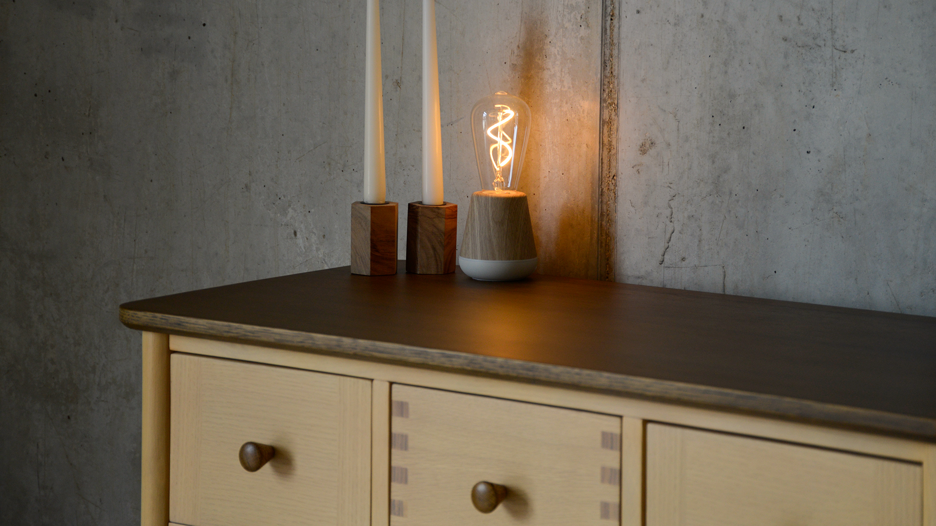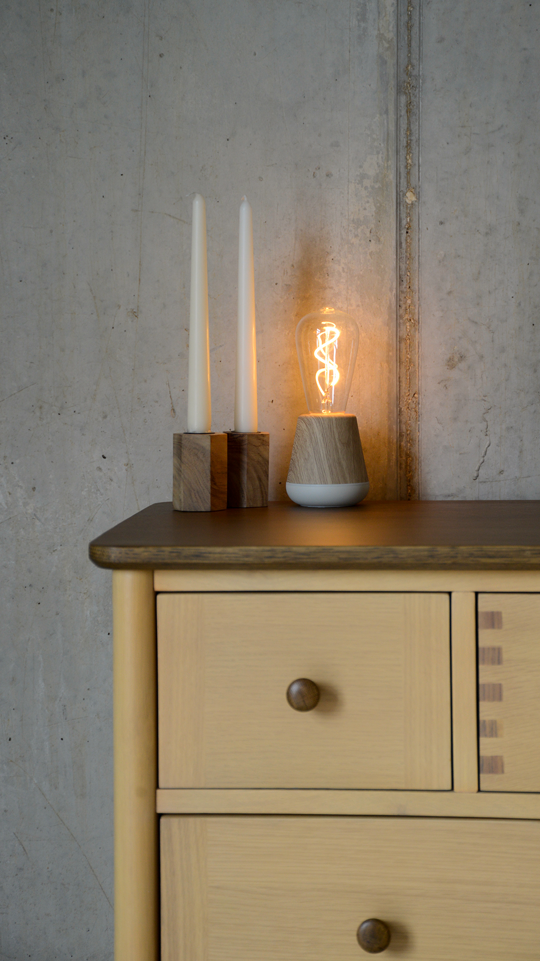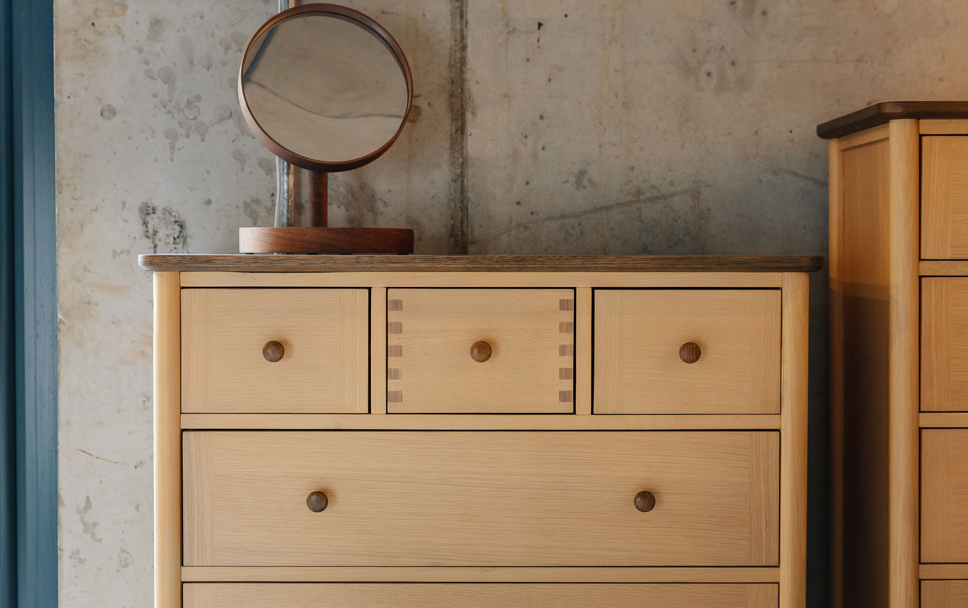 If you’re ordering to match a Natural Bed Company Bed – please note, these pieces of furniture are made using a different species of oak to that we use to craft our own beds. They have a buttery tone, slightly less variable than the oak we use. However, oak does naturally warm and deepen over time, so they will likely be a better match as the timber ages. The paler golden tone of this oak and deep brown stained finish to the top means that this furniture range will work well with a range of timbers from light ash to deep walnut.