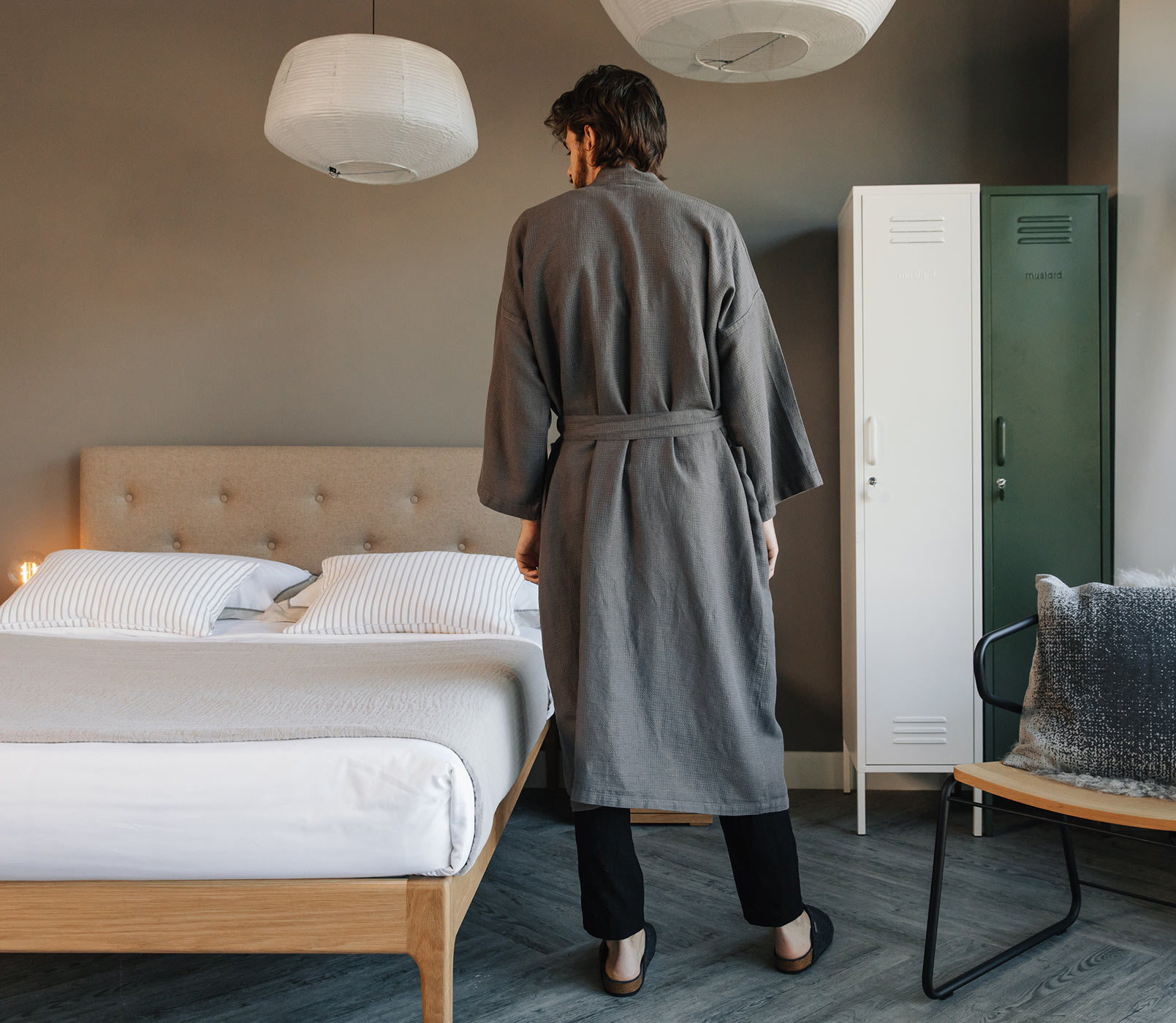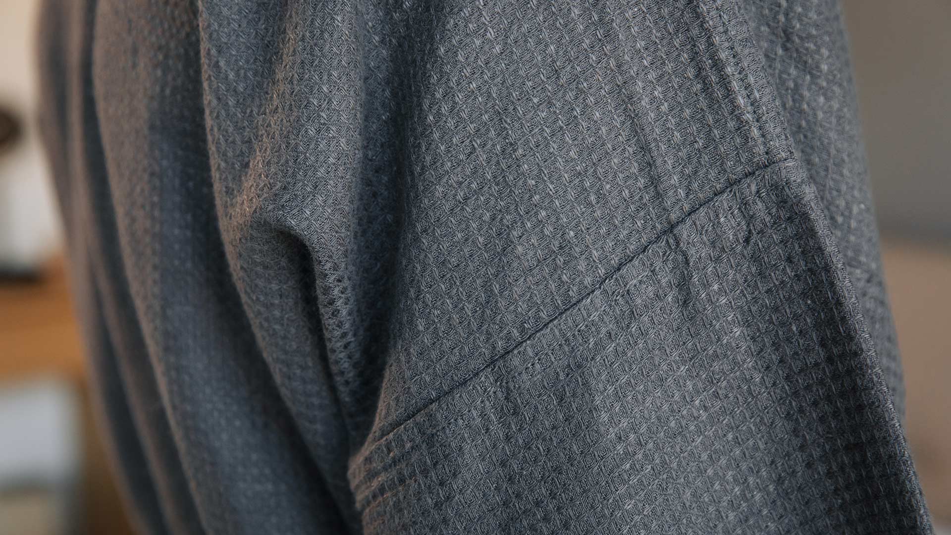 A unisex, linen bath robe in a dark grey fabric with a very subtle waffle look texture. The pure linen, textured weave is super soft on the skin – perfect for everyday use. The robe has two deep pockets and a tie belt. This unisex linen bath robe is made of gorgeous, draping fabric – the classic linen look. Perfect as a treat for yourself, or as a gift for a friend.