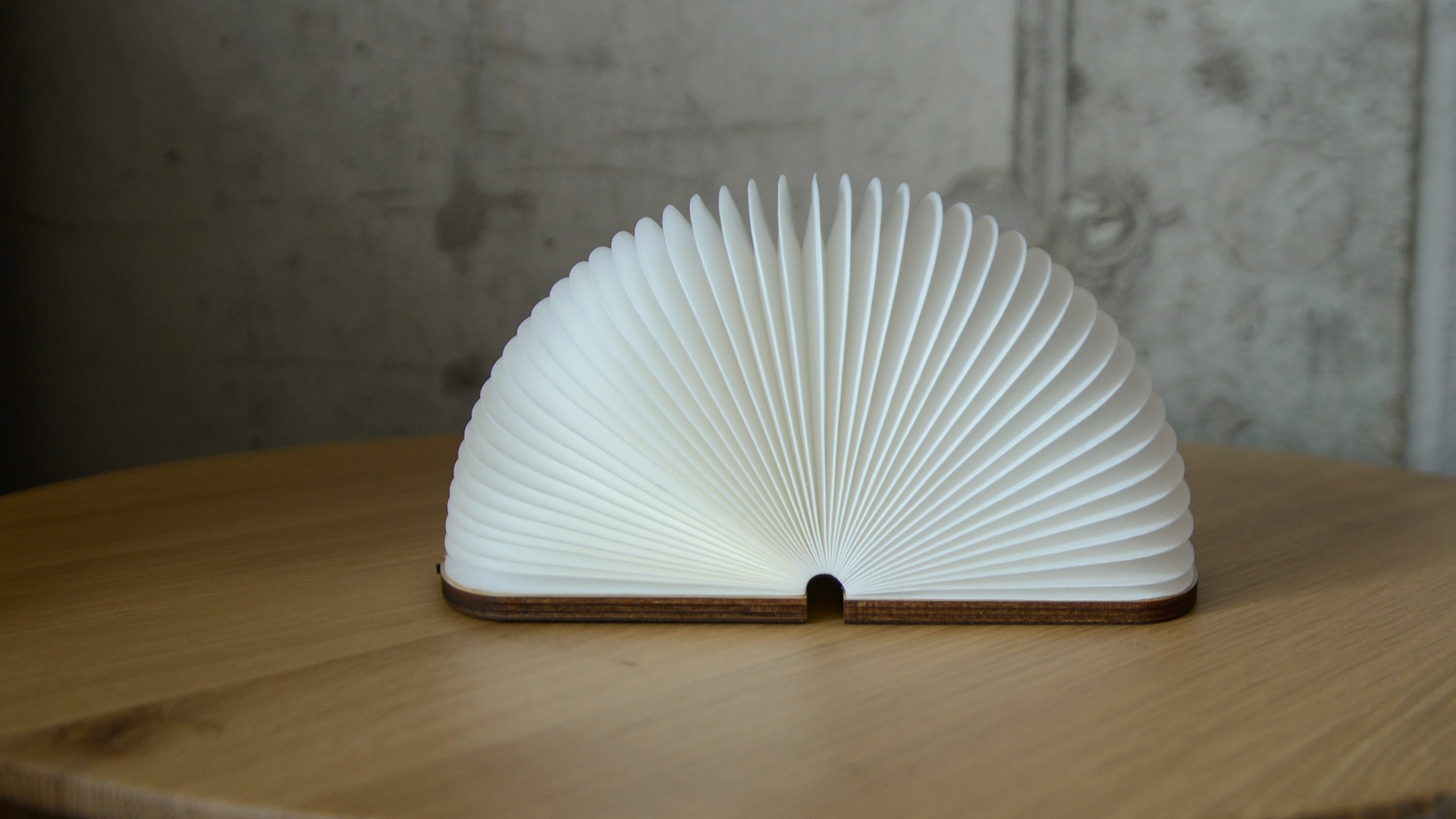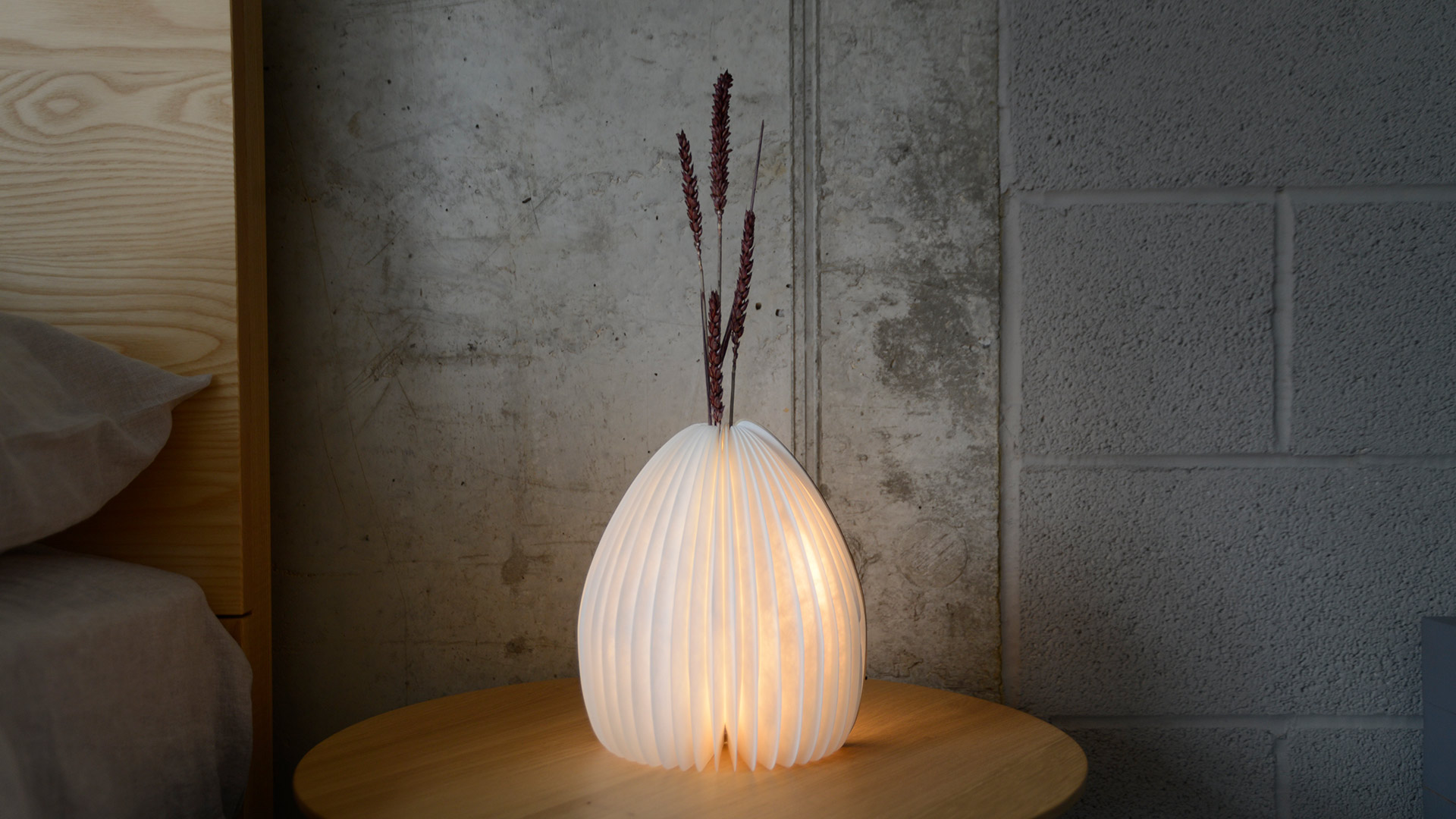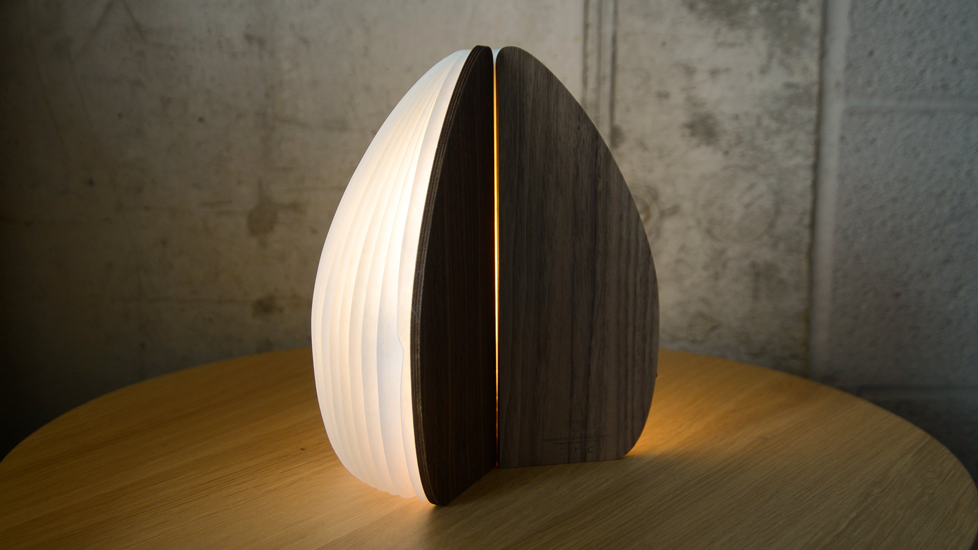 Hidden inside the lamp is a heat and water-safe tube for filling with your favourite flowers. Made with special heat-safe and water proof Tyvek paper that emits a warm ambient light from within, the fan-like design can also be folded for easy storage. To open again, simply pull the lamp back around till the magnets touch together. The base is finished in walnut.