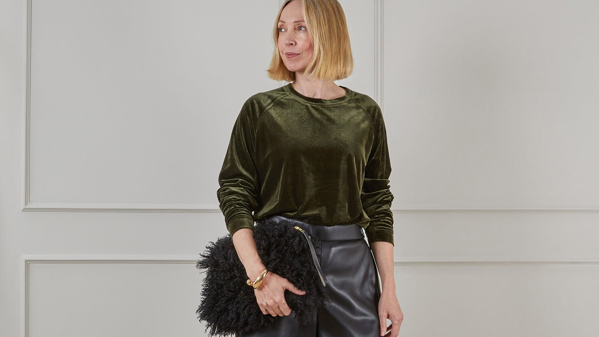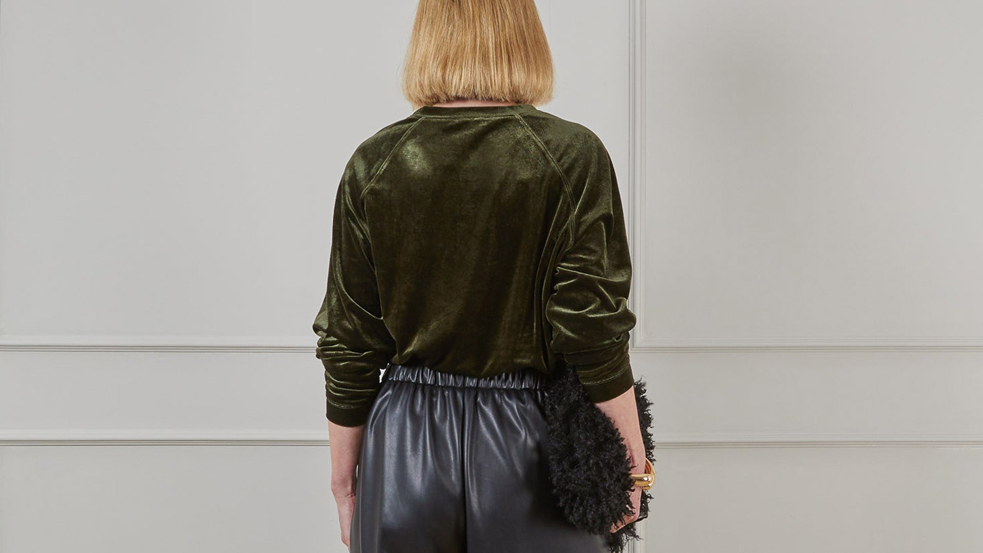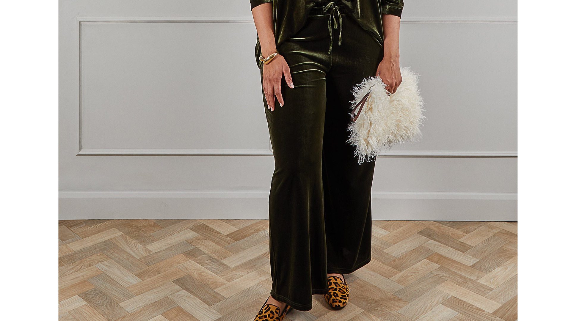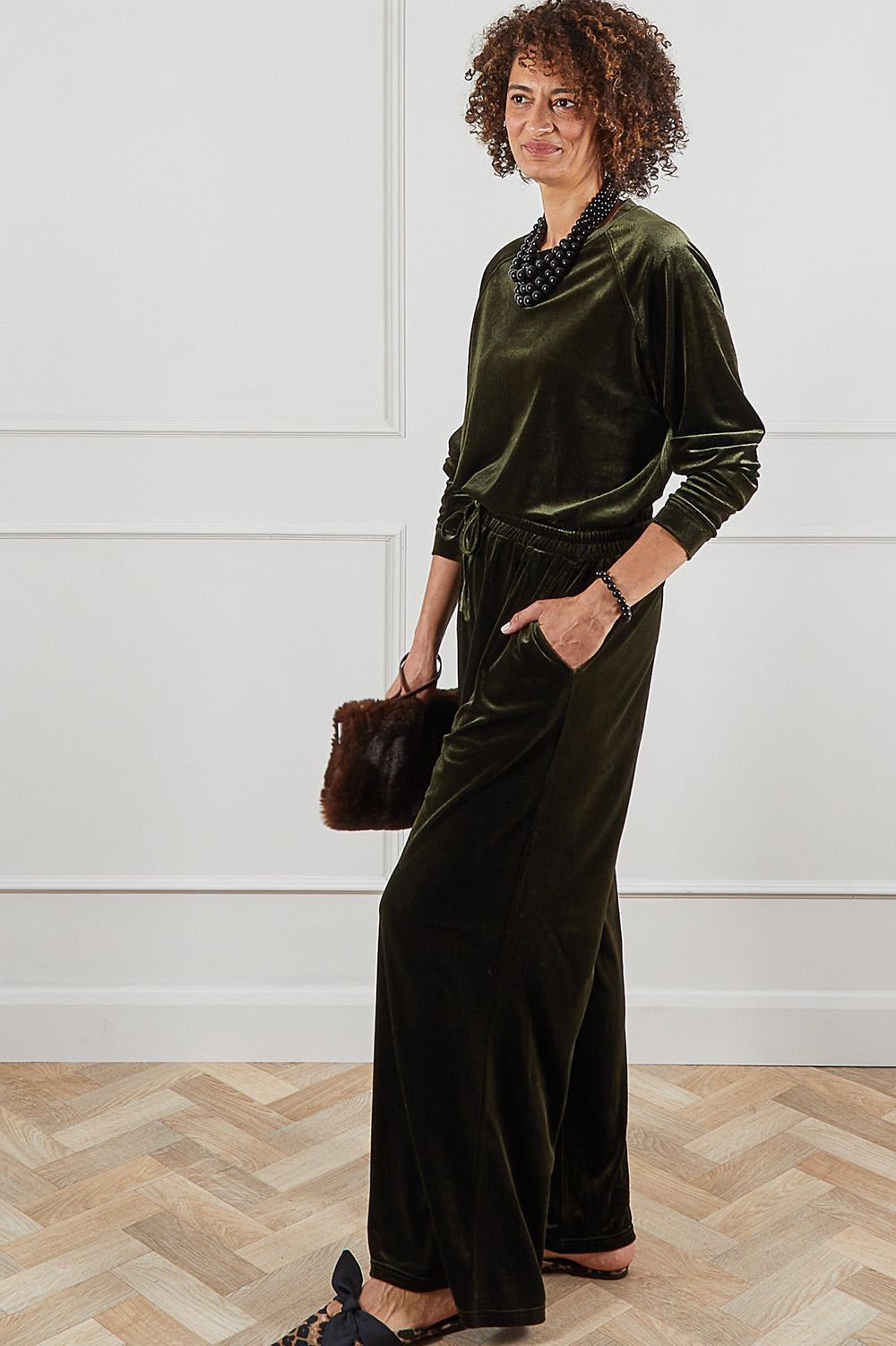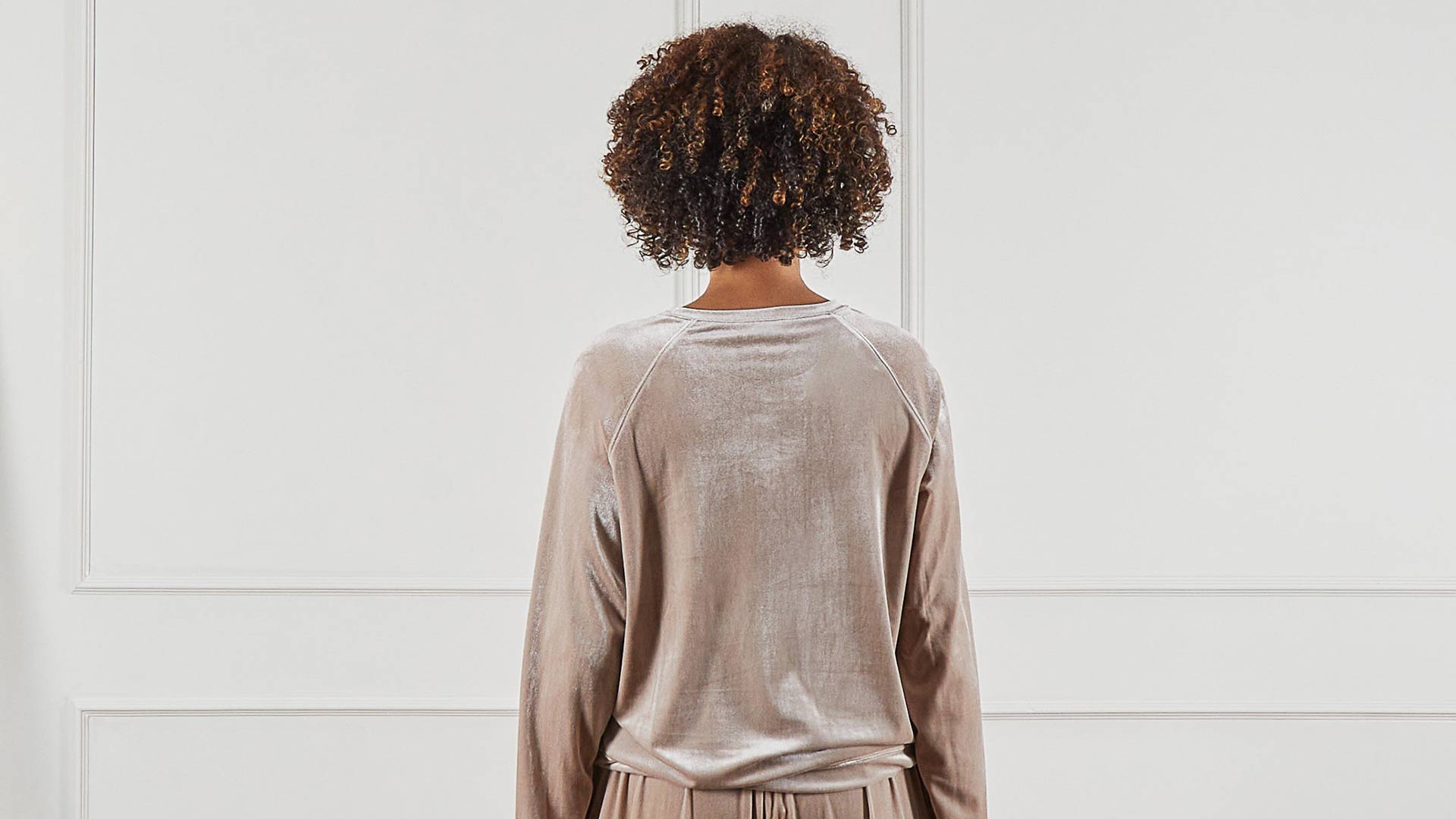 A set of luxury velour loungewear. These long-sleeved tops and relaxed trousers are available here in a deep, pine green and a light, shimmery champagne colour-way. Super-soft to the touch, this velour loungewear set is perfect for wearing around the house or even out and about. The luxurious texture and feel means both the bottoms and top can be dressed up, but they’re comfortable enough for a day on the sofa.