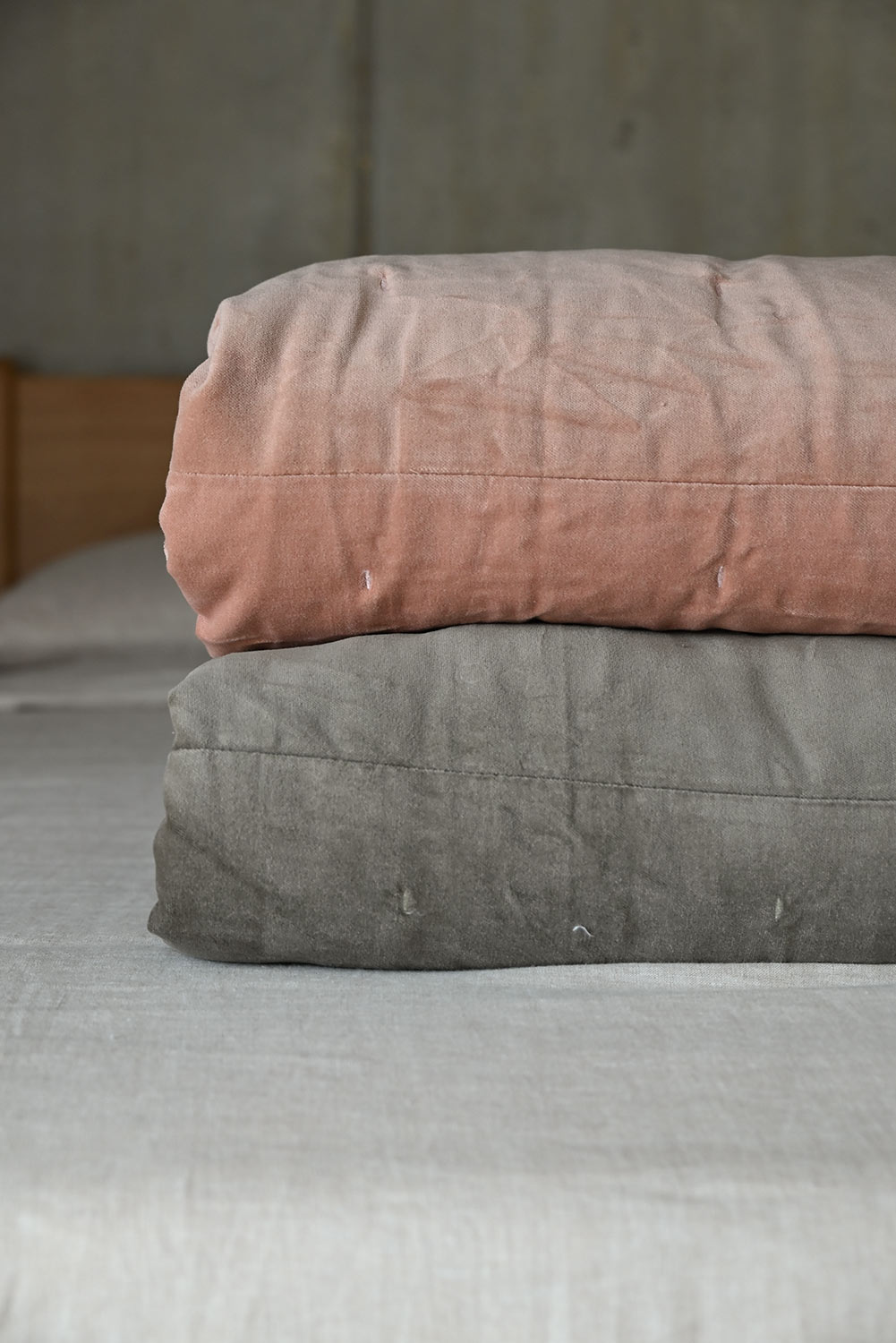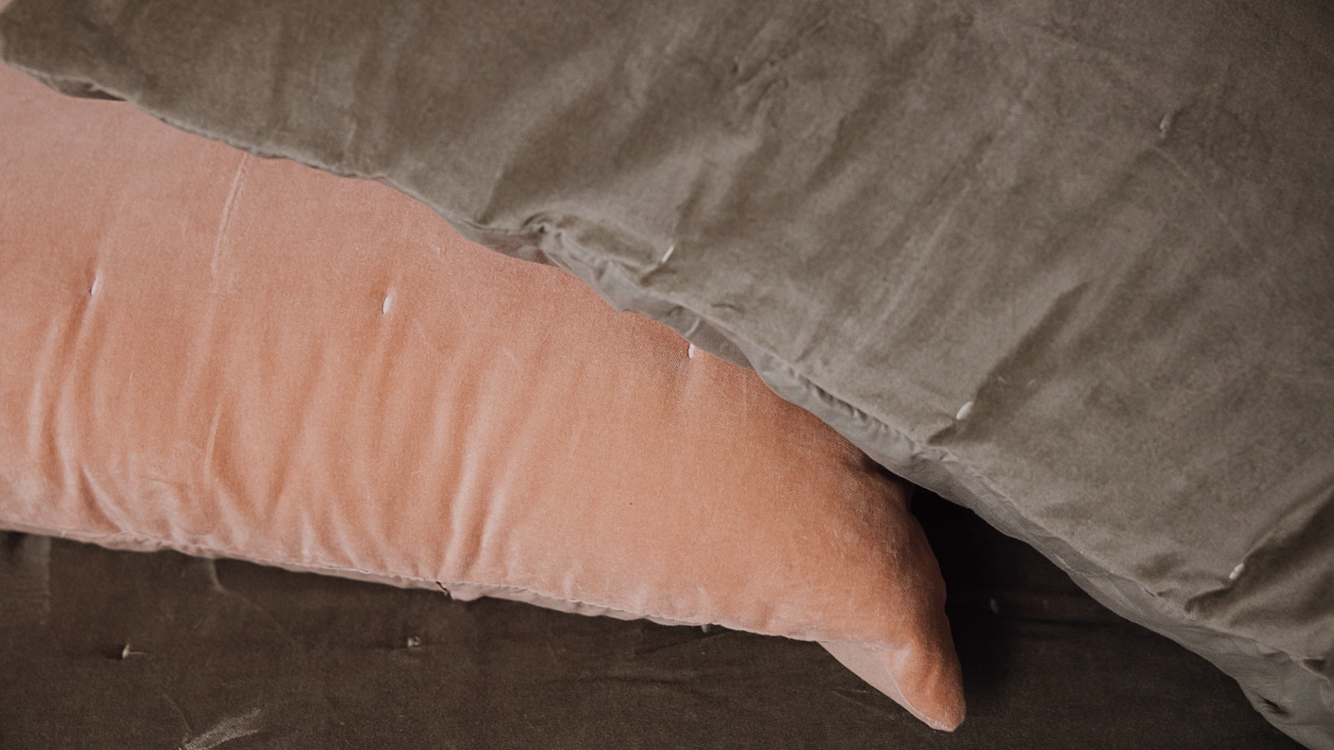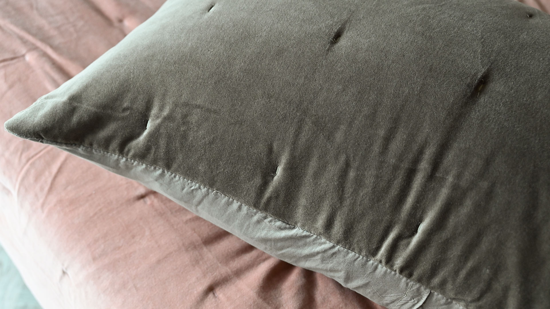 Blush Rose: a soft, warm shade of rosy pink – can look lighter or darker in certain lights depending on the direction of the velvet pile Muted Olive: a washed, muffled shade of olive green with a grey cast – can look warmer or cooler in certain lights, and lighter or darker depending on the direction of the velvet pile.