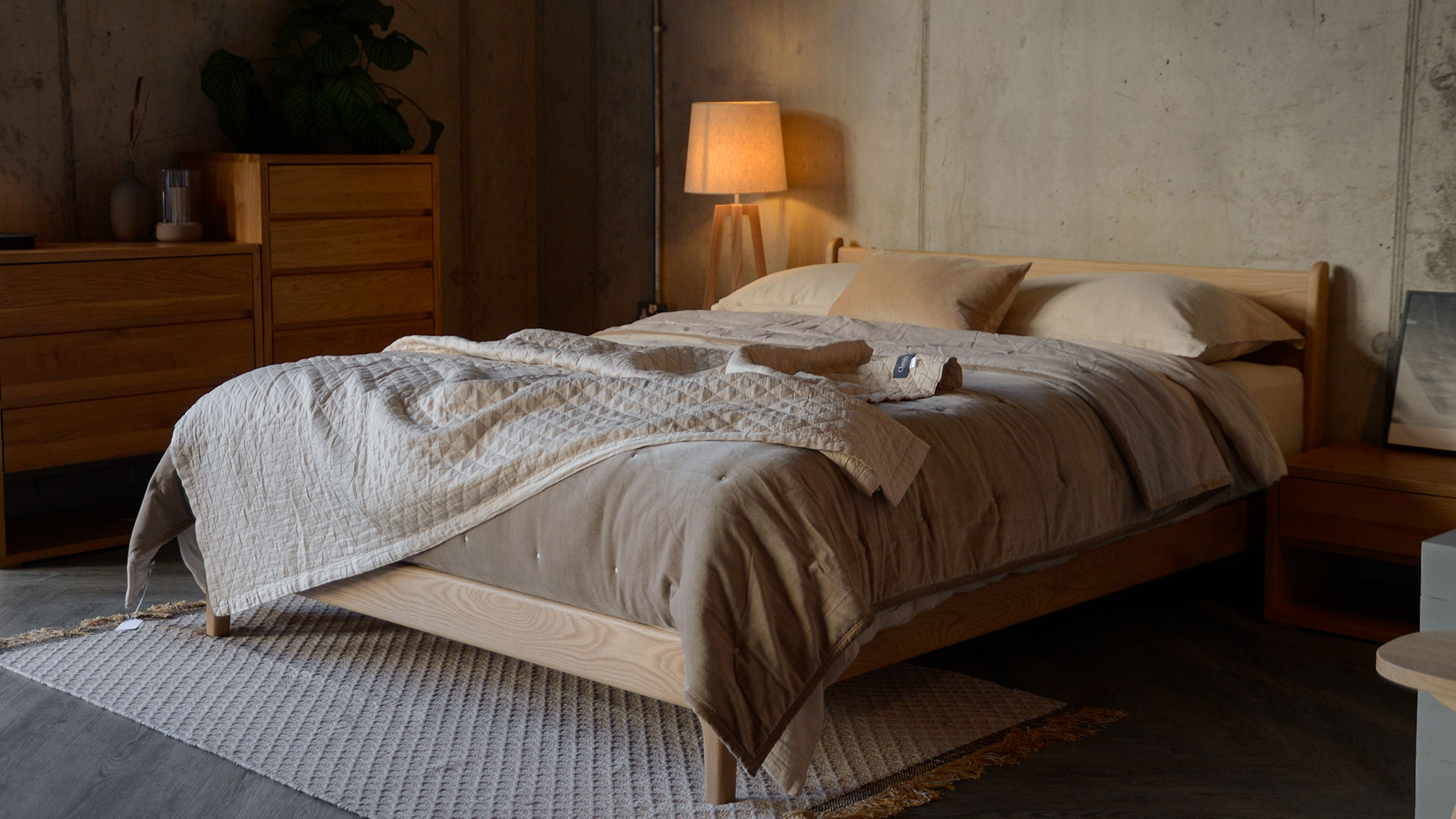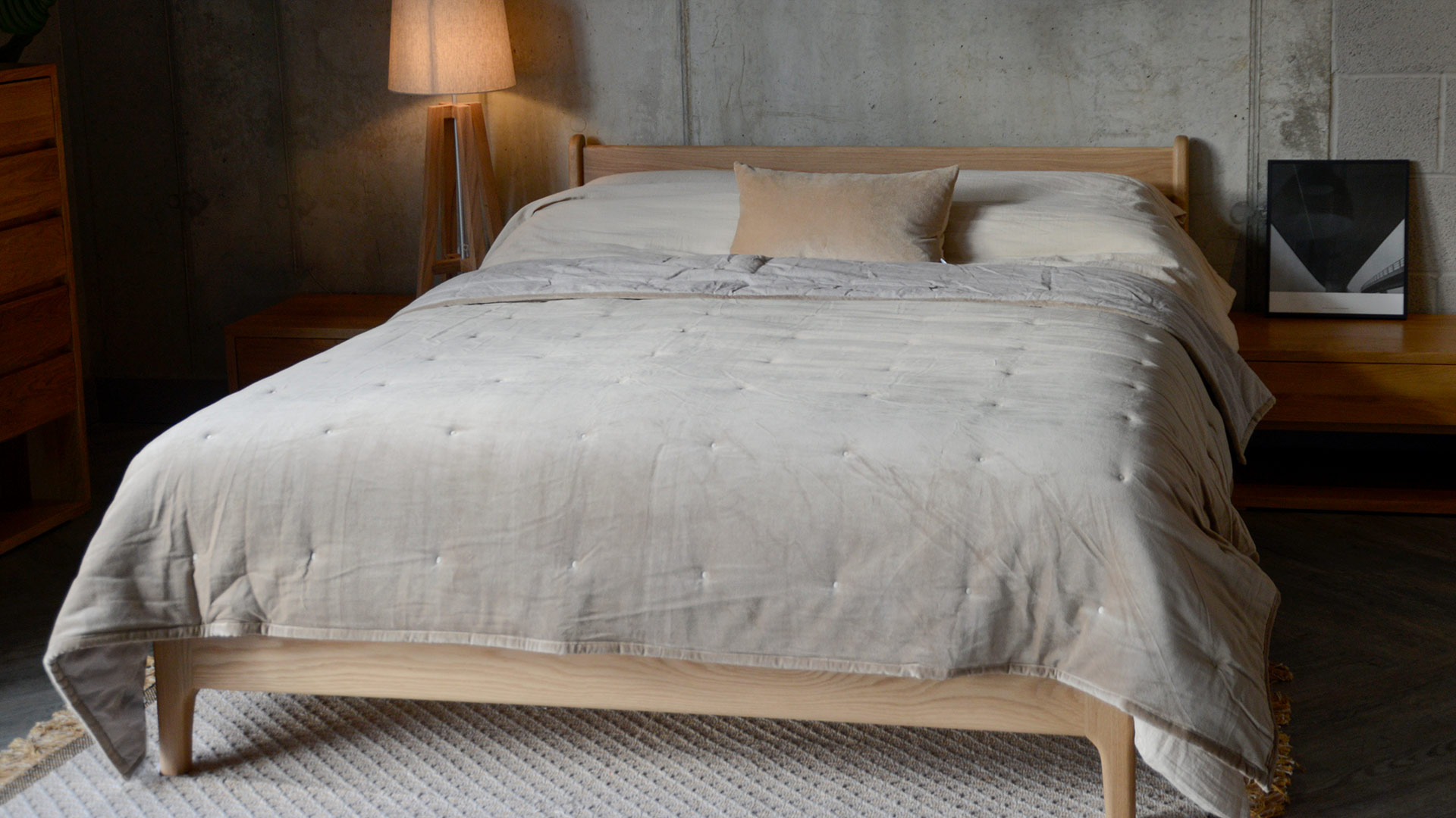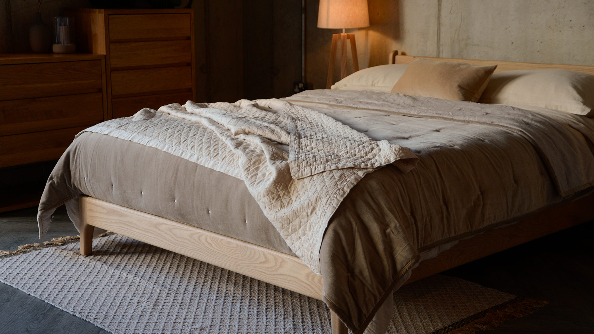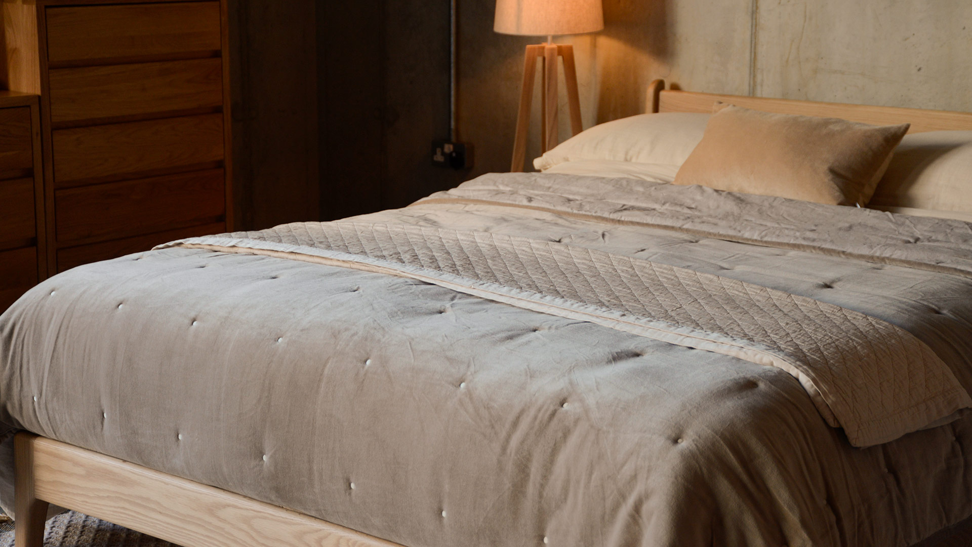 A velvet and cotton, reversible bedspread. One side has a cover in 100% cotton velvet in a pale hazelnut brown. The reverse has a natural, linen look cover in a muted limestone colour.