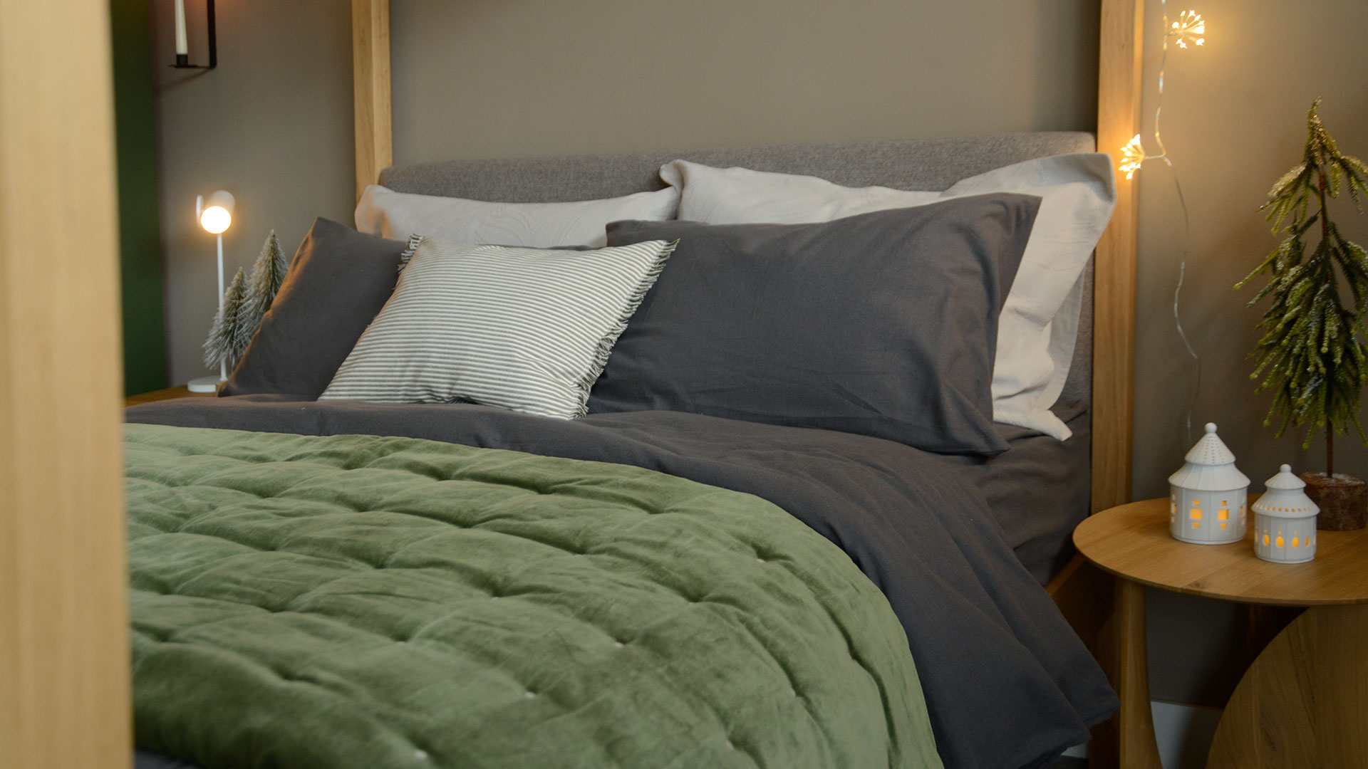 A velvet and cotton, reversible bedspread. One side has a cover in 100% cotton velvet in a deep olive green. The reverse has a natural, linen look cover in a muted limestone colour.