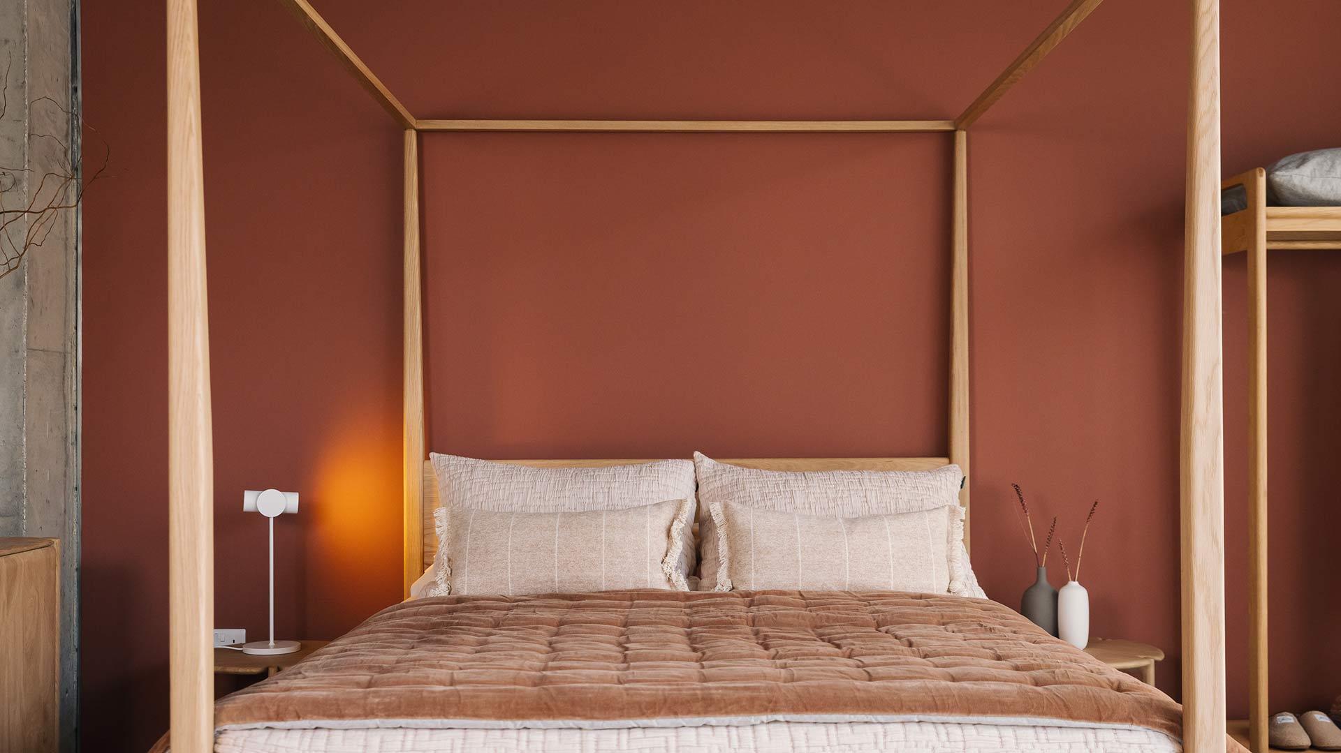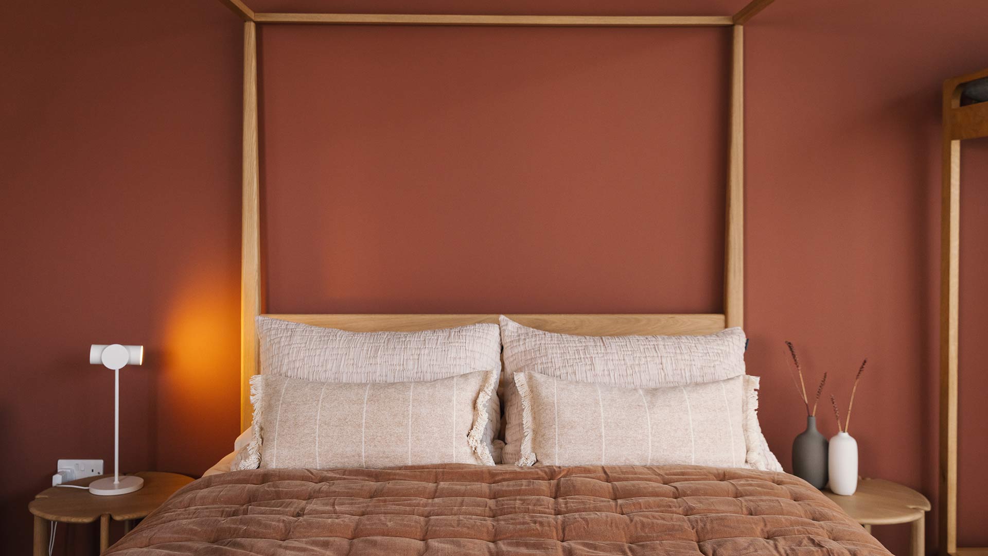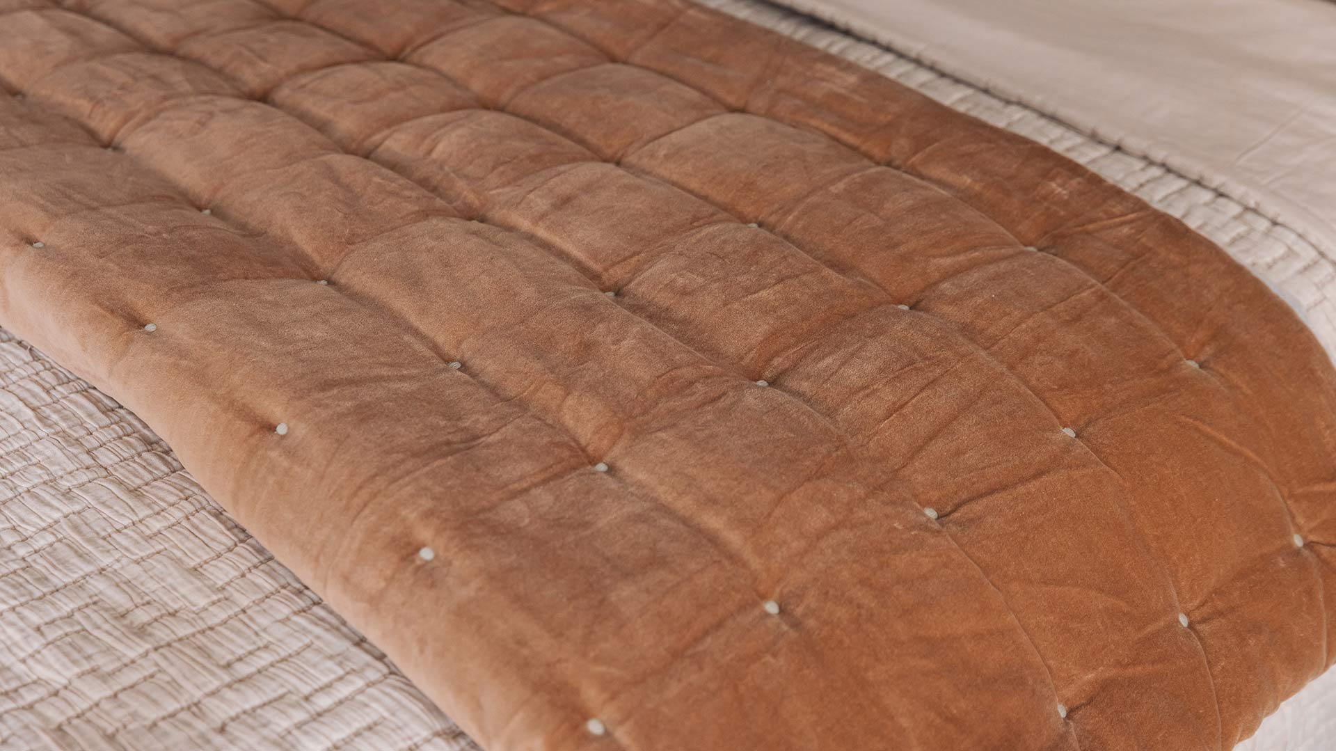 A velvet and cotton, reversible quilt. One side has a cover in 100% cotton velvet in a warm yet muted cinnamon shade. The reverse has a natural, linen look cover in a muted limestone colour.