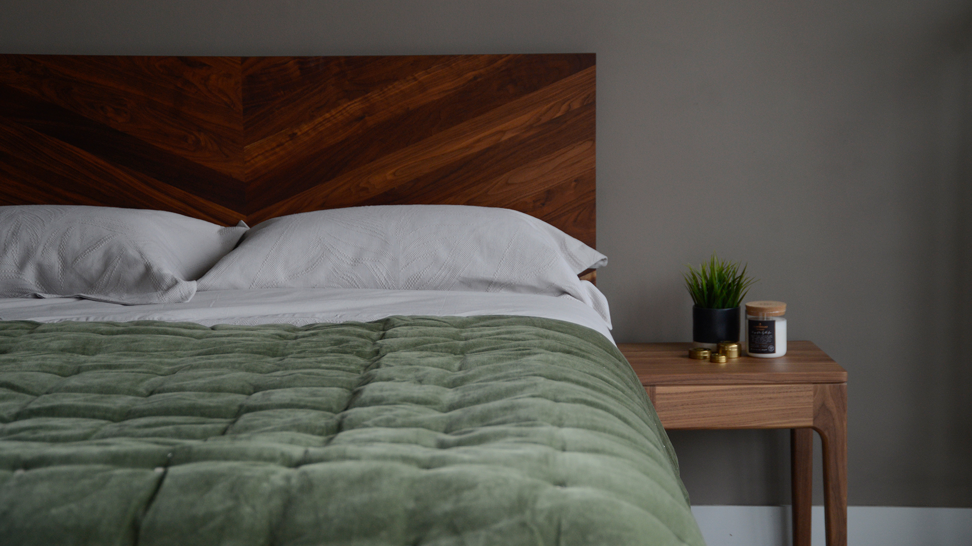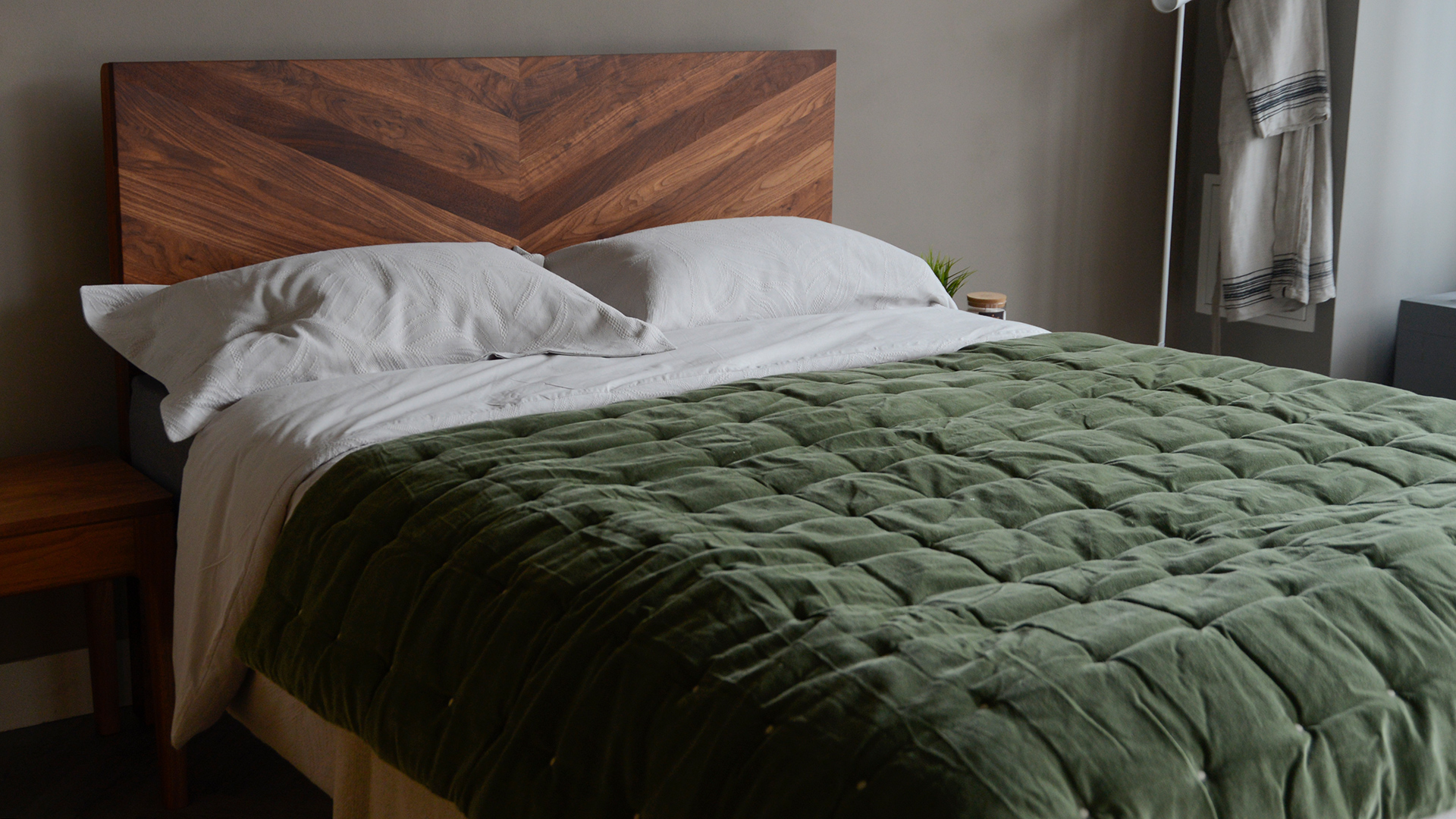 A velvet and cotton, reversible quilt. One side has a cover in 100% cotton velvet in a soft olive-green. The reverse has a natural linen look reverse cover in a muted limestone colour.