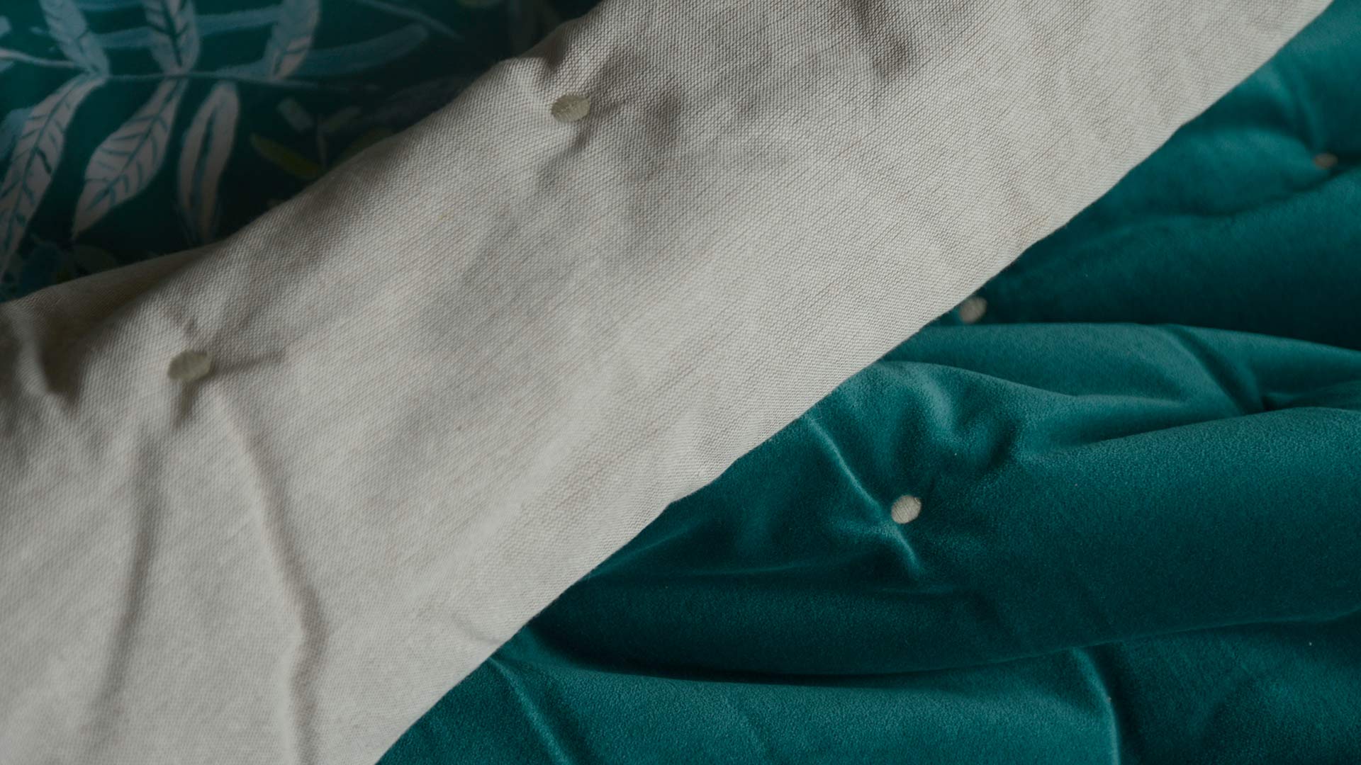A velvet and cotton, reversible quilt. One side has a cover in 100% cotton velvet in a greenish-teal colour shade. The reverse has a natural, linen-look cotton cover in a pale limestone colour. The stitched detail to create the quilted effect is in a matching pale golden limestone colour.