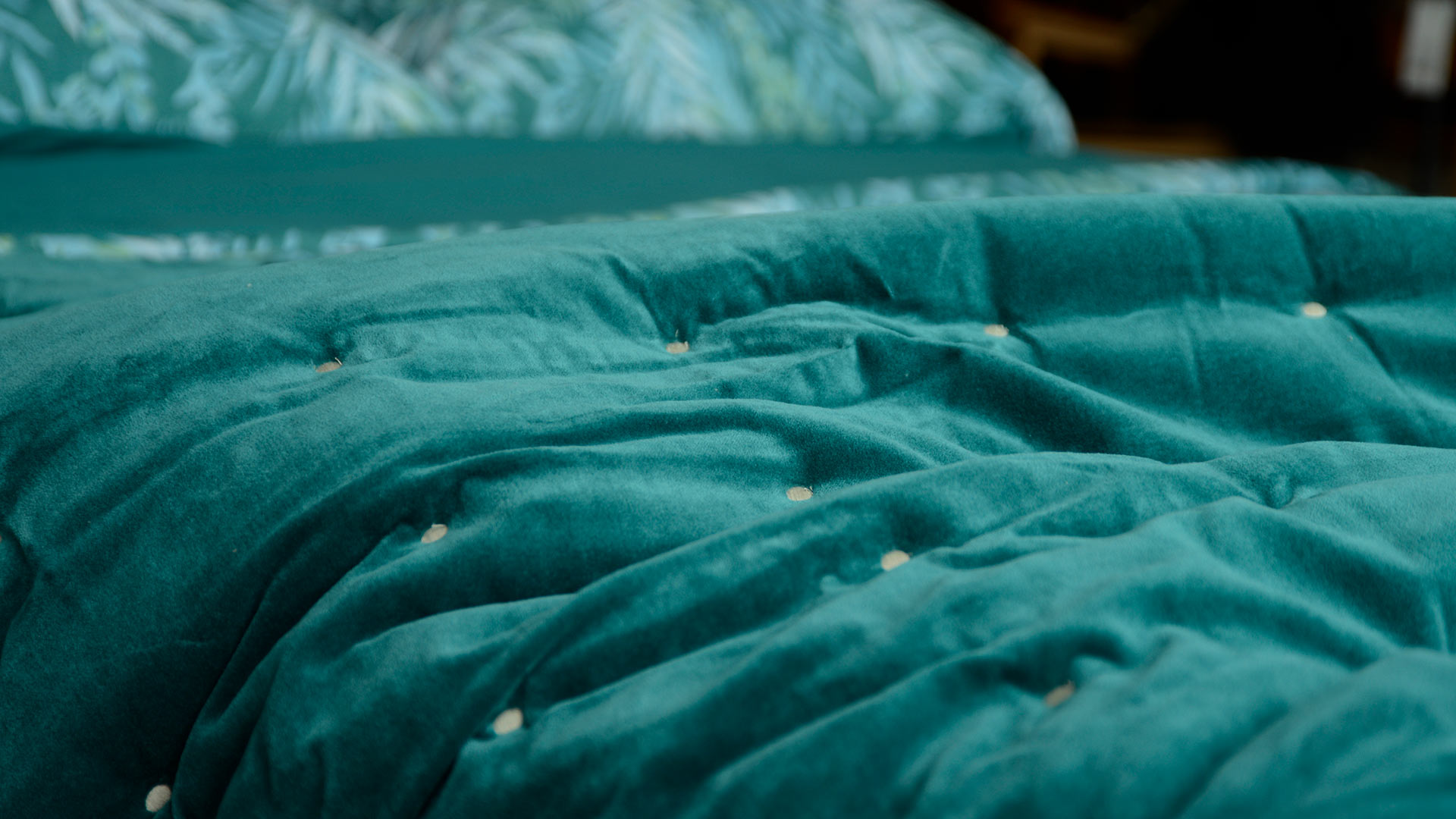 A velvet and cotton, reversible quilt in 100% cotton velvet with a natural cotton fabric reverse. The velvet fabric is in a deep greenish-blue colour, the cotton fabric reverse is in a limestone colour. A bright, bold teal shade – ideal for making a statement in your bedding scheme. Add a pop of colour in a neutral scheme, or match with similar teal shades for a monochromatic look.