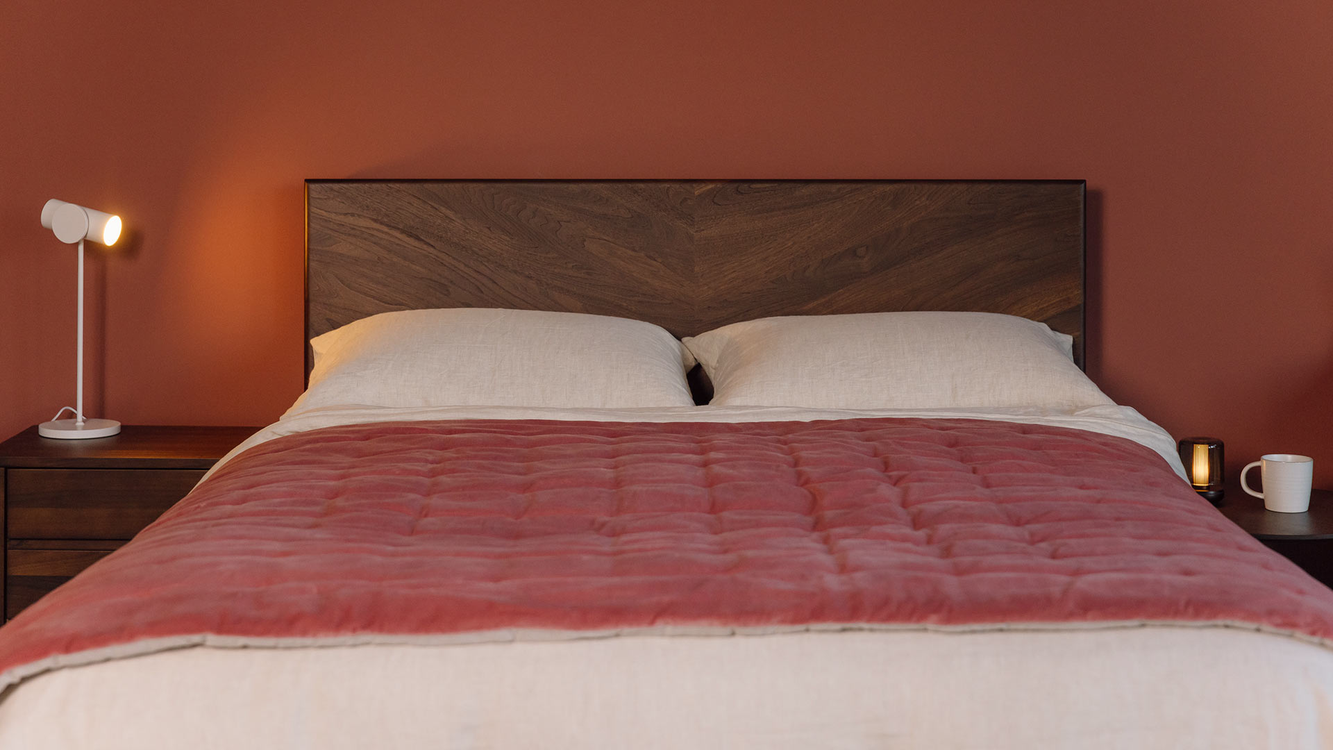 A velvet and cotton, reversible quilt. One side has a cover in 100% cotton velvet in classic vintage pink shade. The reverse has a natural, linen look cover in a muted limestone colour.