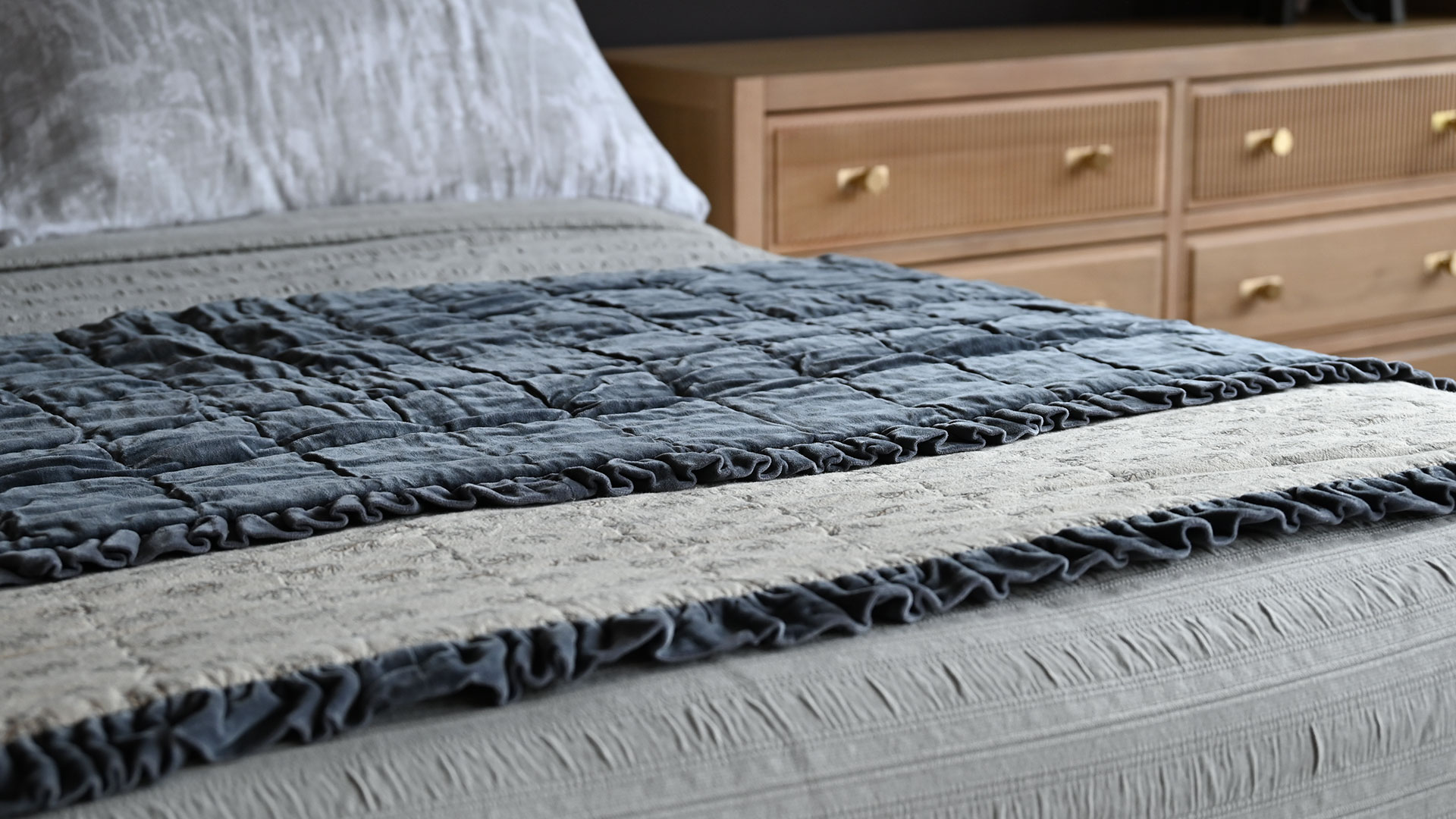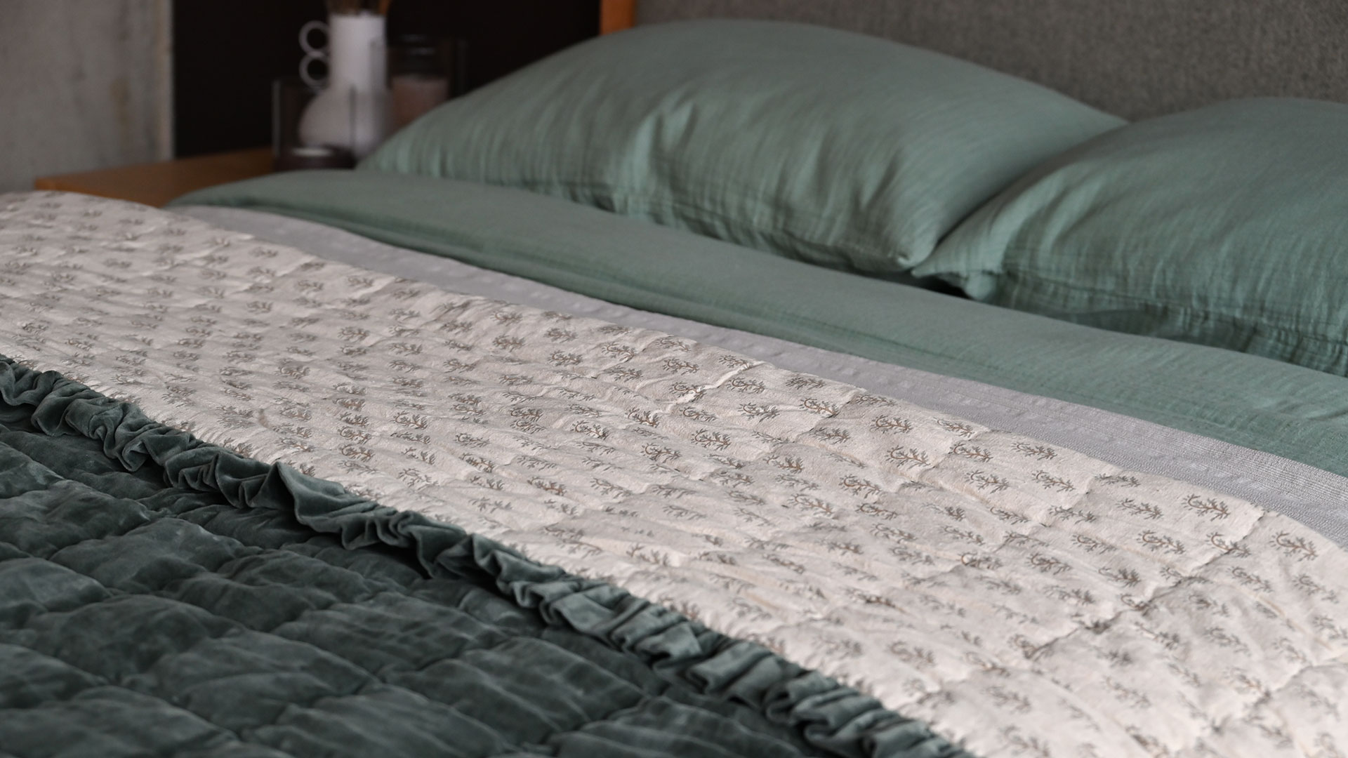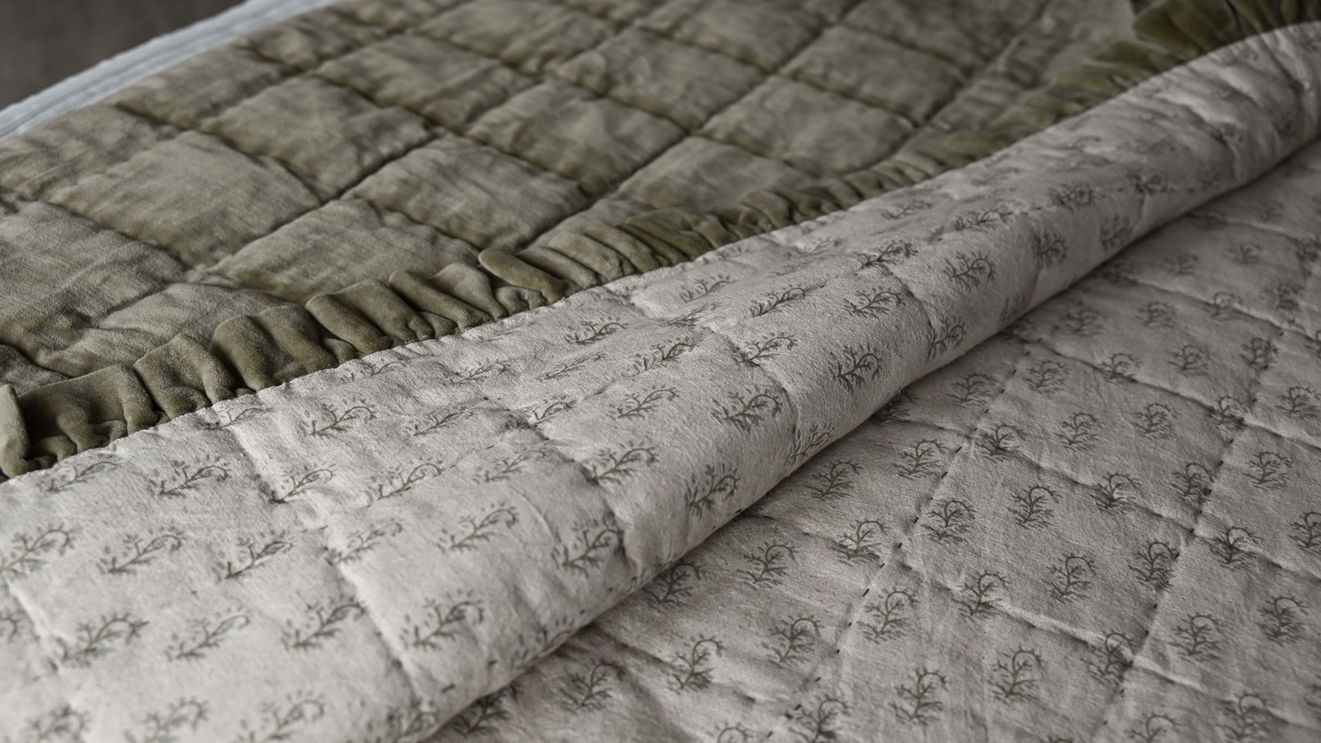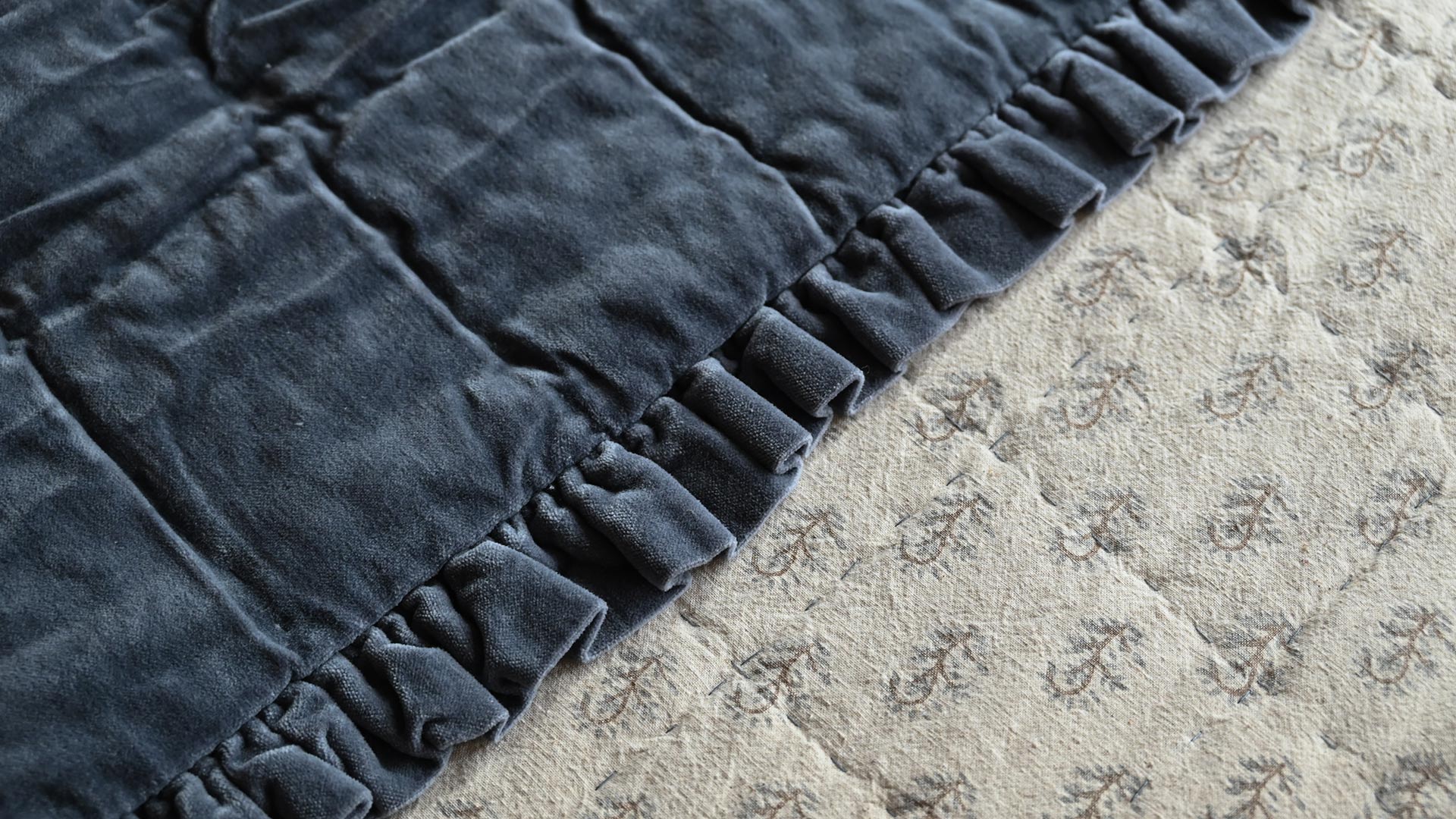 Finished with a delicate velvet ruffle border on all four sides, this bedspread adds a refined, feminine touch to any space. Available in olive green, blush pink, indigo blue and forest green. It’s the perfect way to refresh your bedroom with comfort and sophistication.