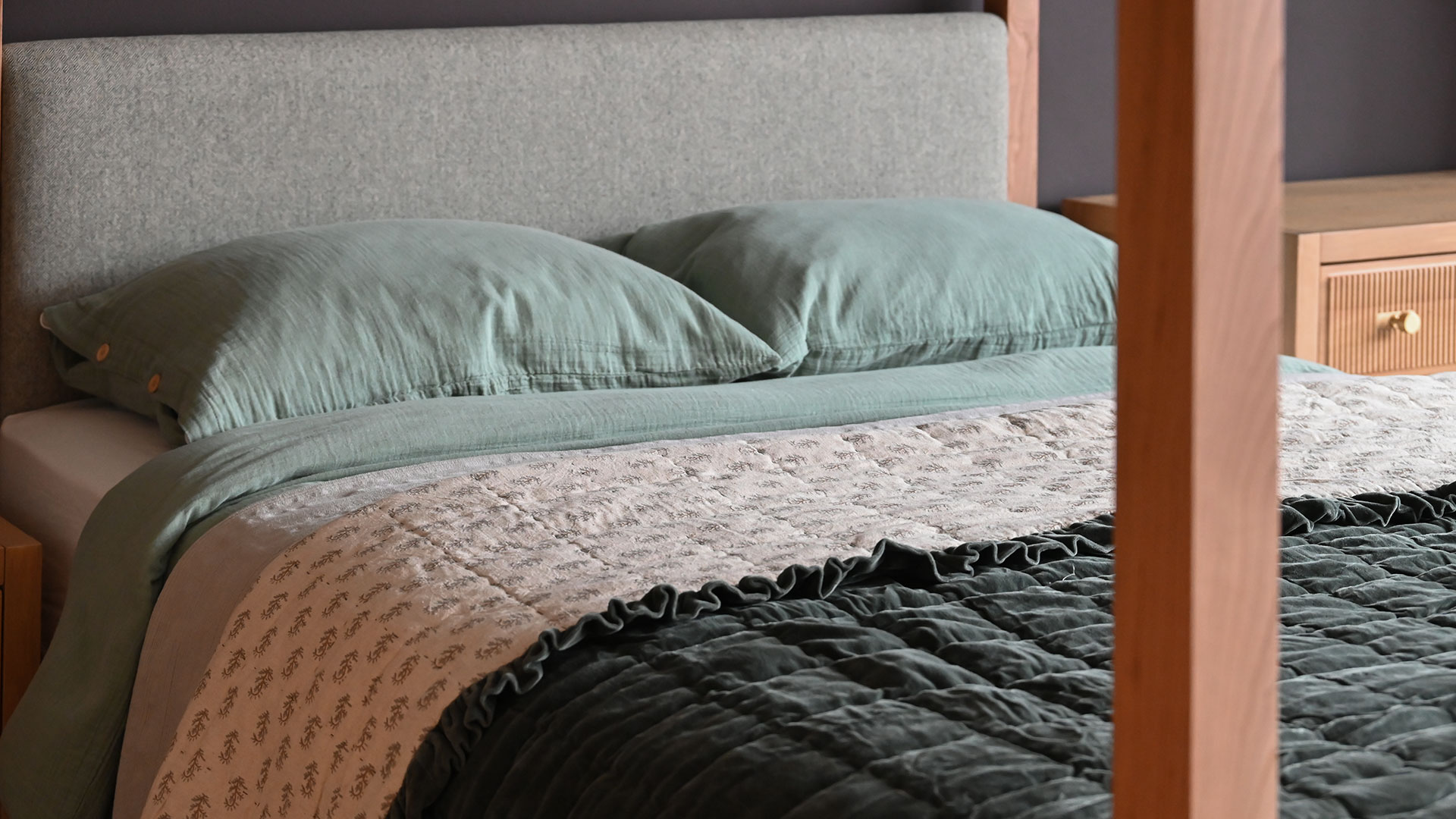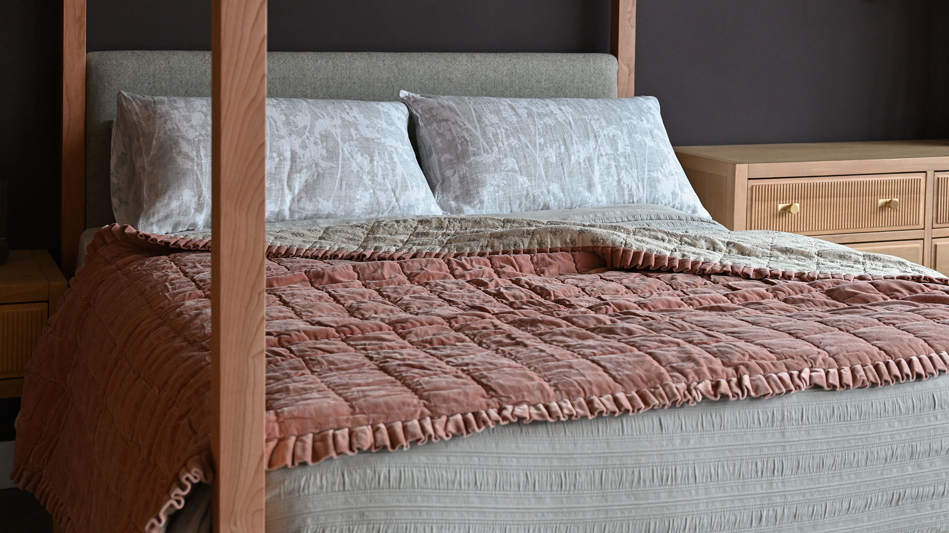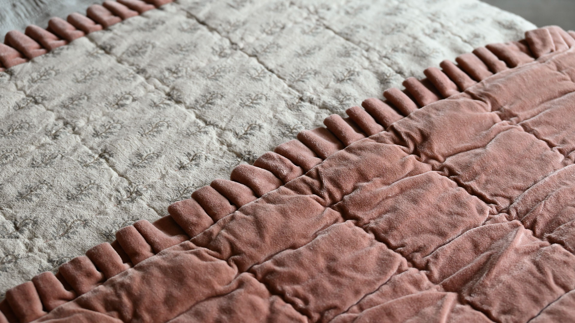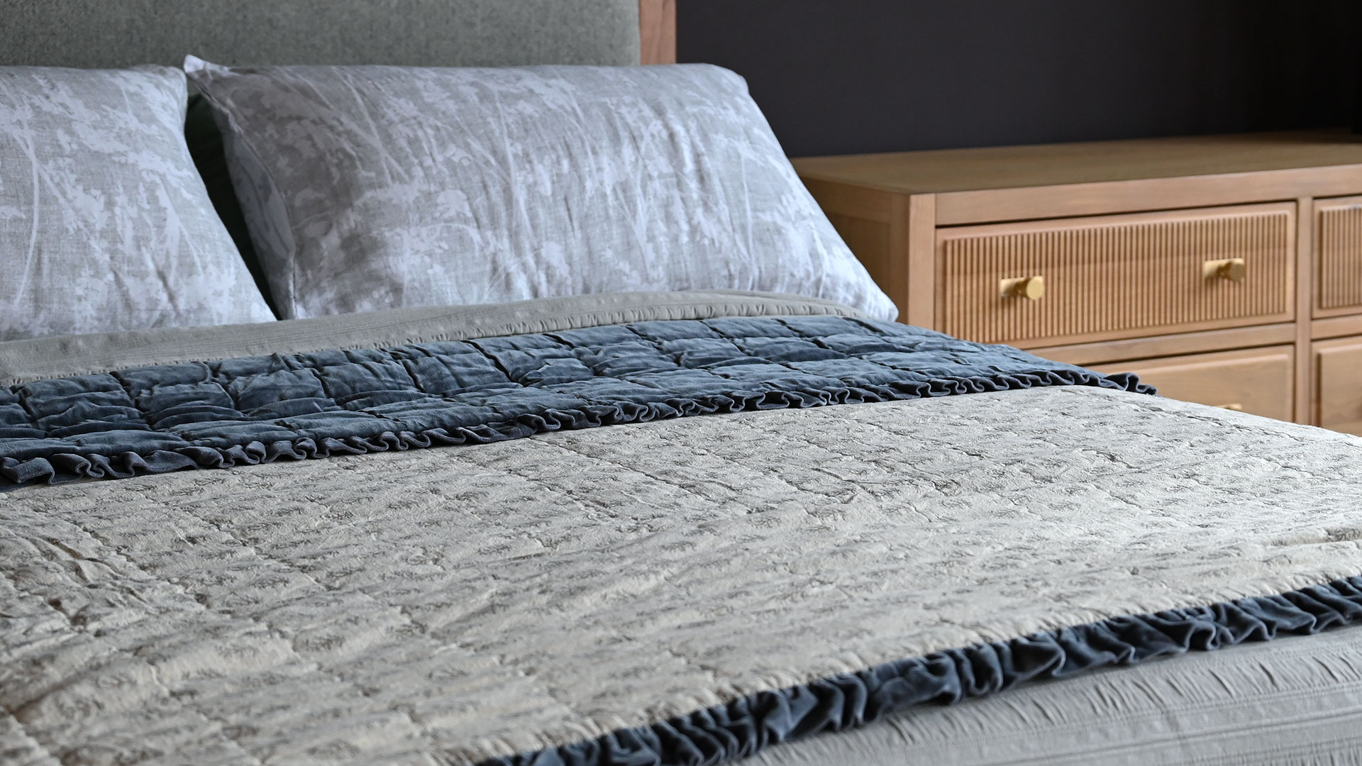Finished with a delicate velvet ruffle border on all four sides, this bedspread adds a refined, feminine touch to any space. Available in olive green, blush pink, indigo blue and forest green. It’s the perfect way to refresh your bedroom with comfort and sophistication.